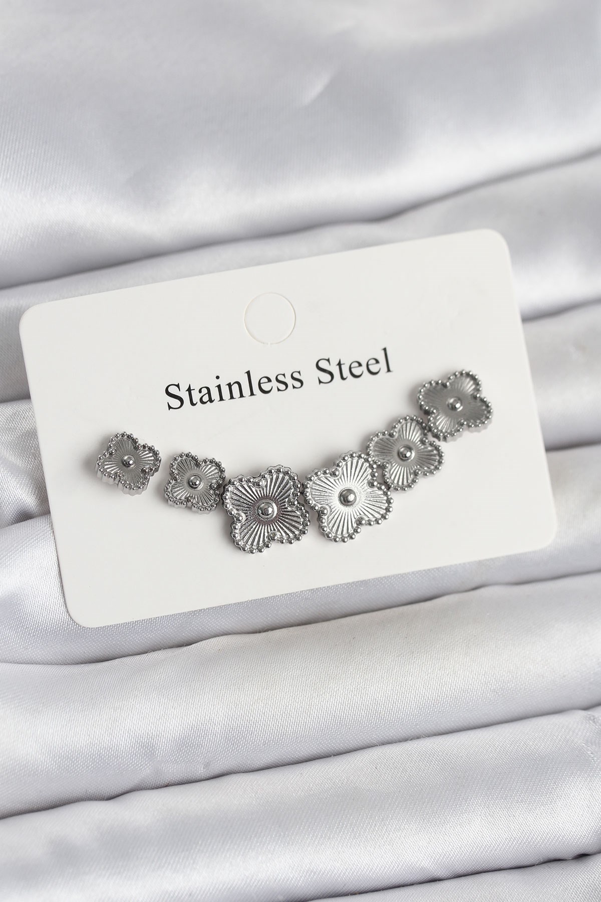 316L Çelik Gümüş Renk Yonca Küpe Seti (BKP11698)
