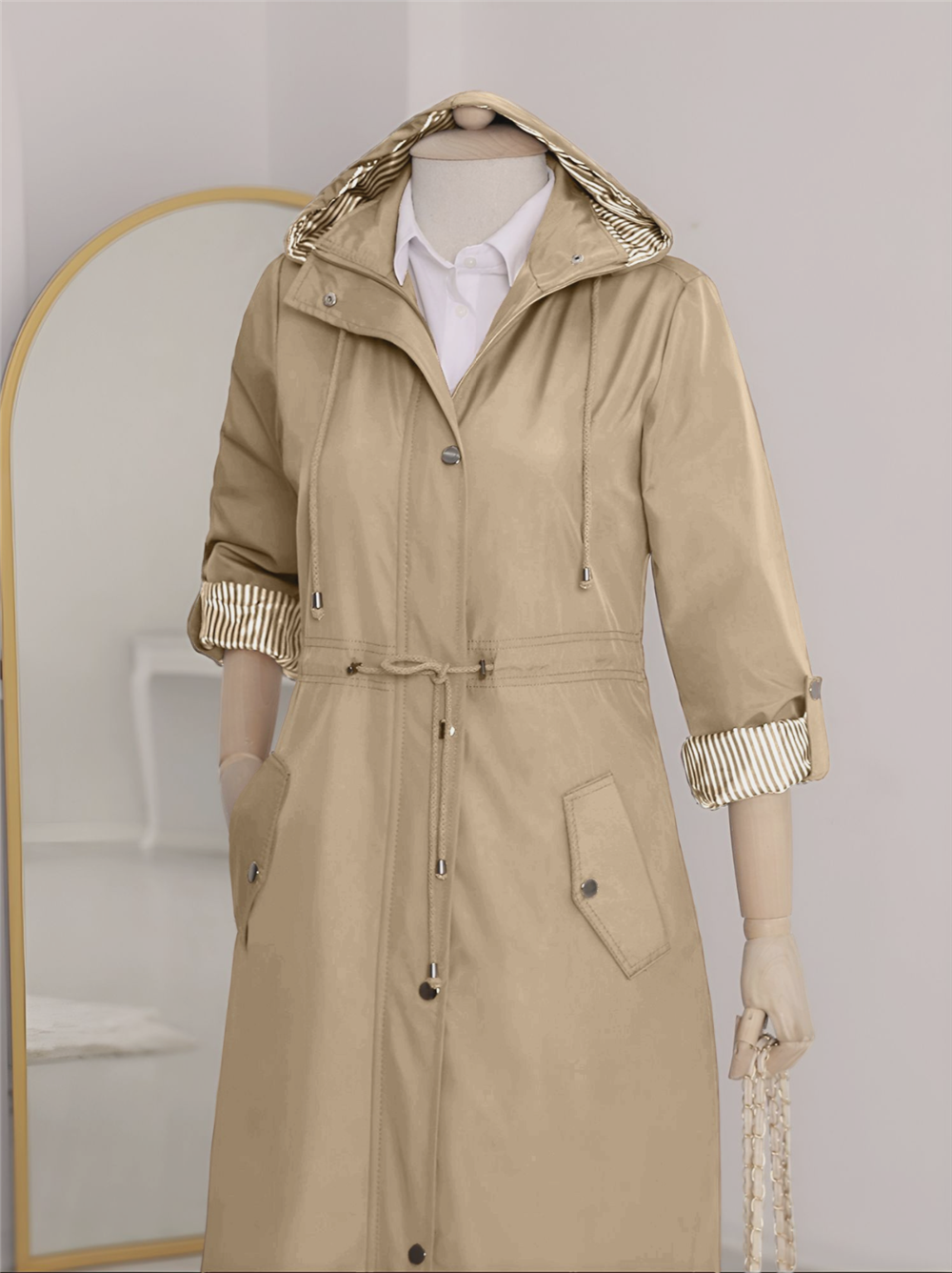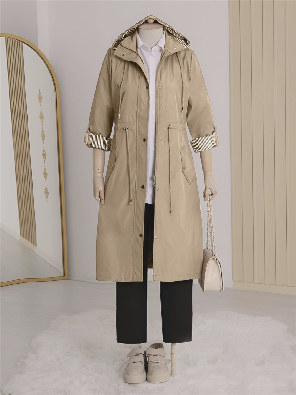 Astarı Çizgili Trençkot -Açık Vizon (148-2129-R51)