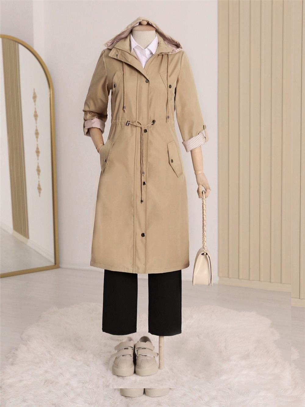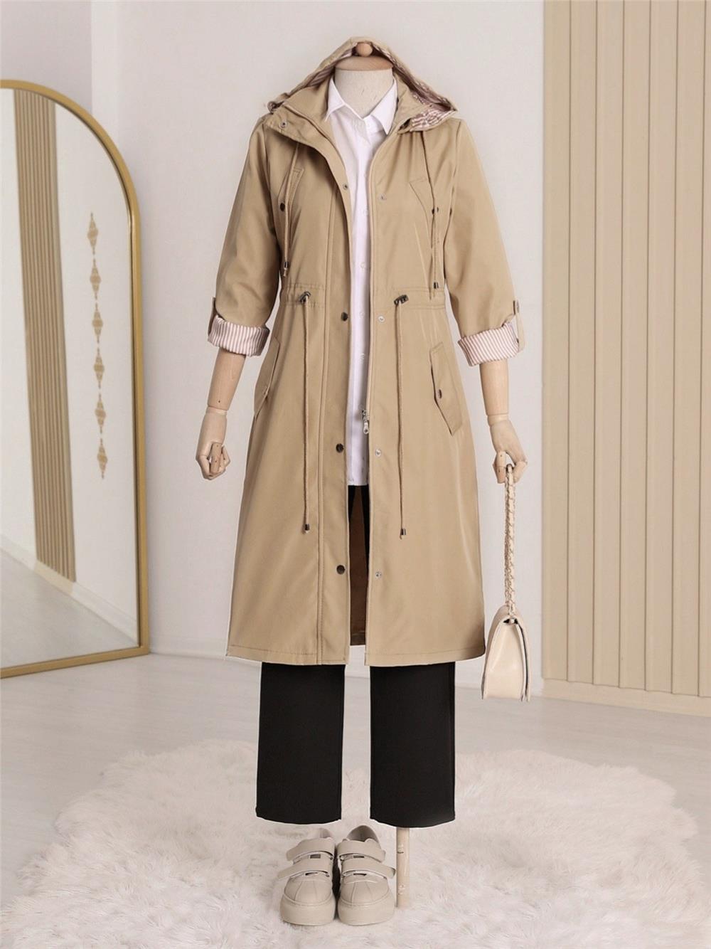 Astarı Çizgili Trençkot -Açık Vizon (148-2181-R51)