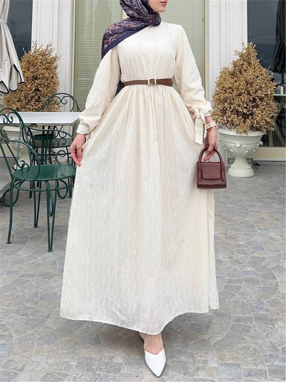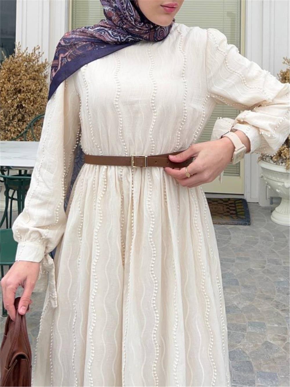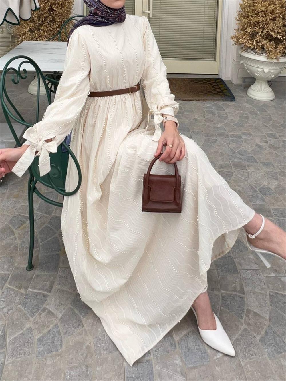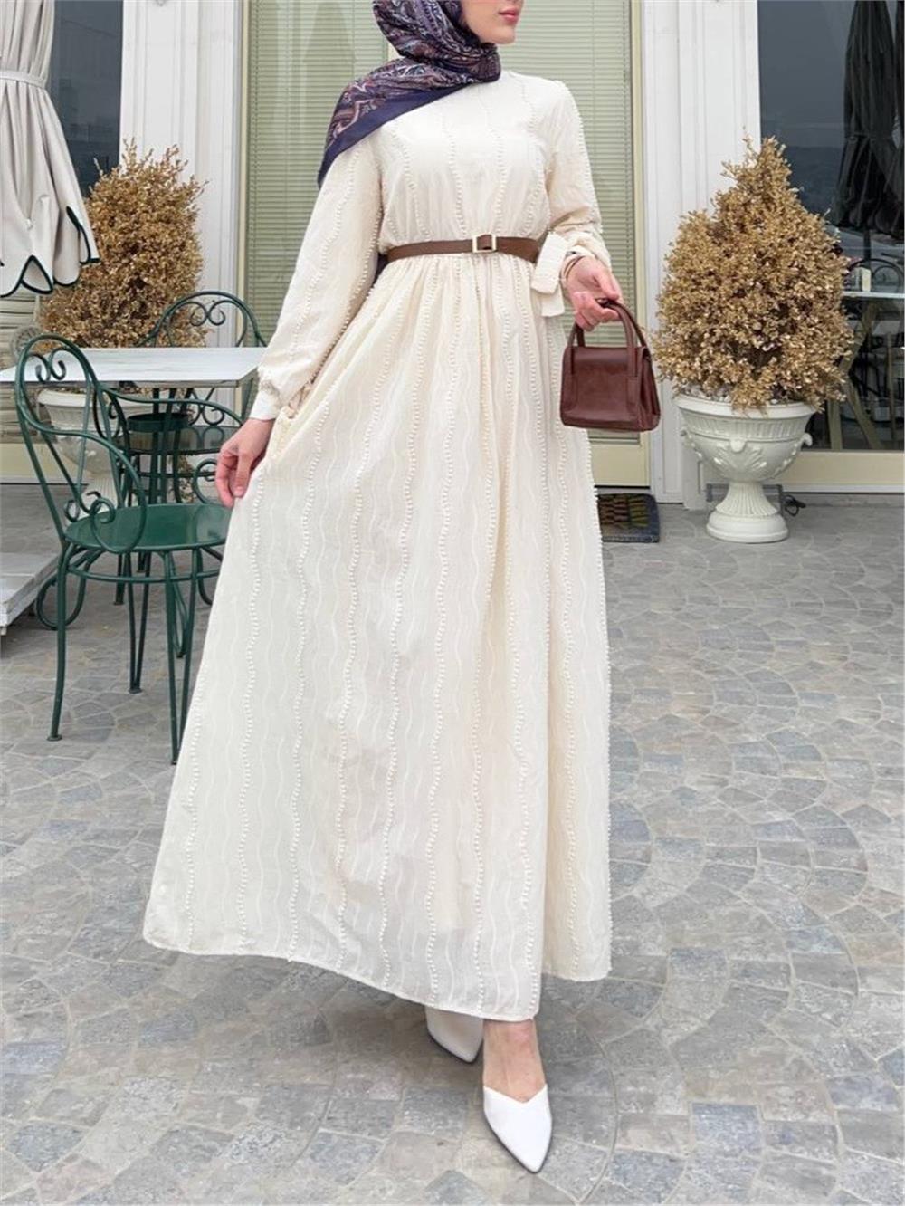 Belden lastikli Maşeti Bağcıklı Elbise -Bej (144-1008-R56)