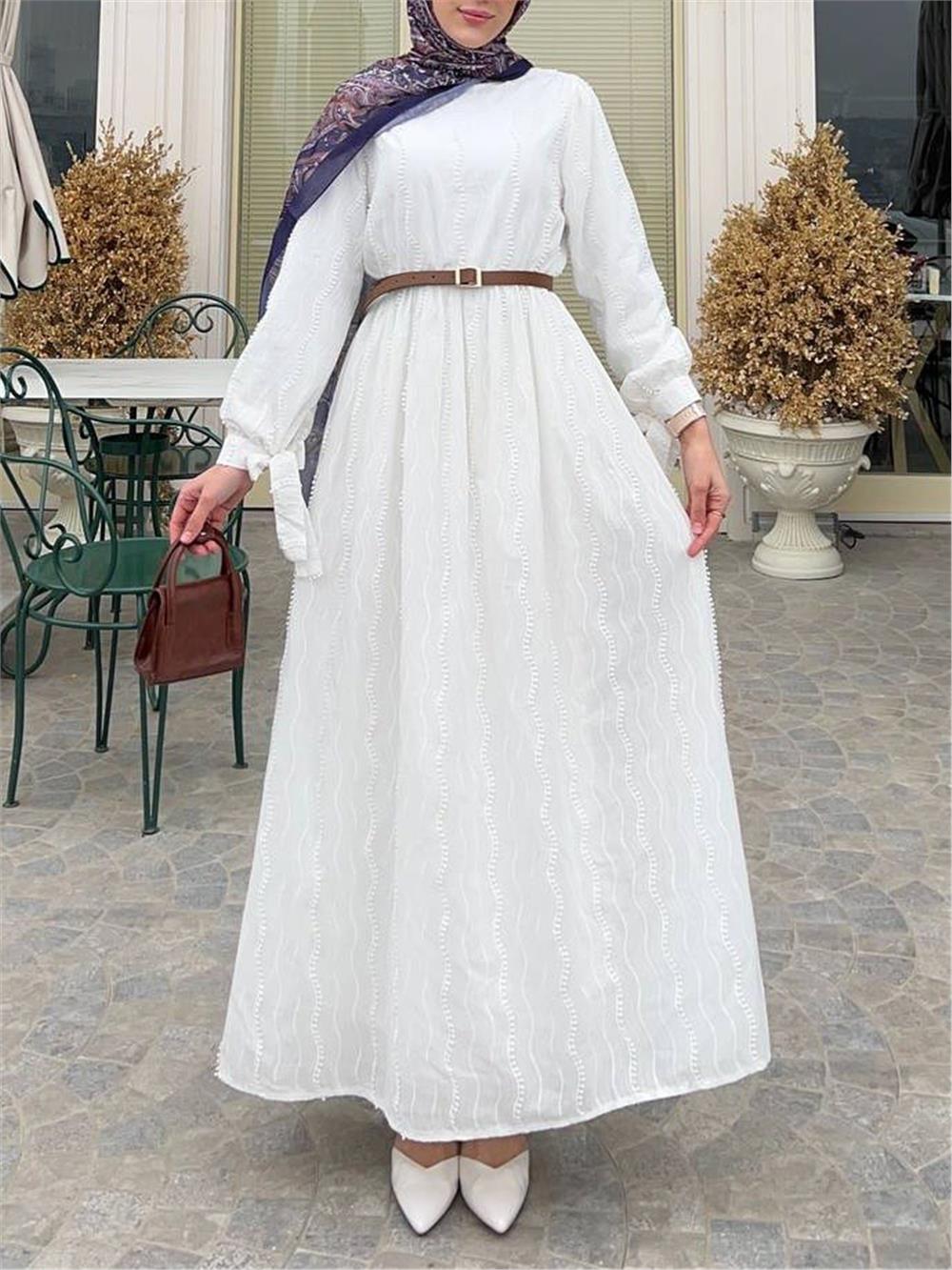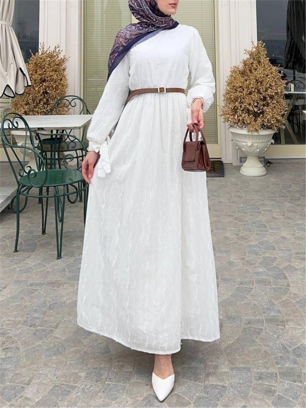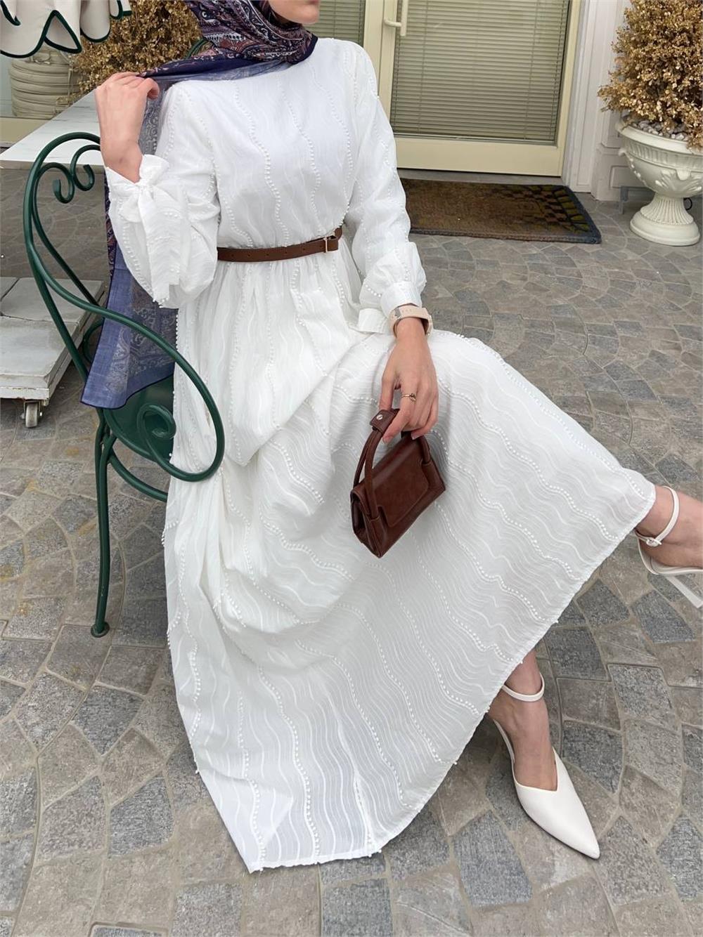 Belden lastikli Maşeti Bağcıklı Elbise -Beyaz (144-1008-R02)