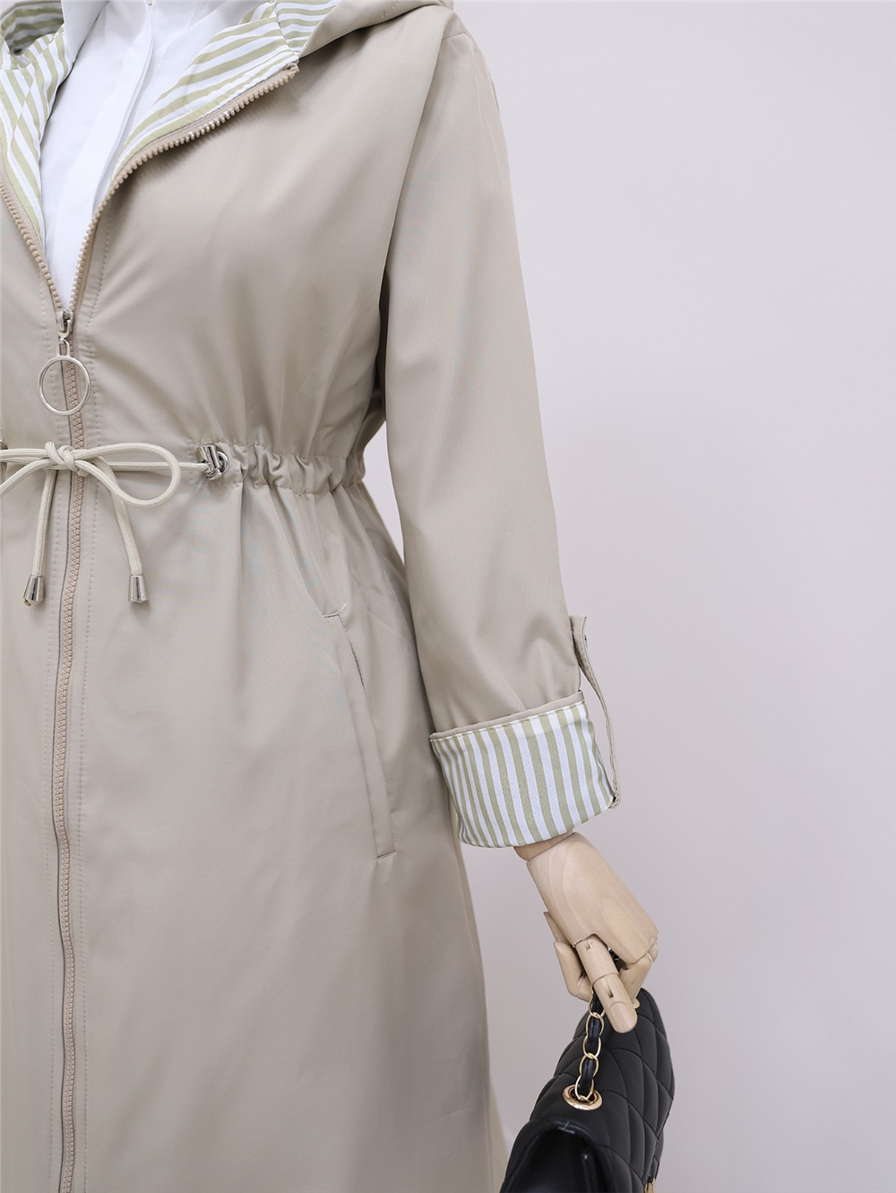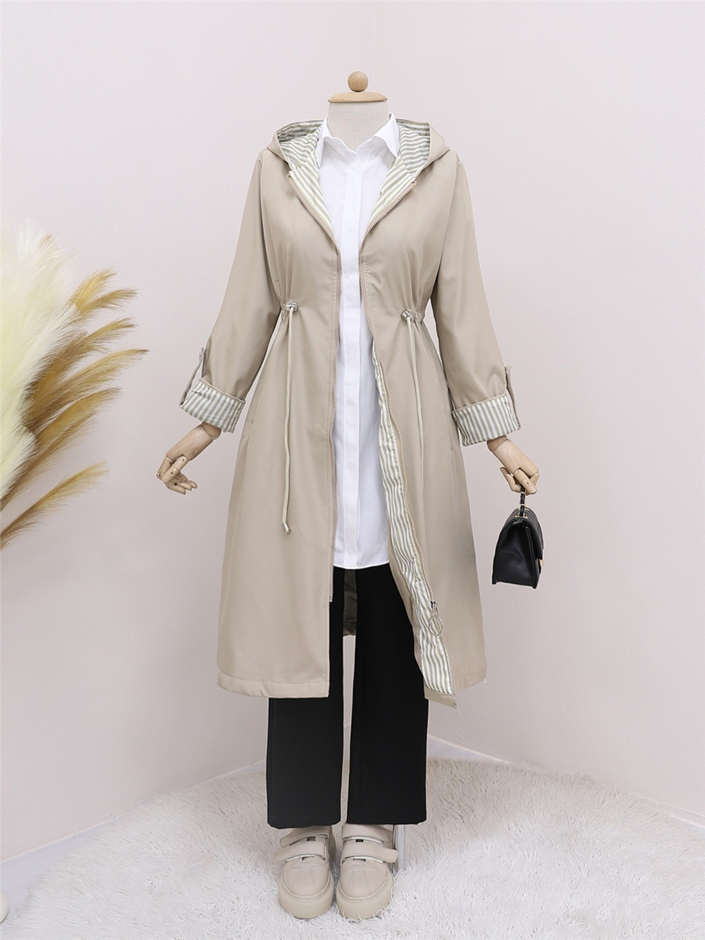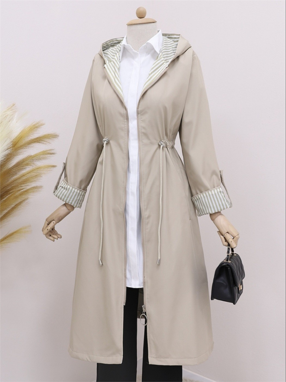 Our hooded, 2-pocket, gathered waist, folded sleeve trench coat model is the most trendy of the new season. It has taken its place among the models.