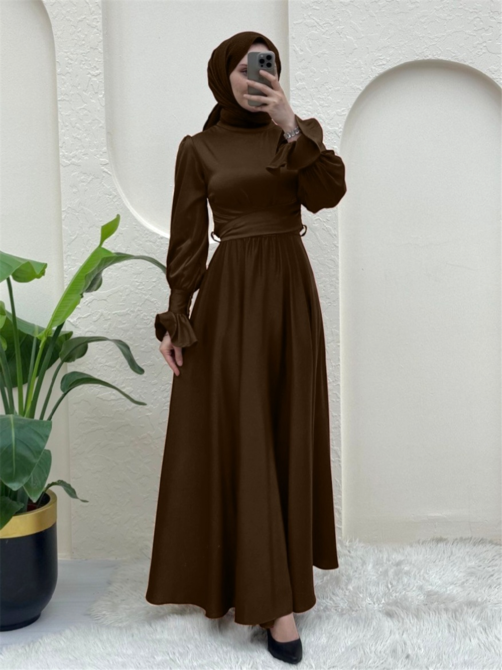فستان سهرة من الساتان مع خصر متقاطع - أسمر ضارب للصفرة (386-5983-R12)