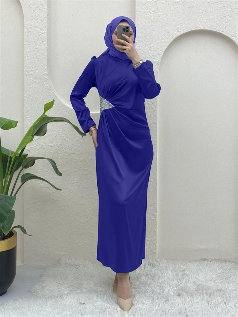 فستان سهرة من الساتان مع تفاصيل حجرية عند الخصر ومجمع من الأمام - ساكس (386-5940-R10)