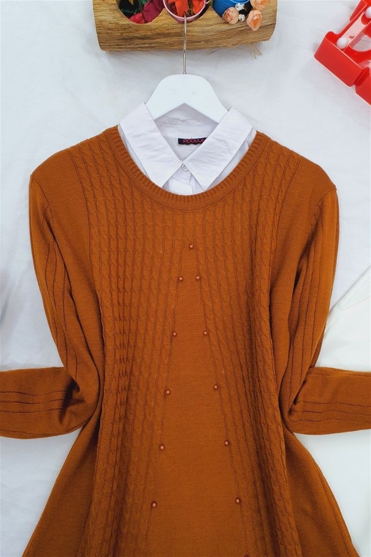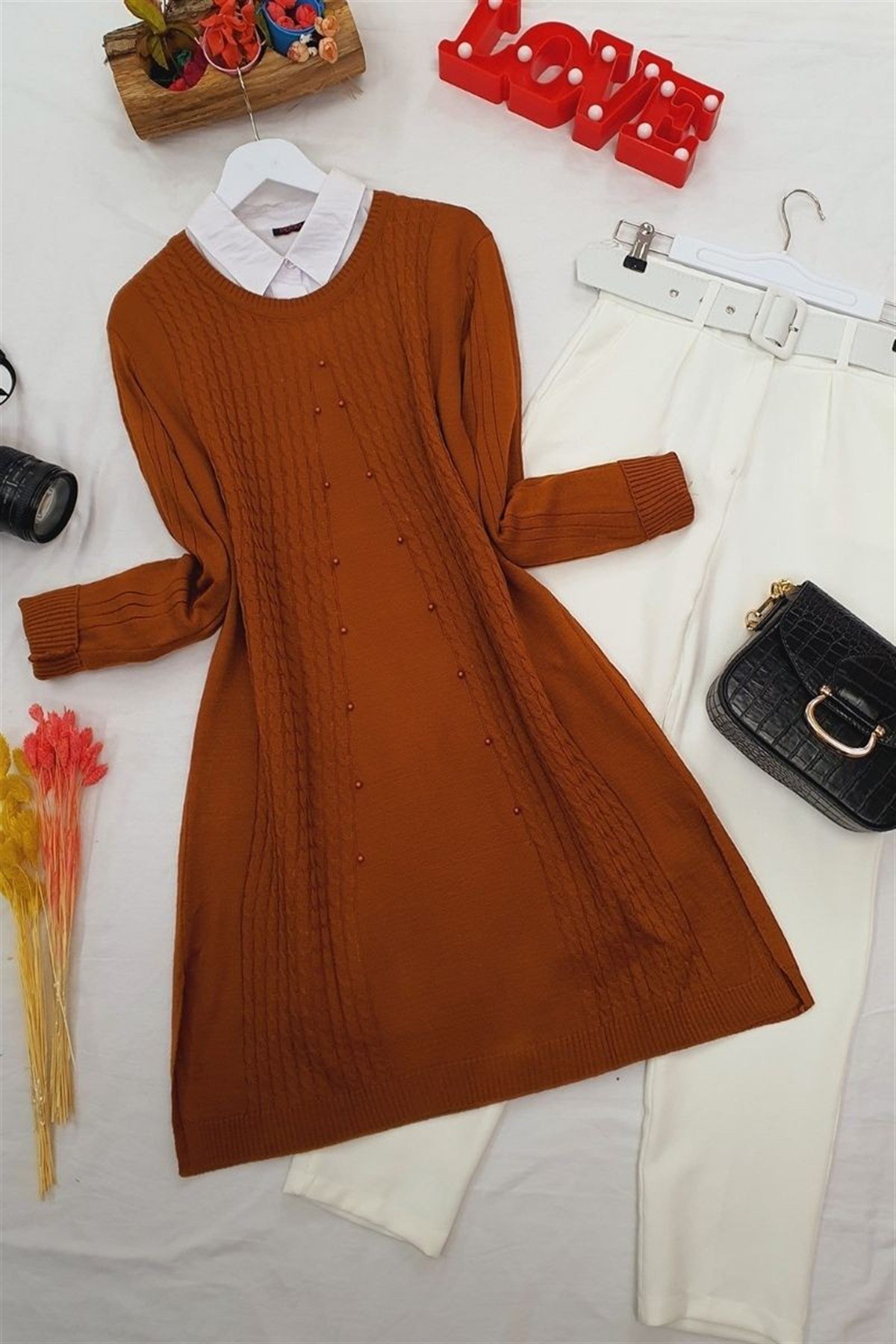 Bisiklet Yaka İnci Detaylı Triko Tunik -Taba (280-531-R12)