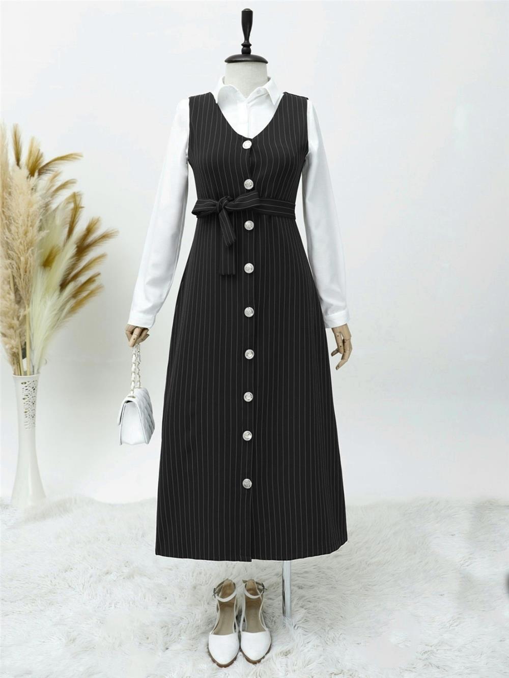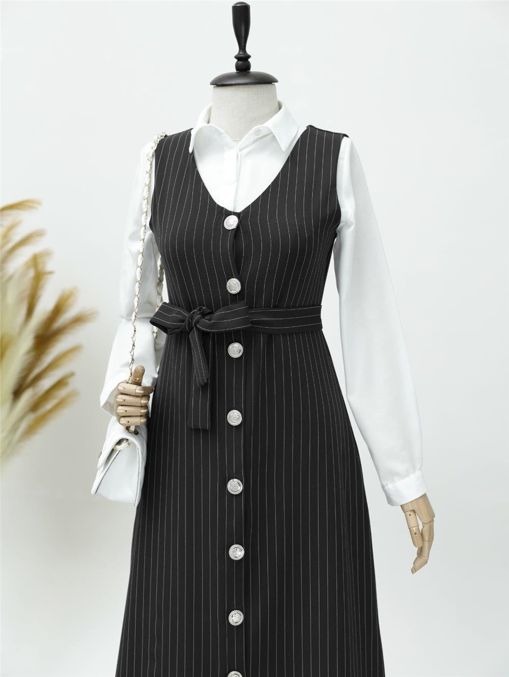 جيليه مخطط بأزرار وحزام - أسود (111-61094-R01)