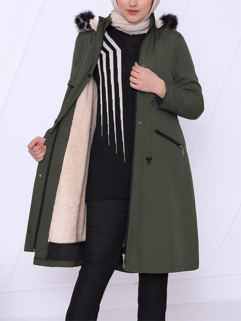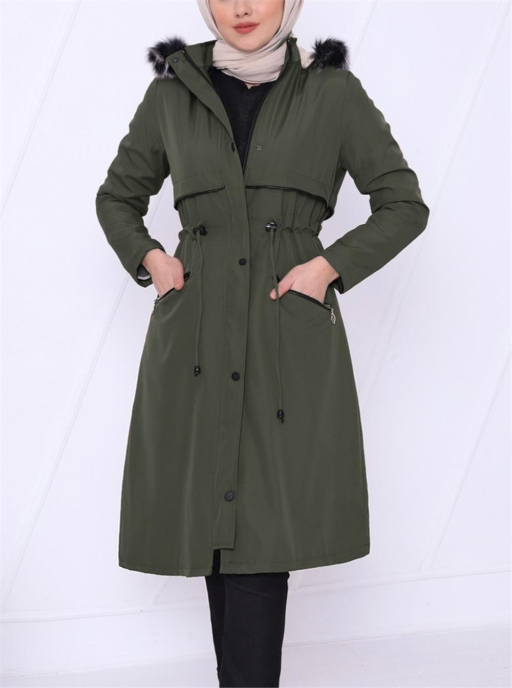 Çıkma Kapşonlu Cebi Fermuarlı Kışlık Haki Bondit Kaban