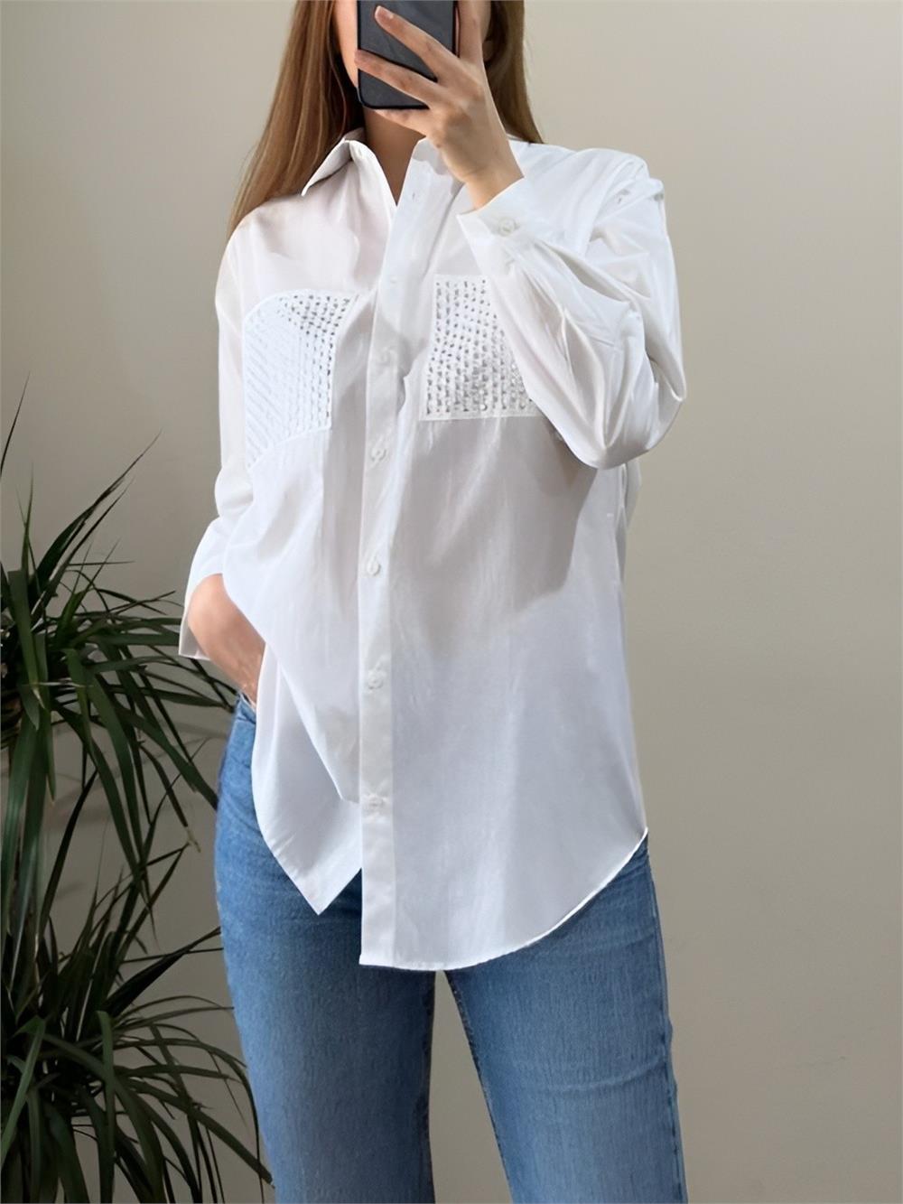 قميص بوبلين بجيوب حجرية - أبيض (346-2004-R02)