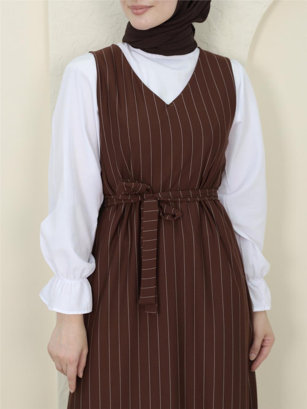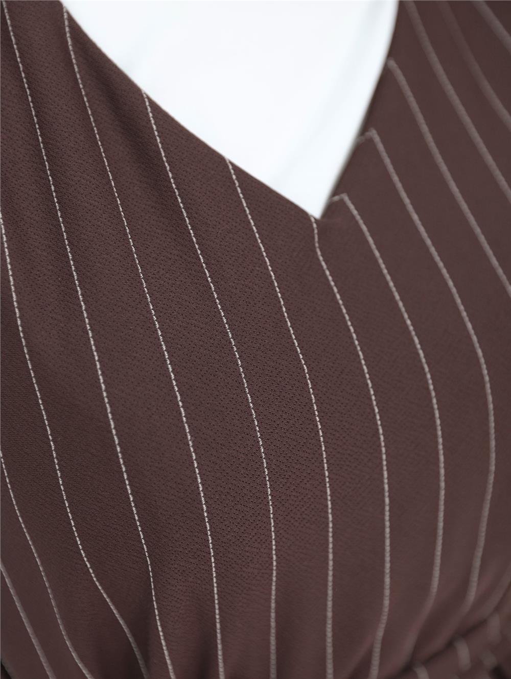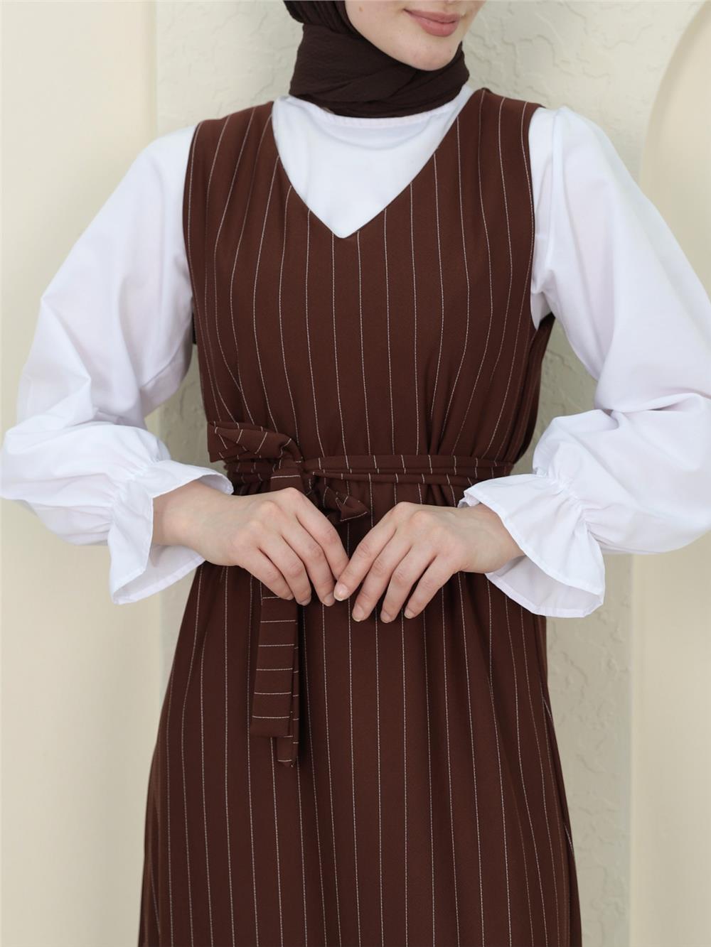 طقم جيليه قميص مخطط الخصر بحزام - بني (349-5063-R15)