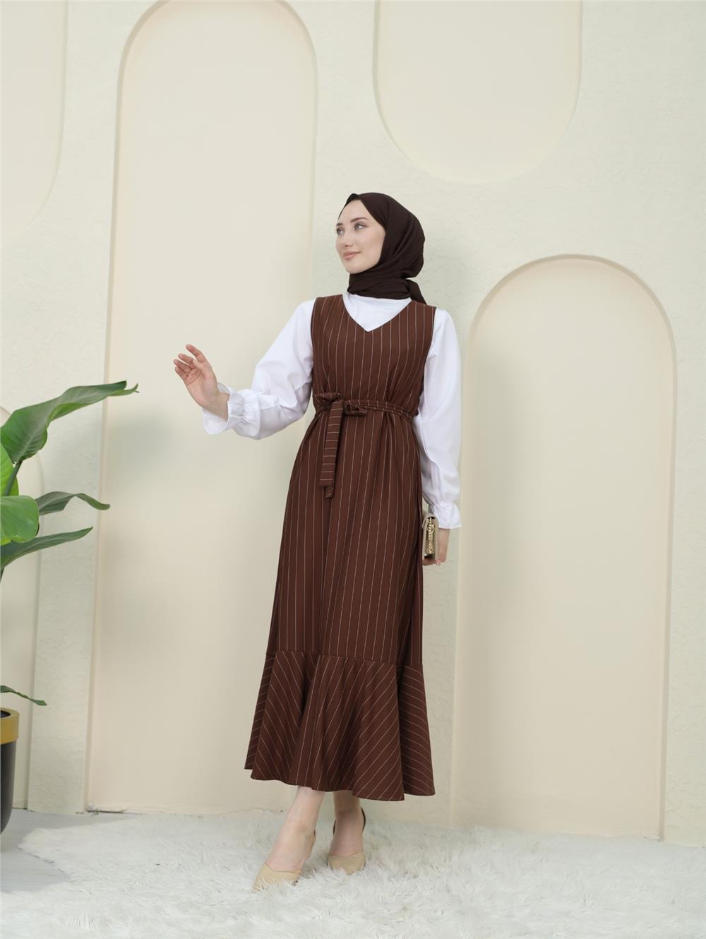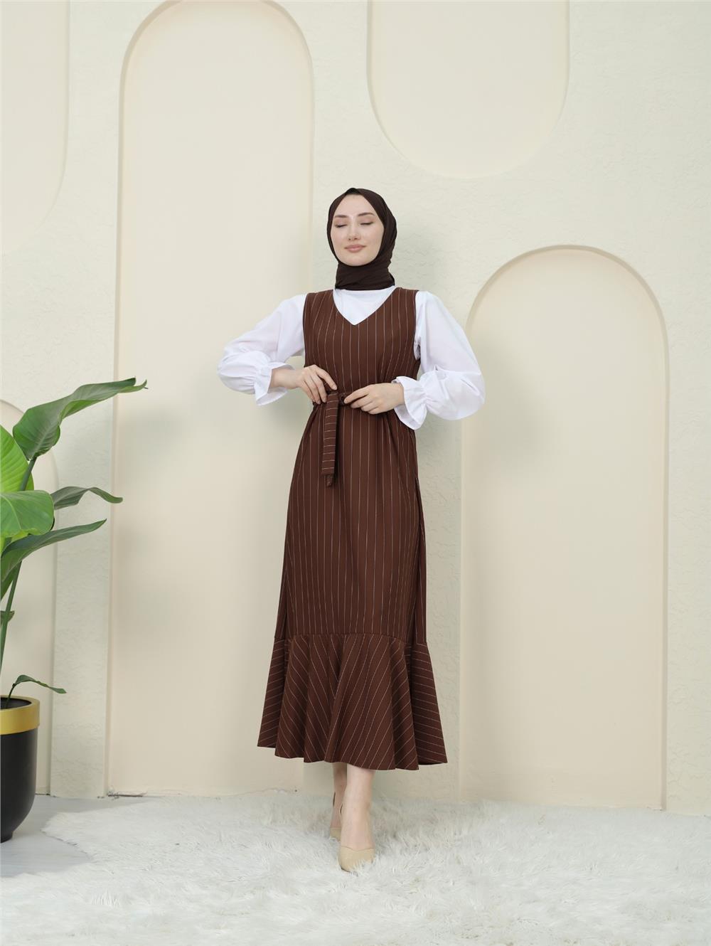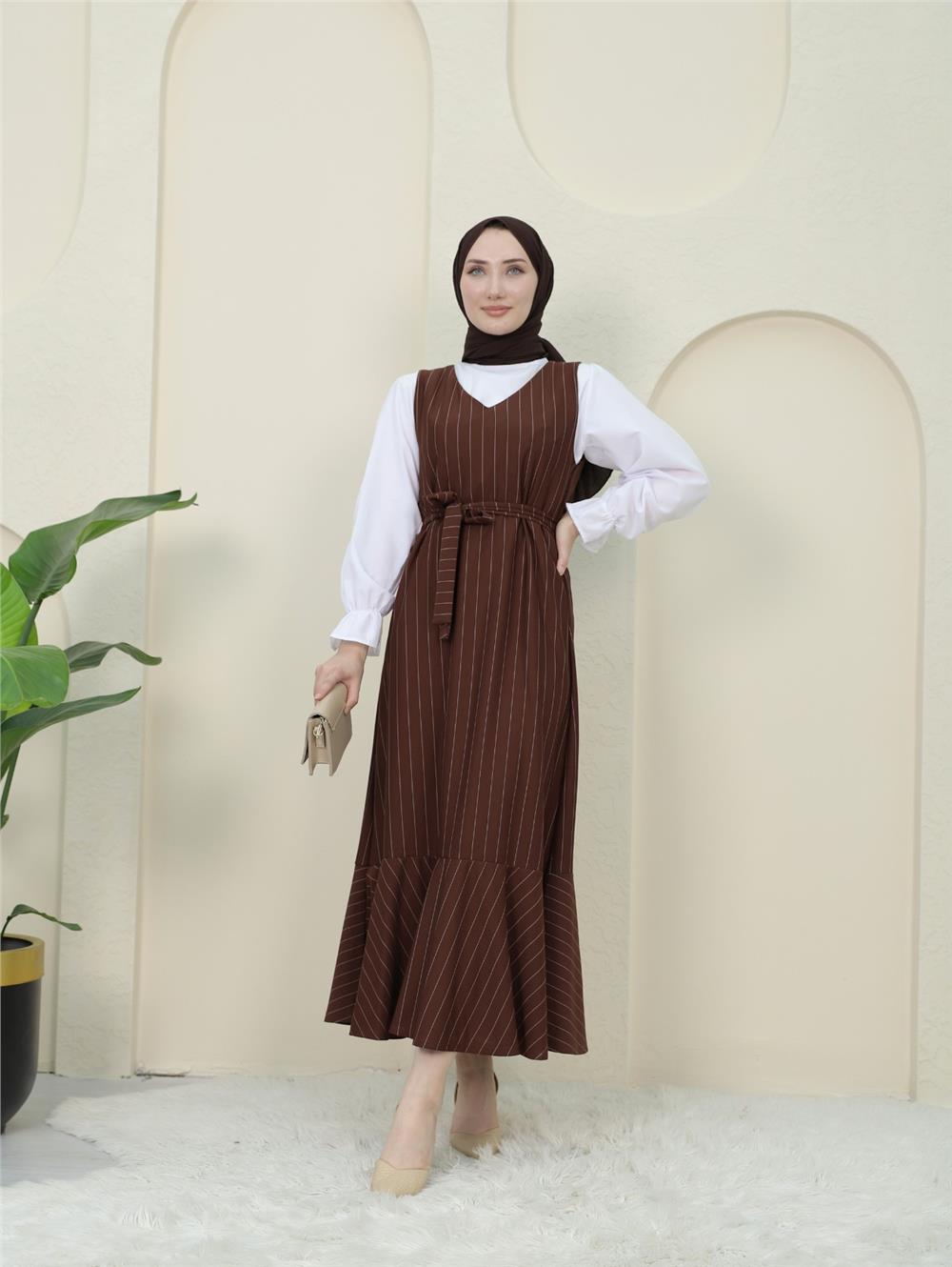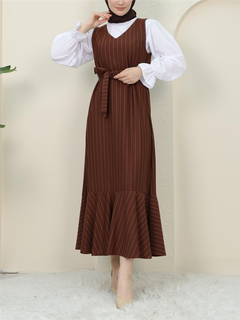طقم جيليه قميص مخطط الخصر بحزام - بني (349-5063-R15)