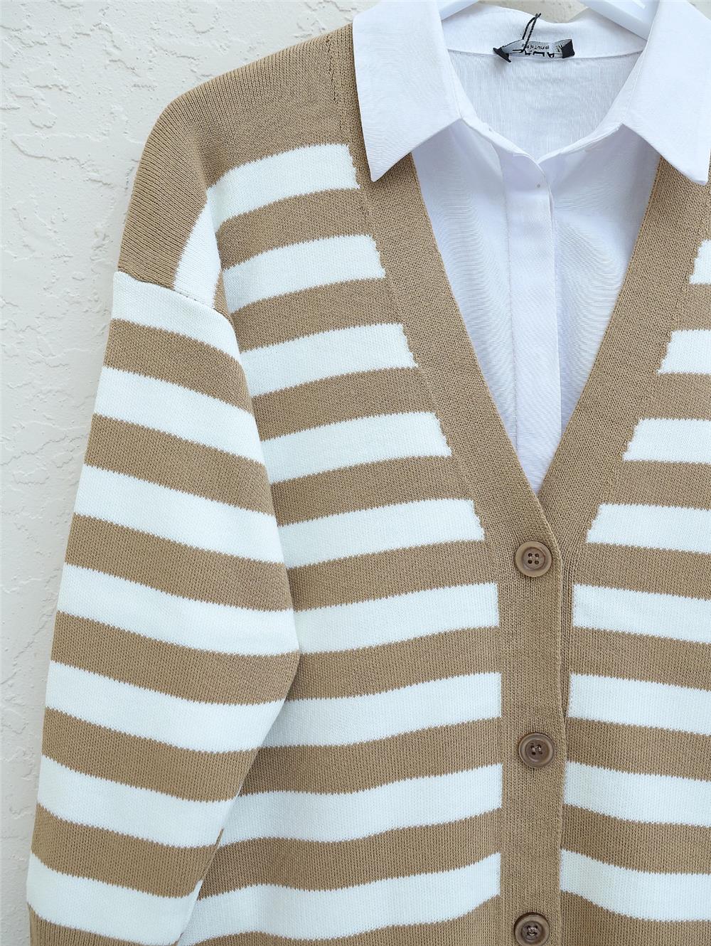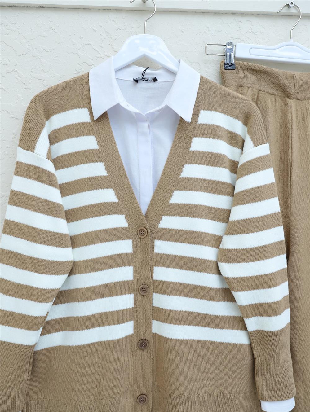 طقم ملابس تريكو مخططة بأزرار - أسمر ضارب للصفرة (384-1030-R12)