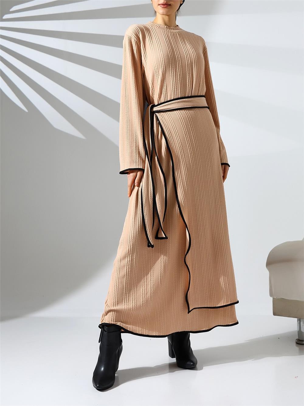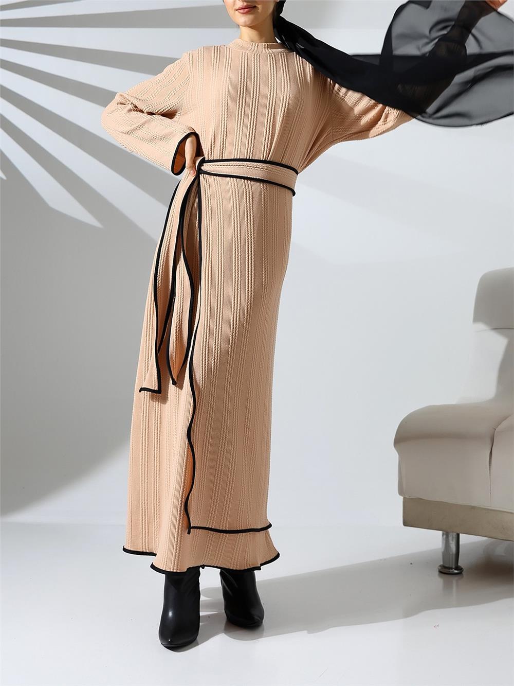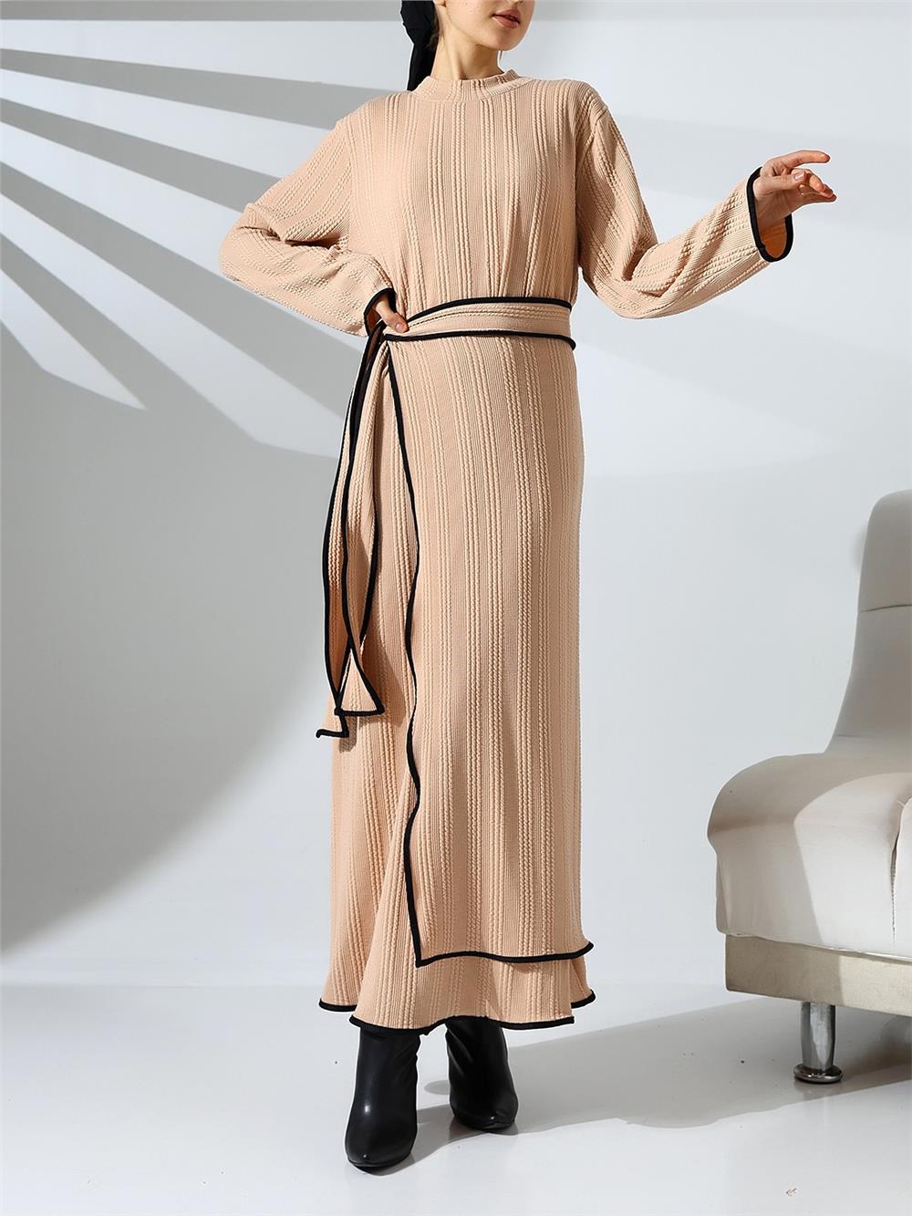 Dik Yaka Örme Krep Beli Bağlamalı İki Parçalı Elbise -Bej (398-6032-R56)