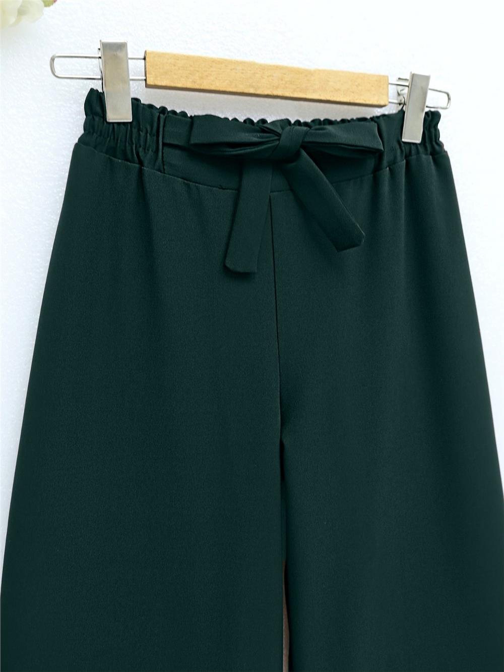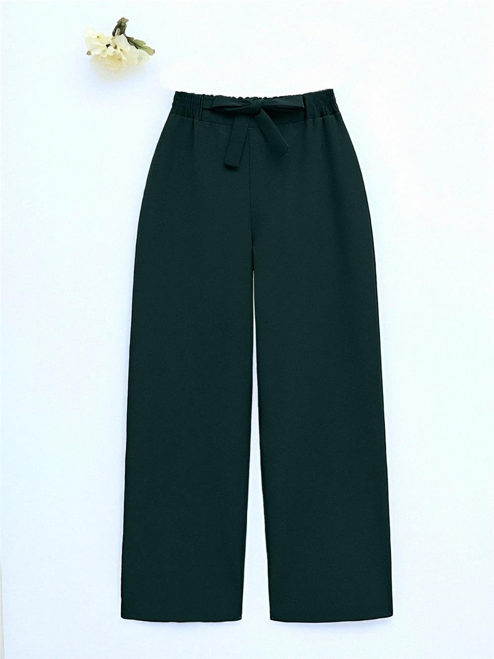بنطلون واسع الساق من القماش مزدوج الخصر وحزام - زمردي (400-156-R17)
