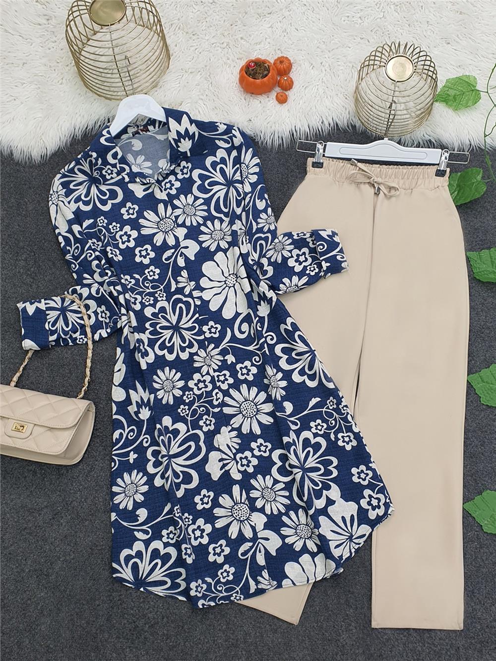 Düğmeli Desenli Viskon Tunik -İndigo (199-201-R21)