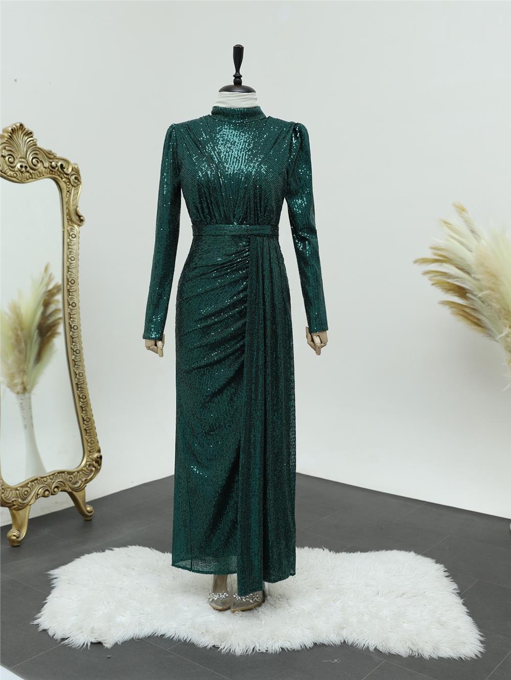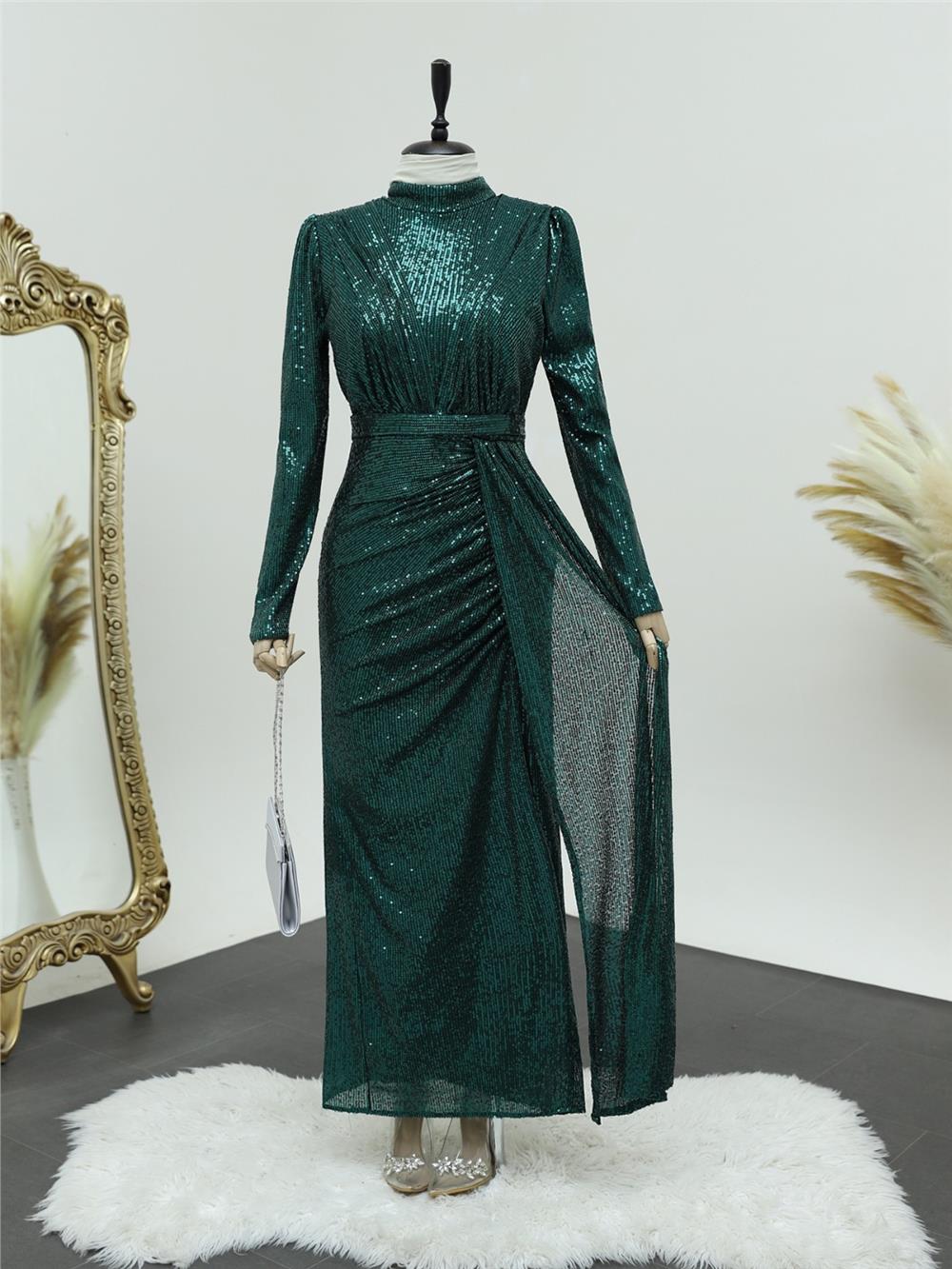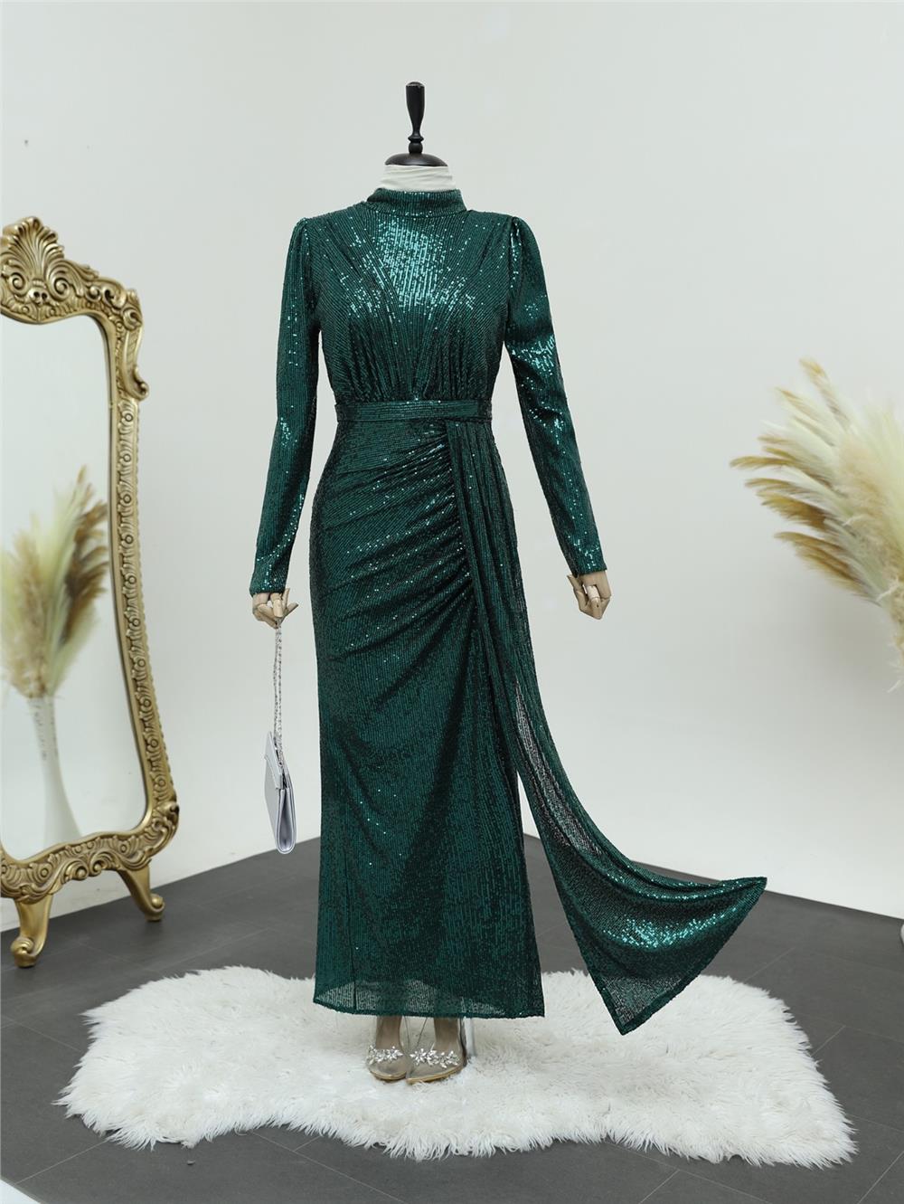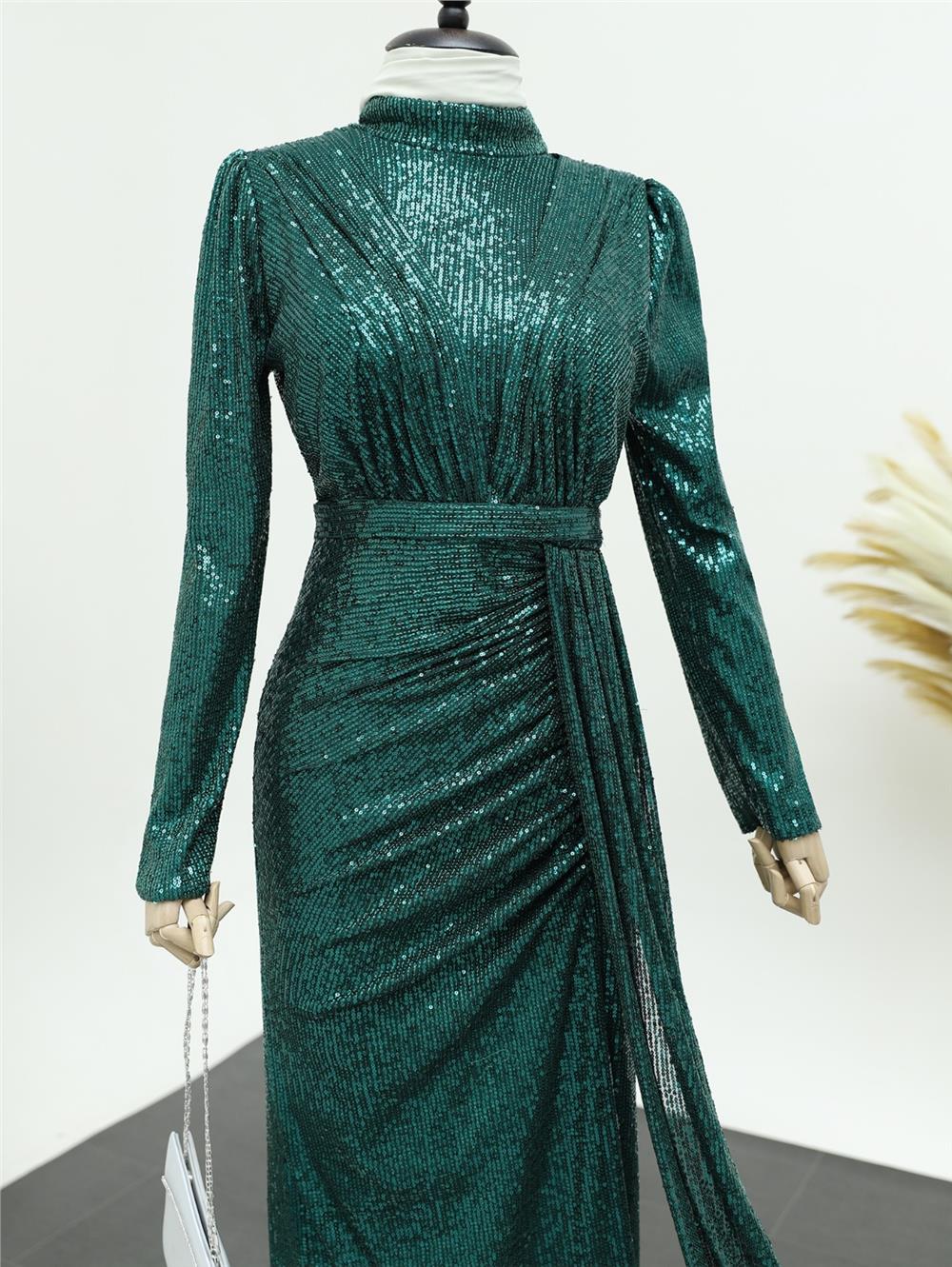 فستان سهرة مزين بالترتر مع تنورة مجمعة، ياقة رائعة - زمرد (316-4493-R17)