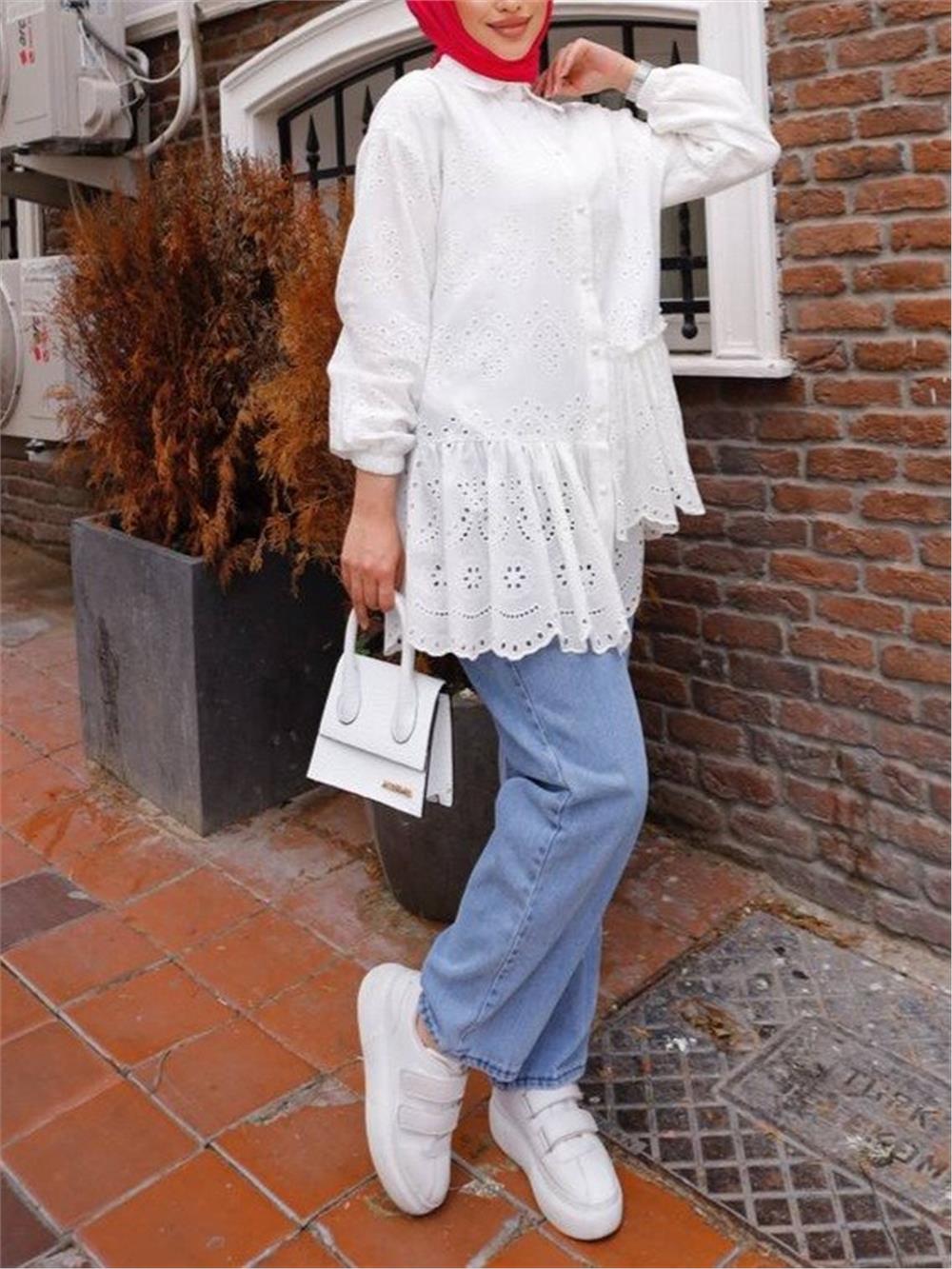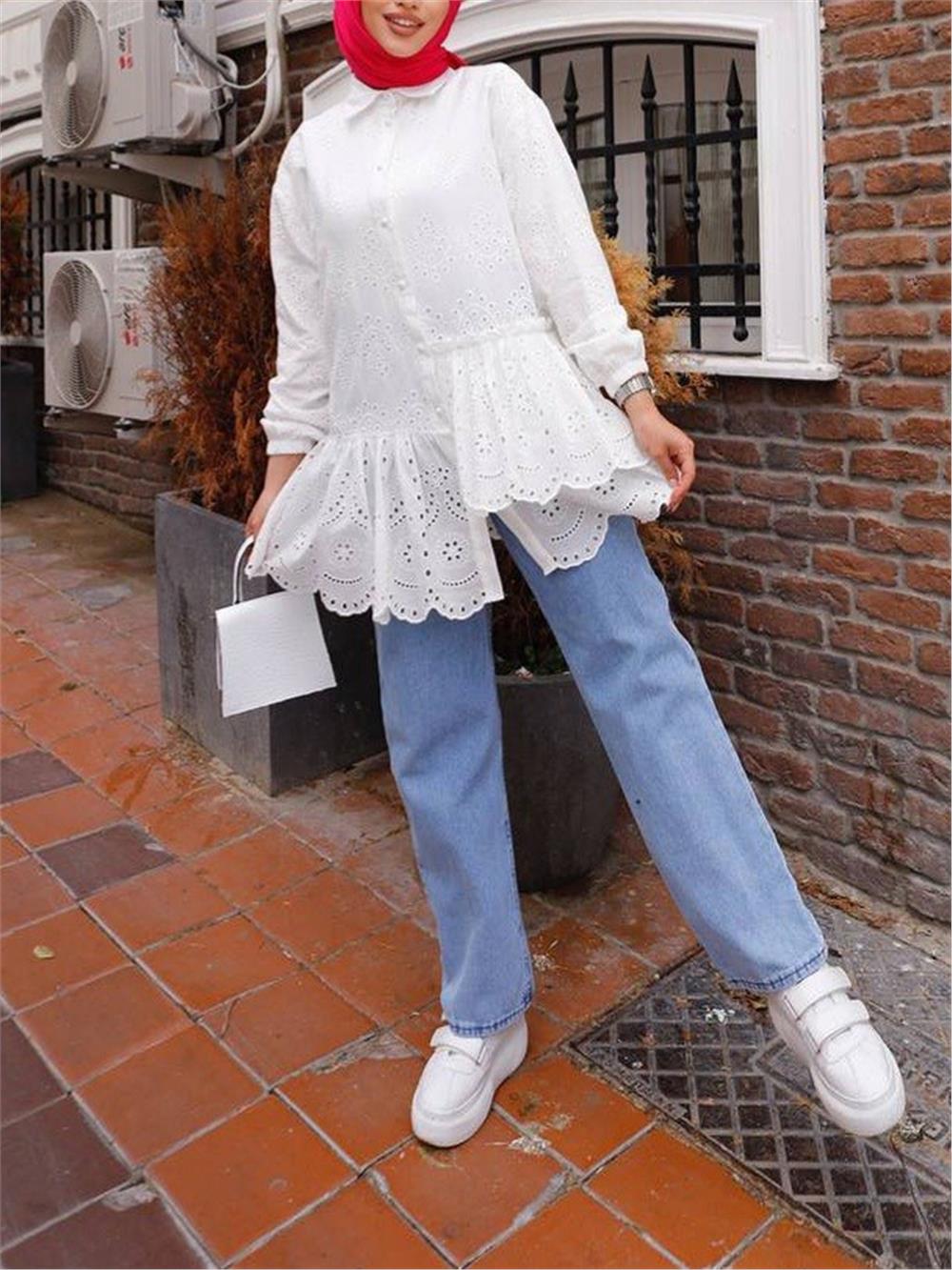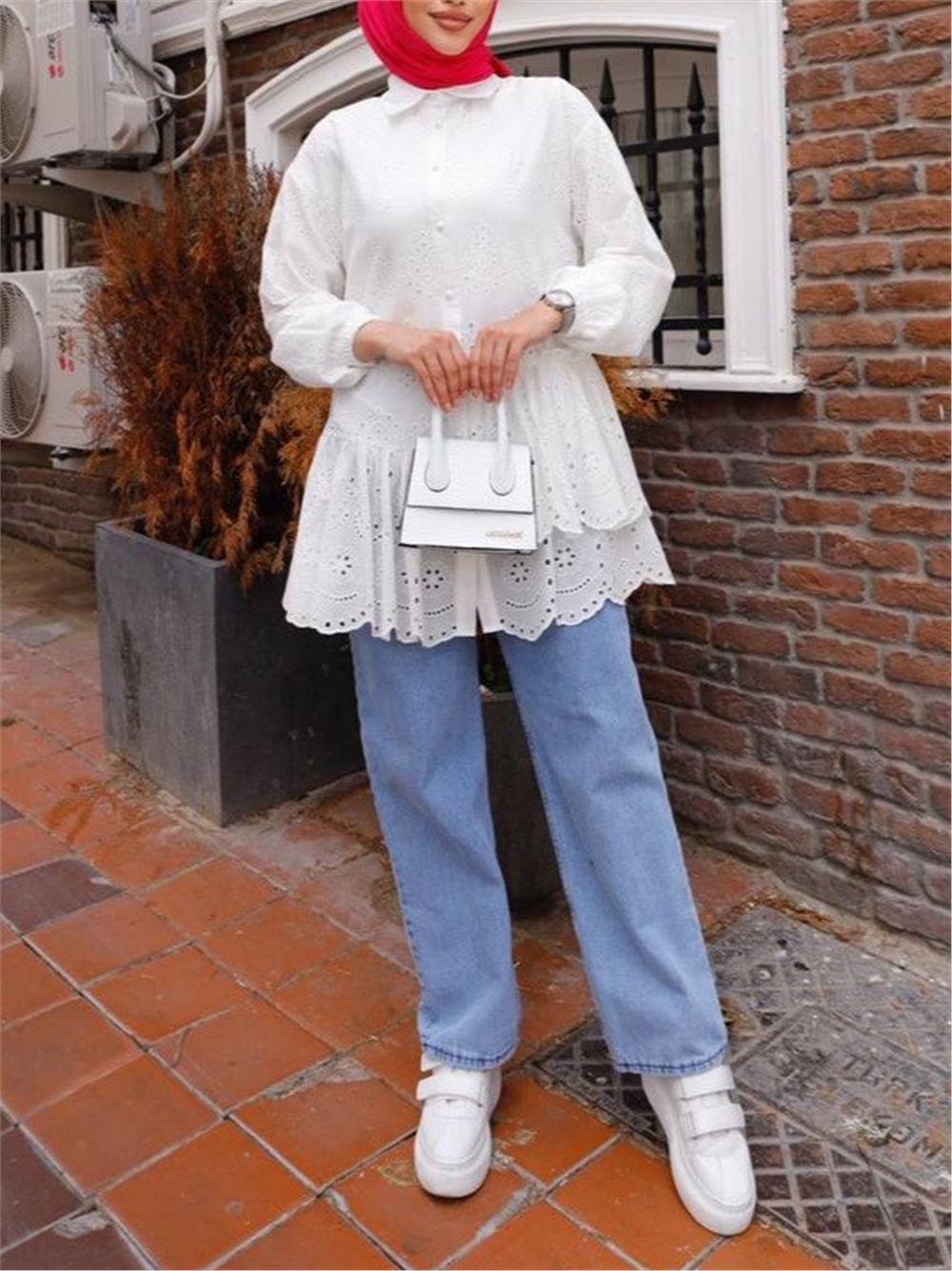Fırfır Ve Fisto Detaylı İnci Düğmeli Gömlek -Beyaz (144-1376-R02)