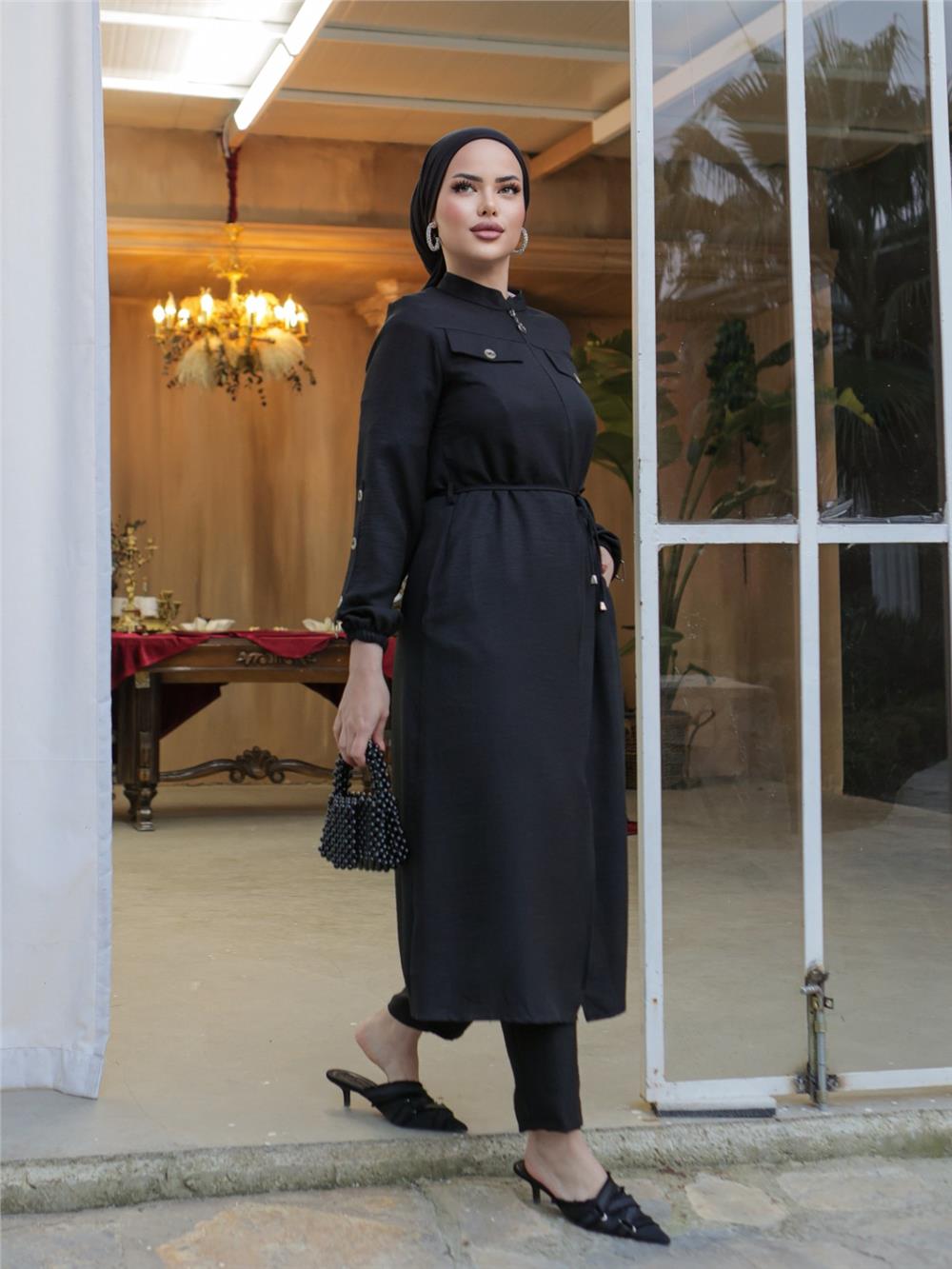 قبعة كتان كاملة الطول بسحاب مع جيب بغطاء - أسود (186-645-R01)