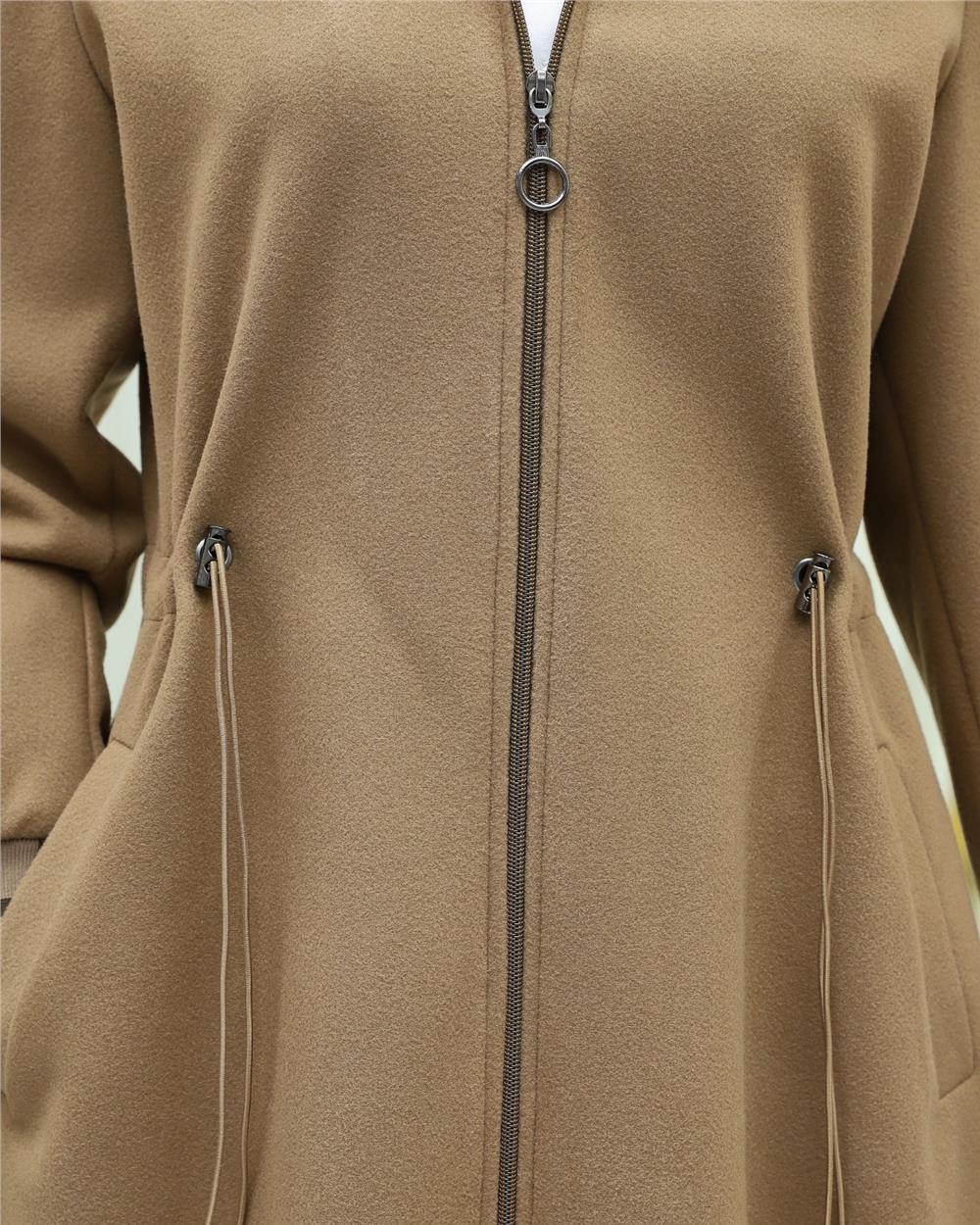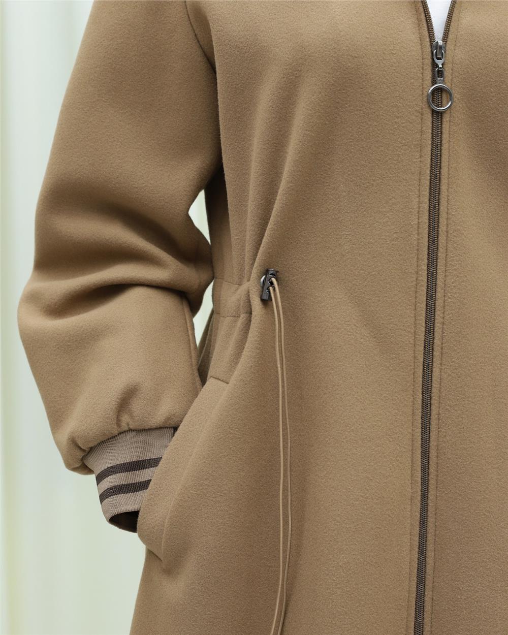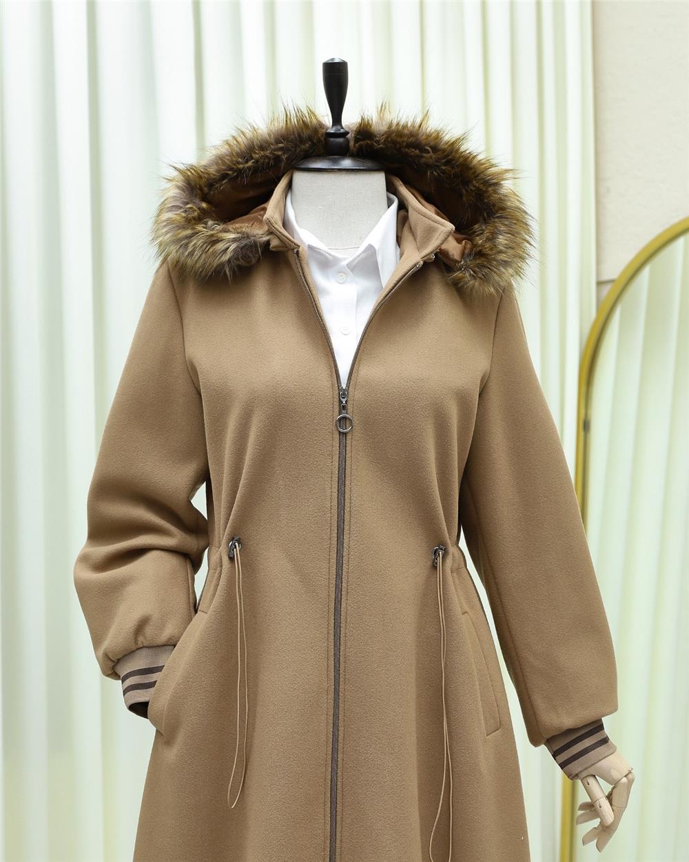 Kapşonlu Beli Lastikli Cepli Kaşe Kaban -Taba (197-9503-R12)