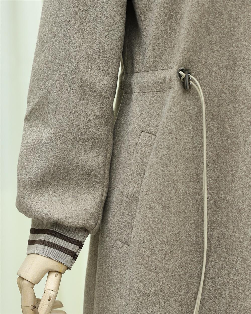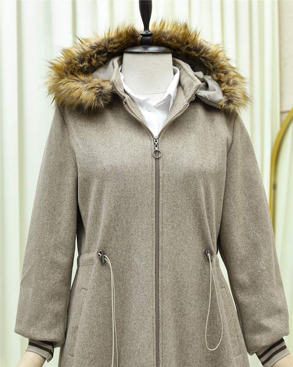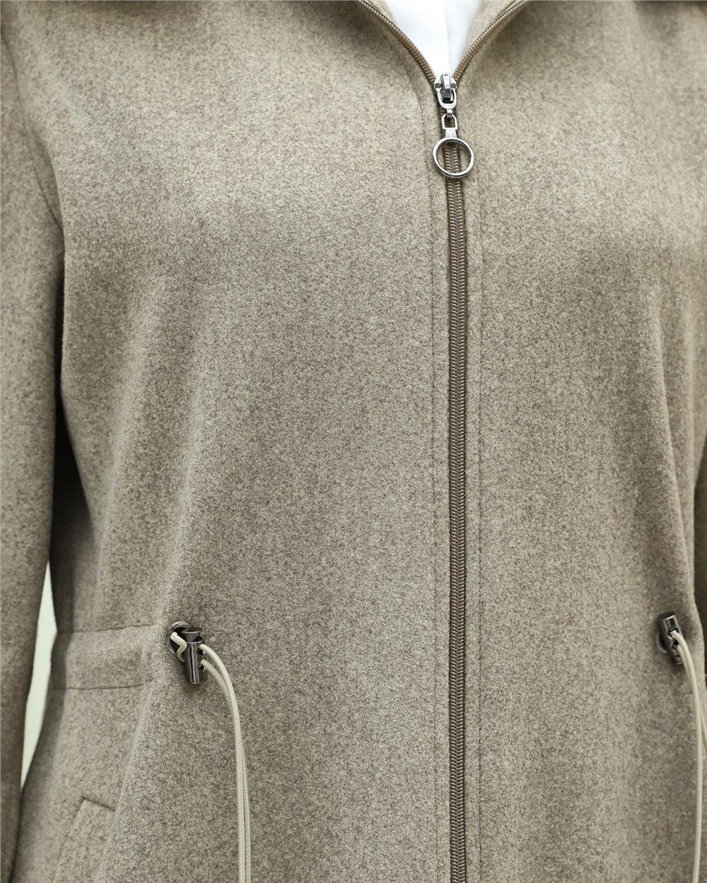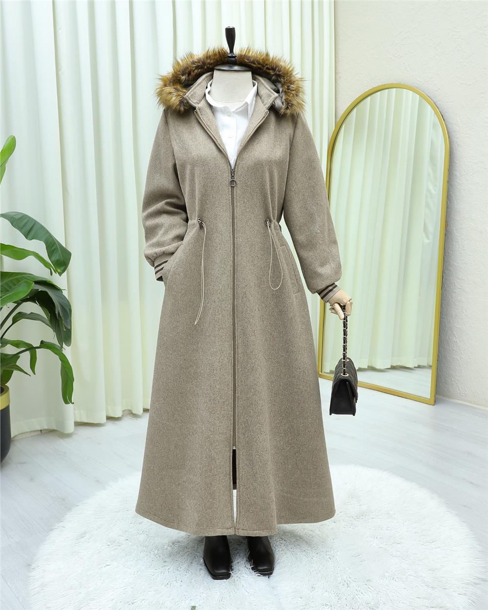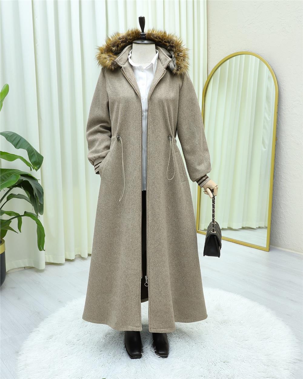 Kapşonlu Beli Lastikli Cepli Kaşe Kaban -Taş (197-9503-R43)