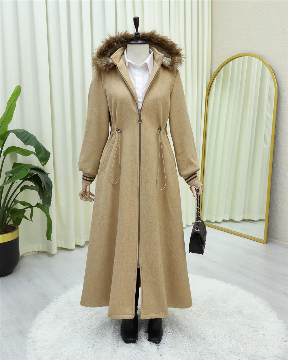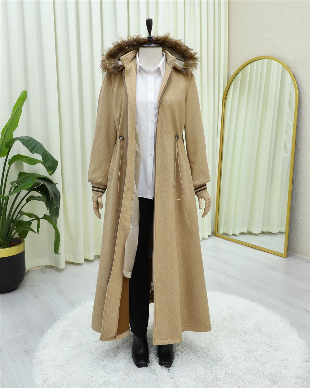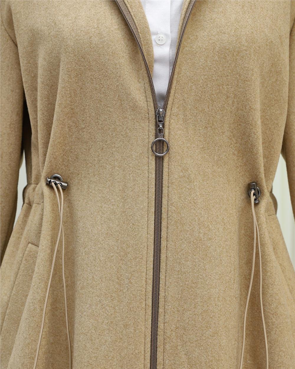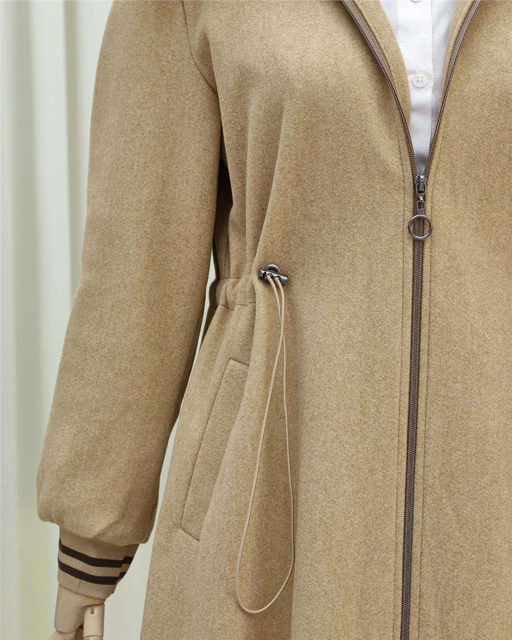 Kapşonlu Beli Lastikli Cepli Kaşe Kaban -Vizon (197-9503-R23)