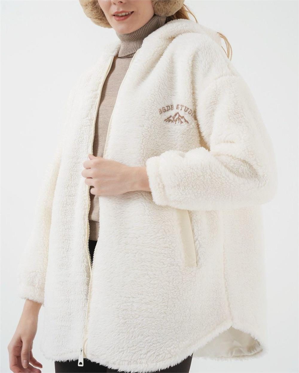 Kapşonlu Fermuarlı Kanguru Cepli Peluş Mont -Ekru (138-5207-R07)