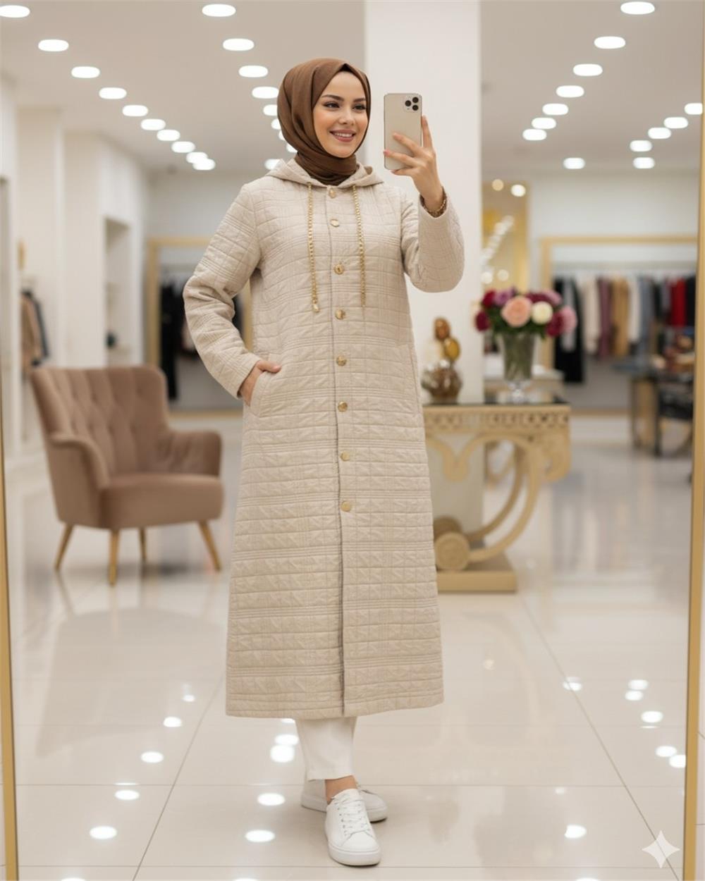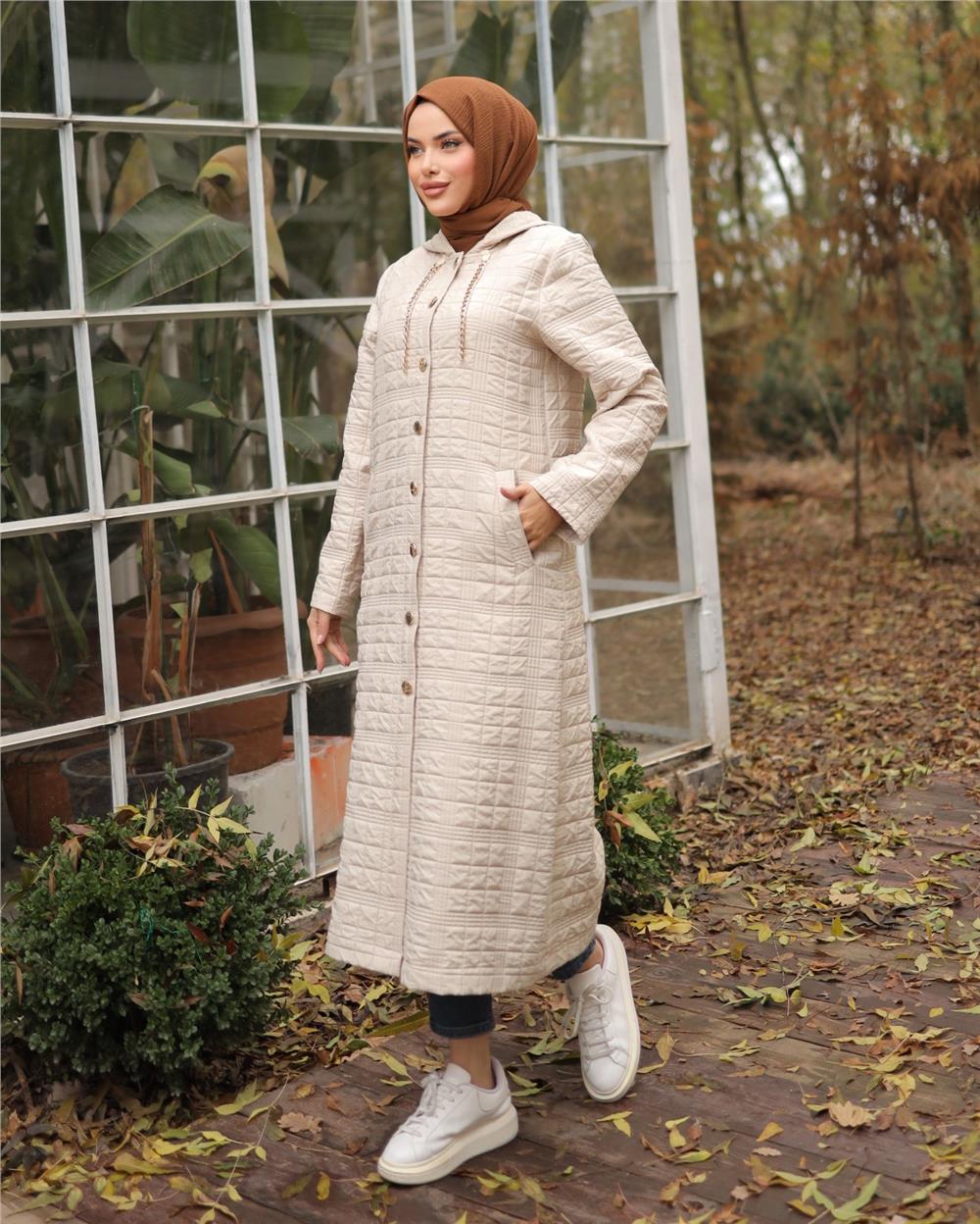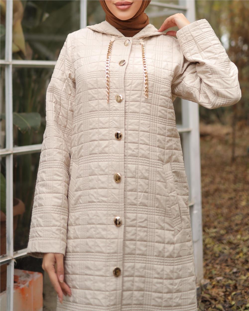 Kapşonlu Önü Düğmeli Zincir Detaylı Kapitone Kap -Taş (332-71235-R43)