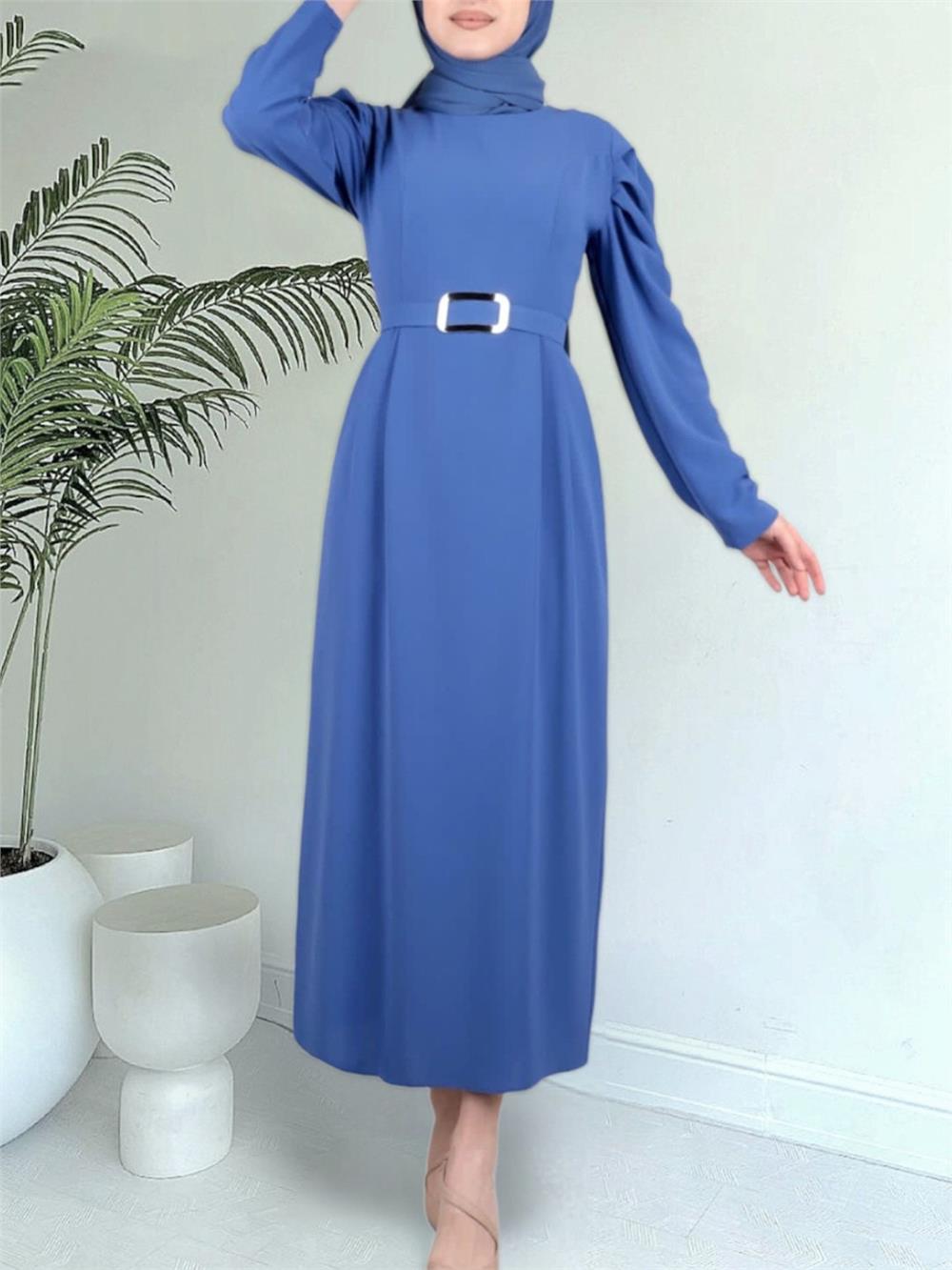 فستان بحزام وبأكمام بطيخية - نيلي (347-3004-R21)