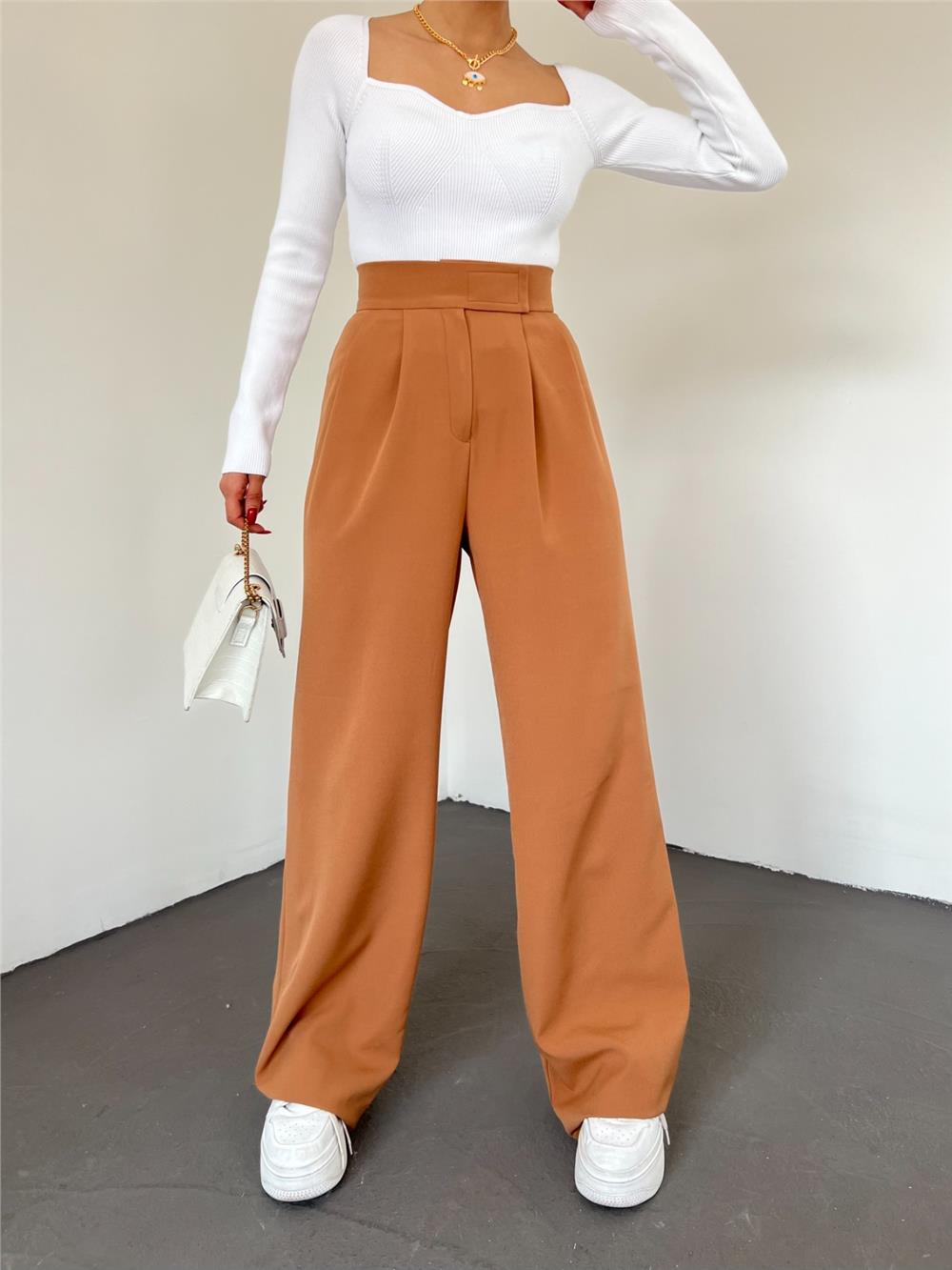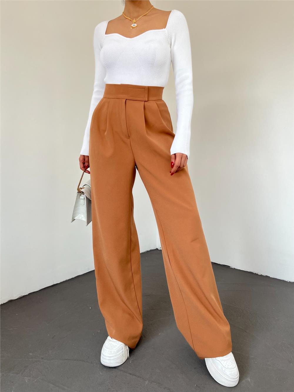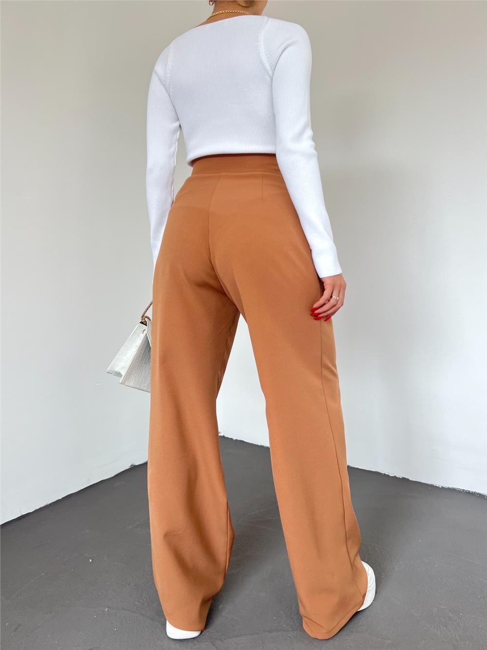 بنطلون نسائي واسع الساق بلون أسمر