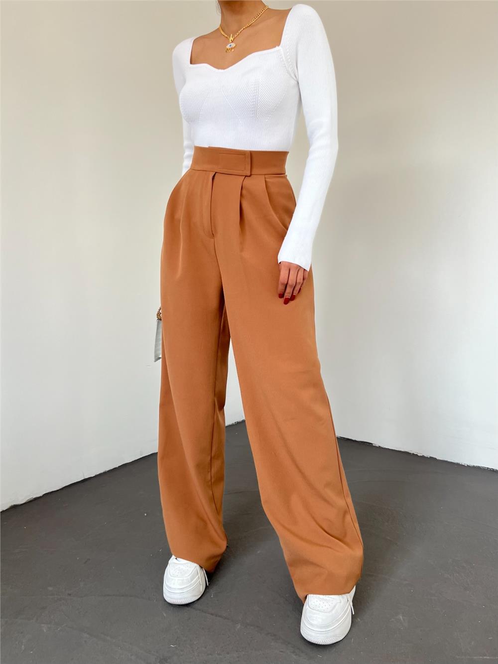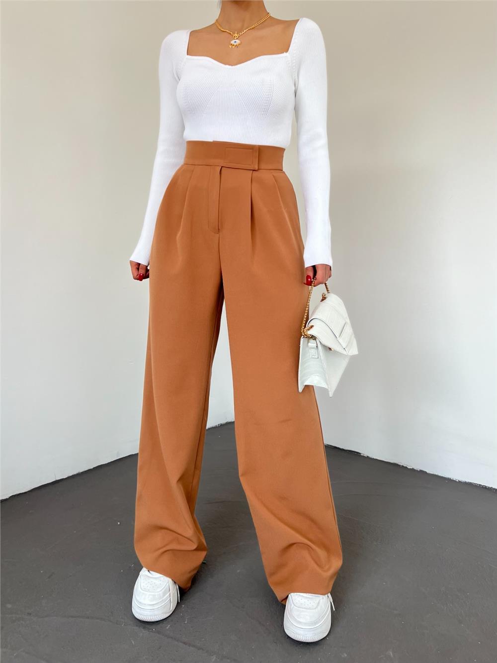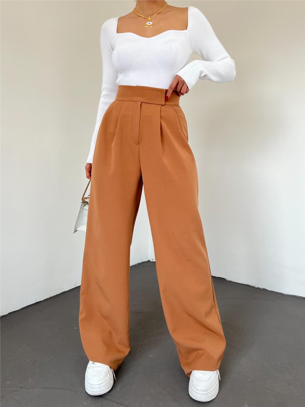 بنطلون نسائي واسع الساق بلون أسمر