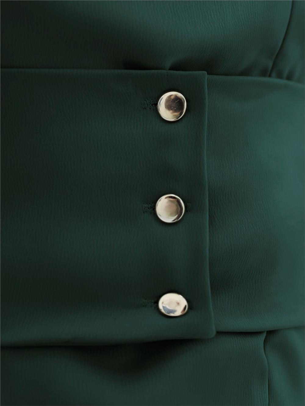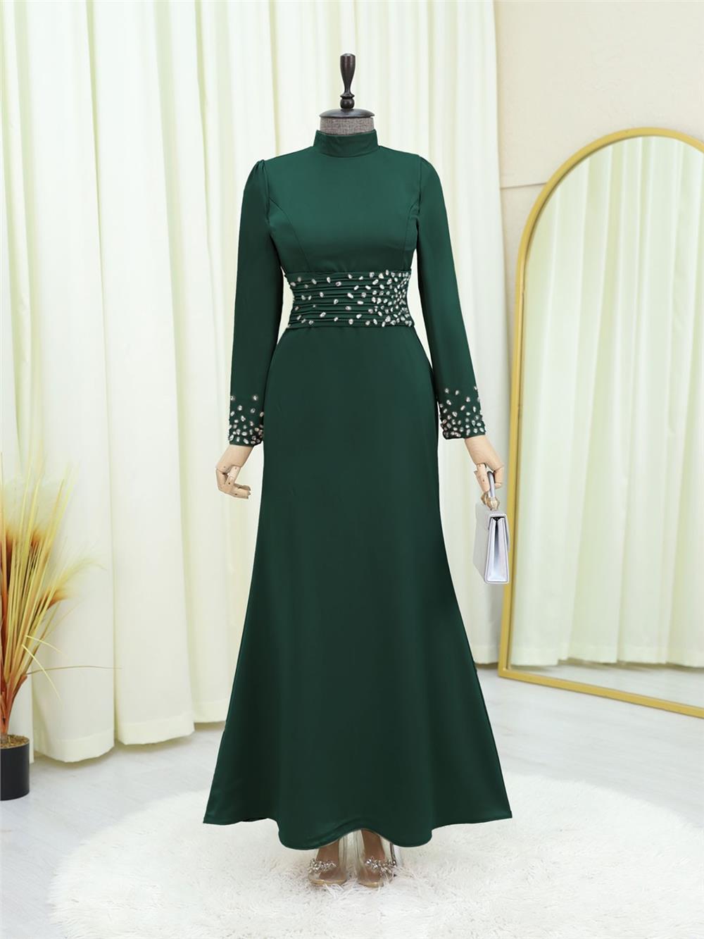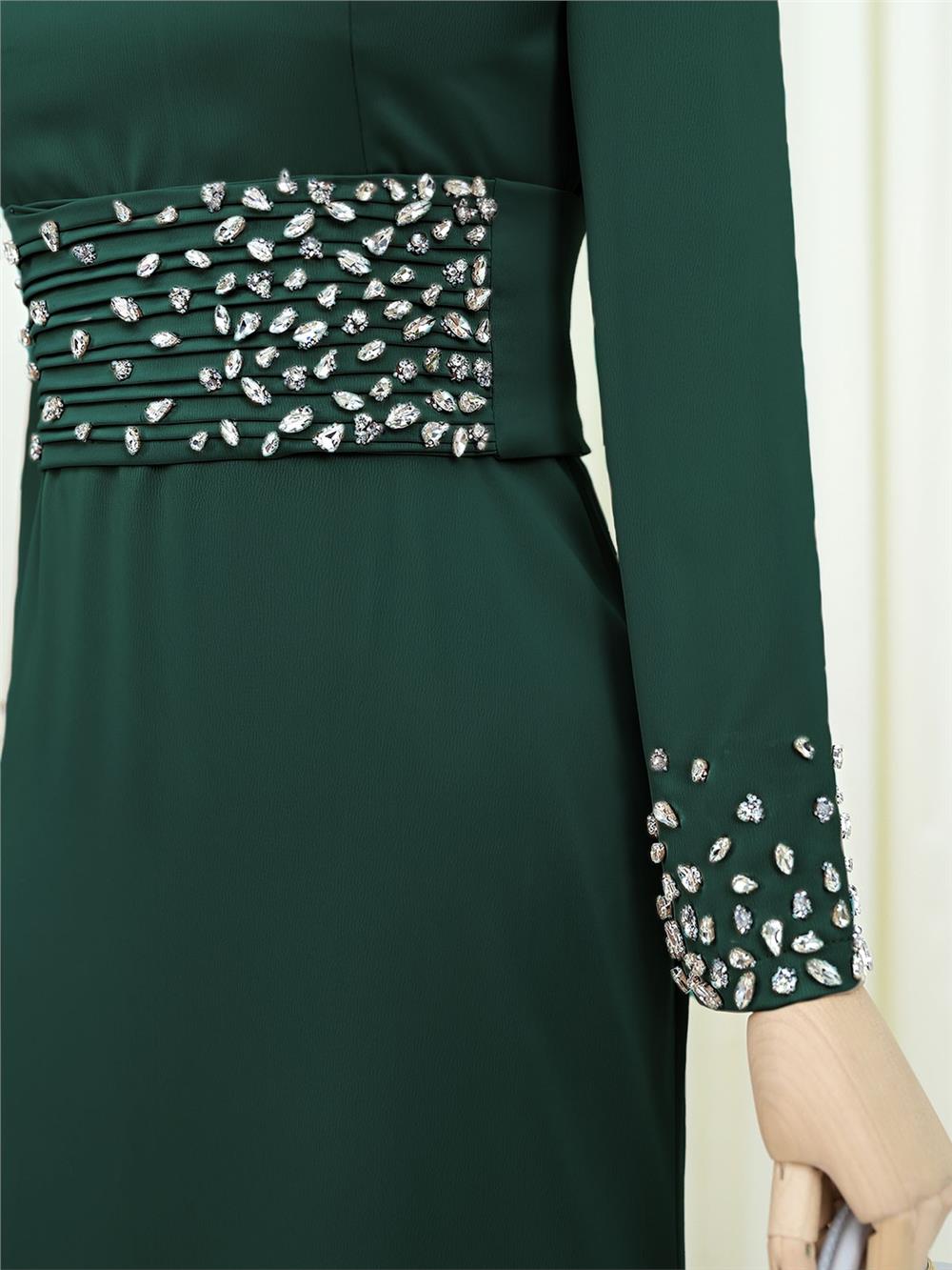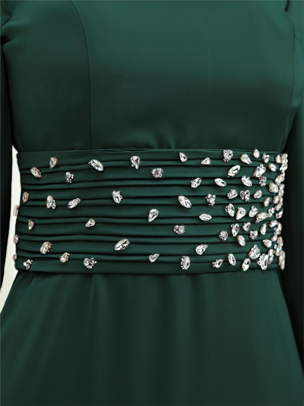 Korse Kemerli Taşlı Saten Abiye -Zümrüt (316-4640-R17)