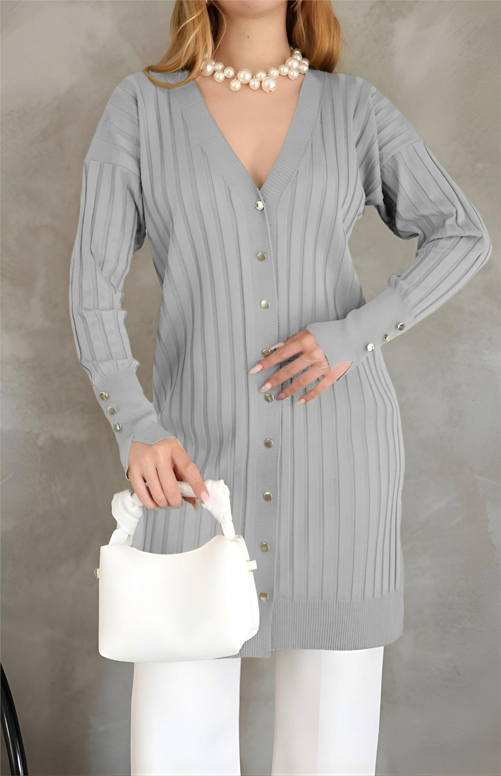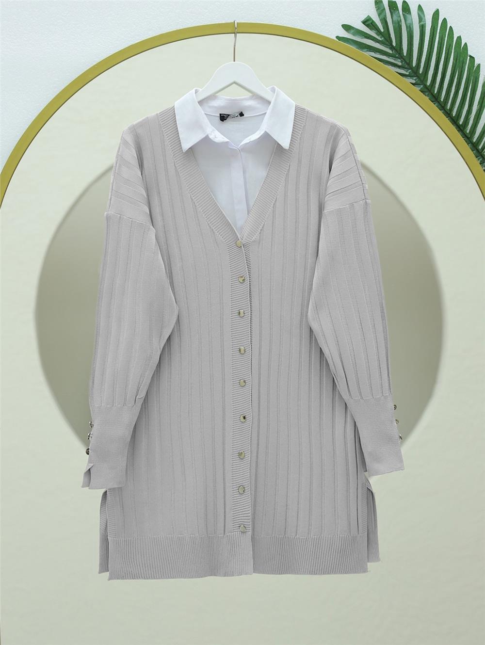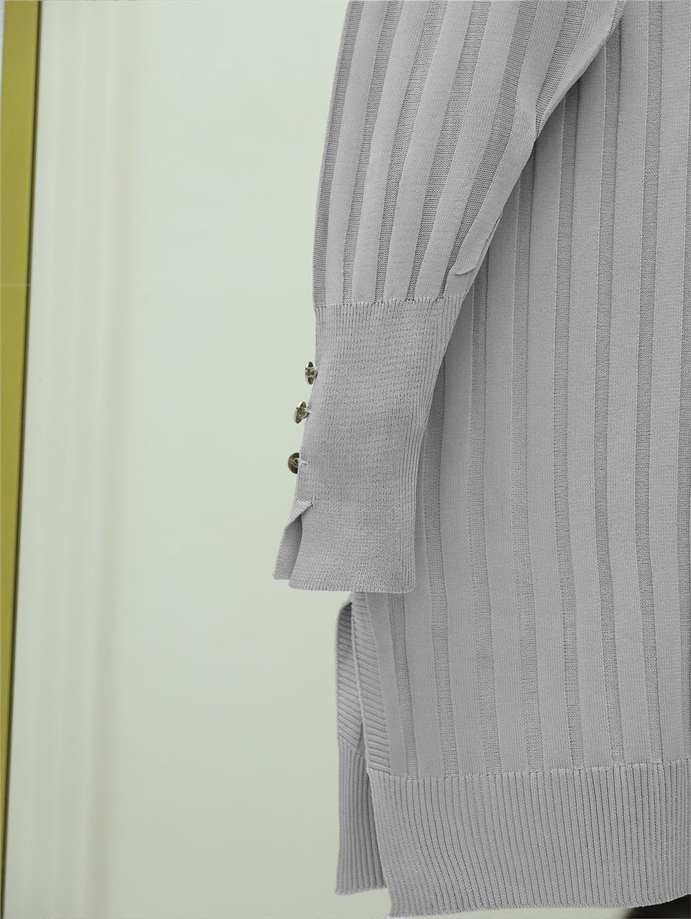 Metal Düğmeli Yırtmaçlı Triko Hırka -Gri (280-3179-R11)