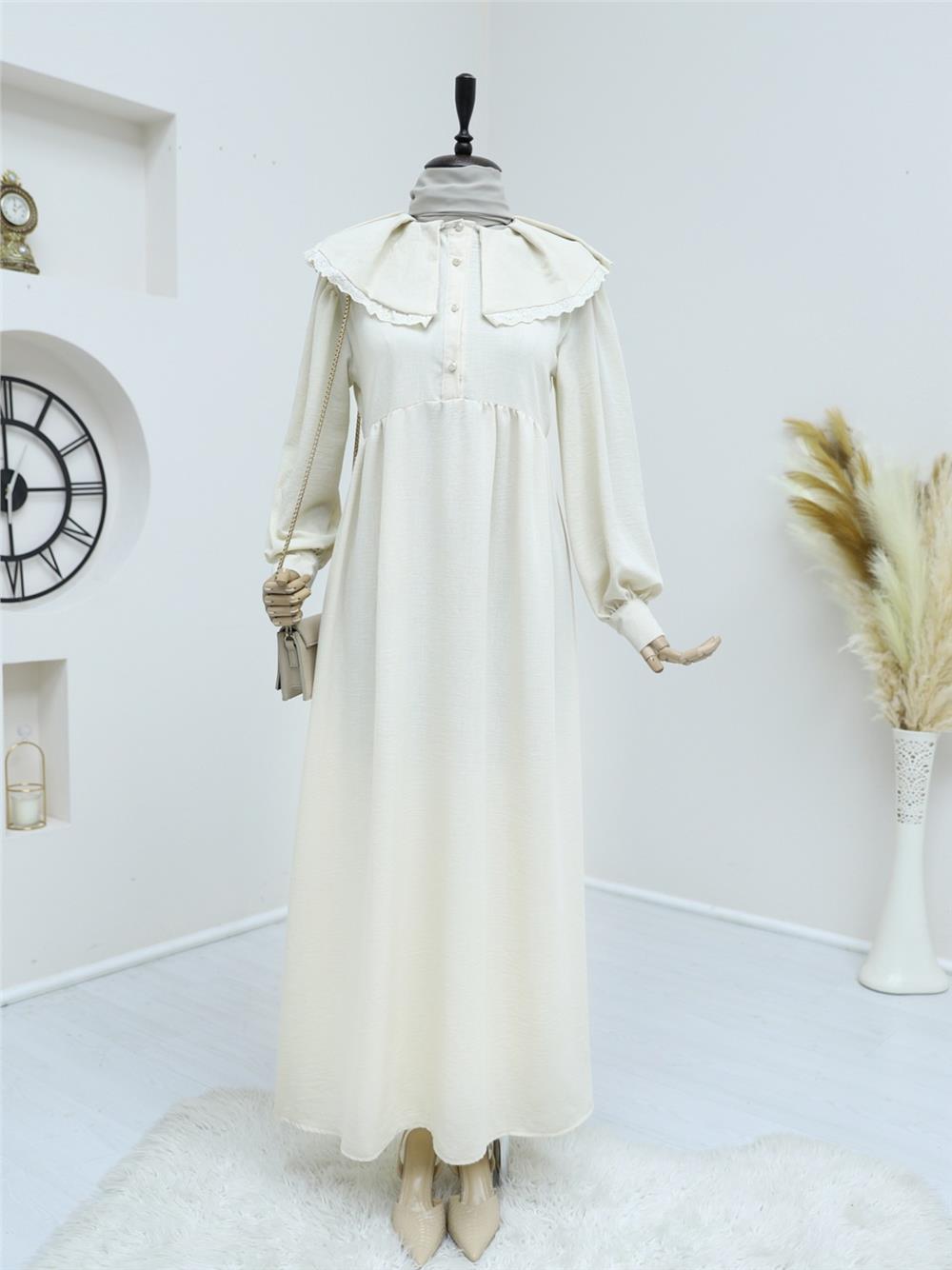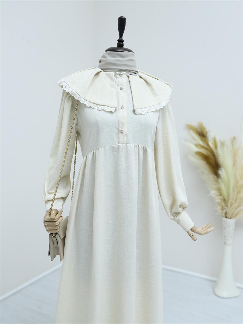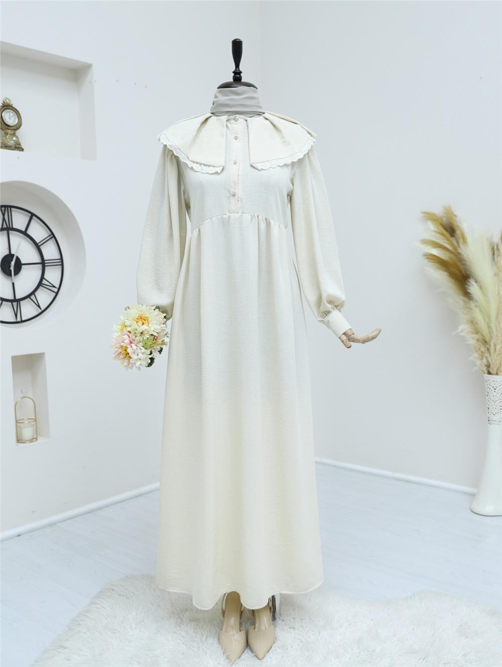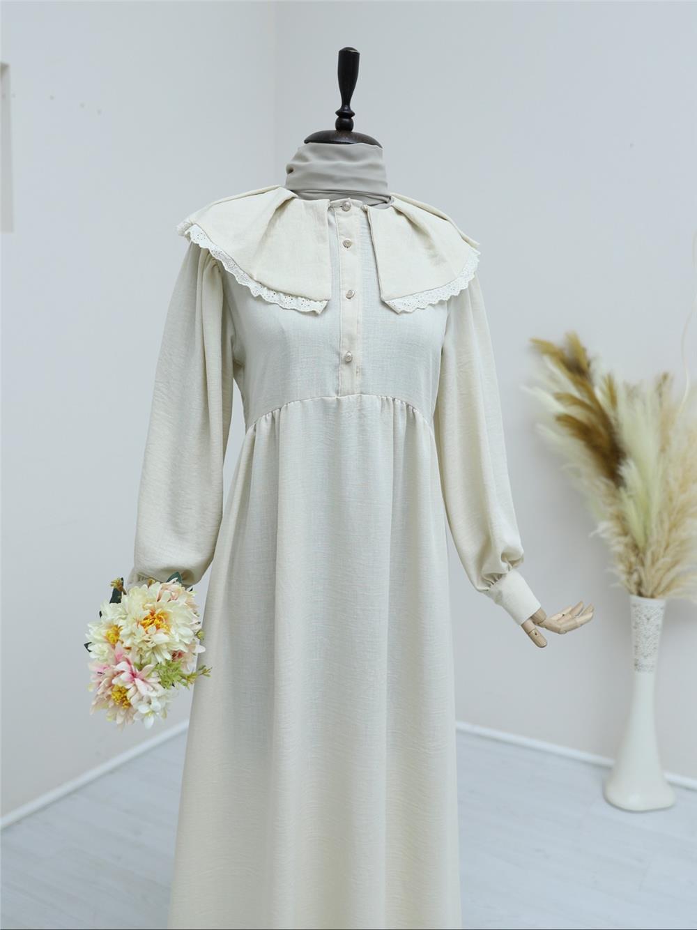 فستان كتان بياقة مئزر مع نصف أزرار - بيج (307-2077-R56)