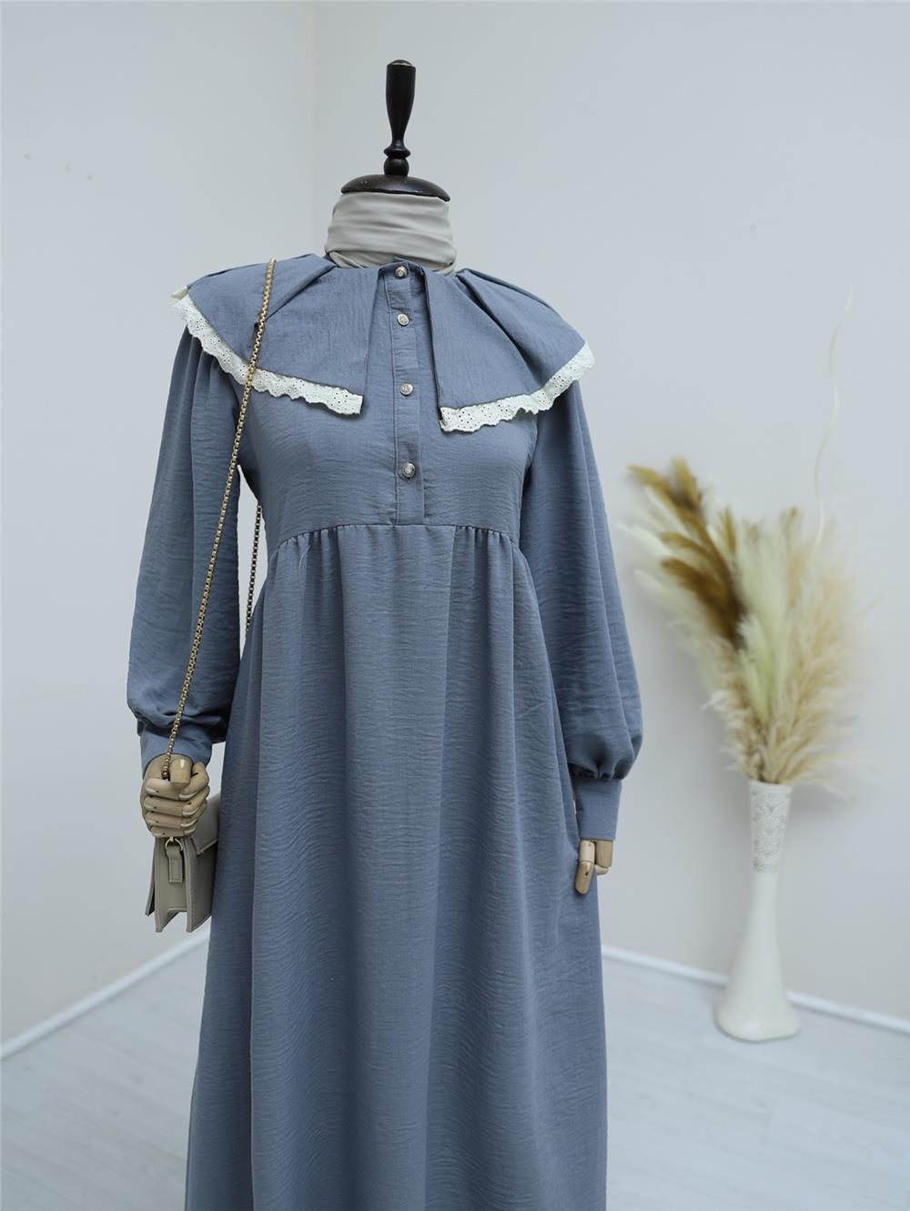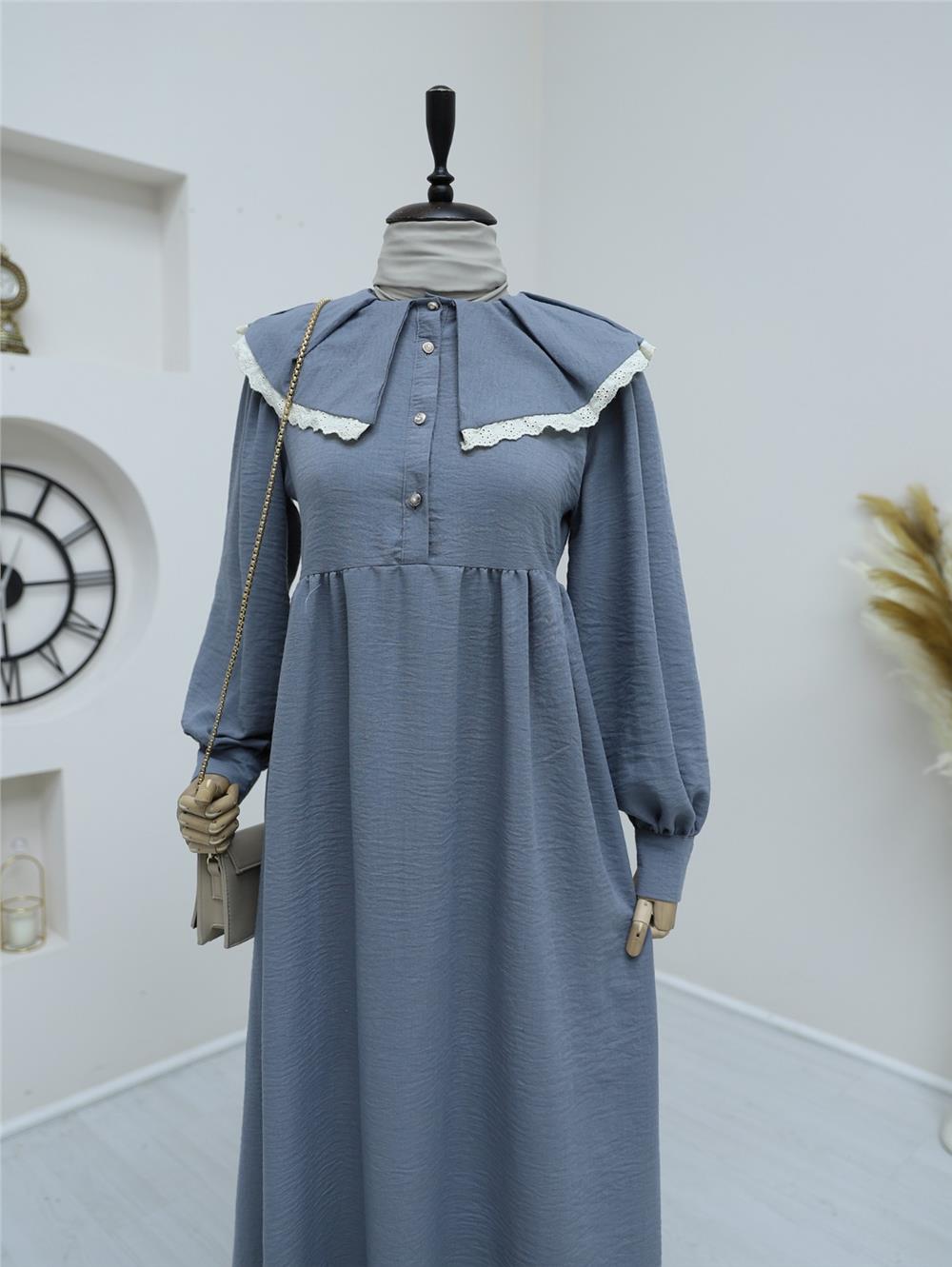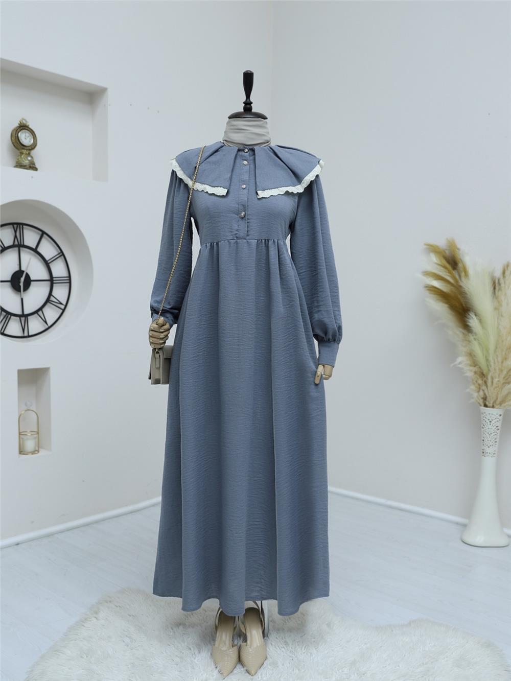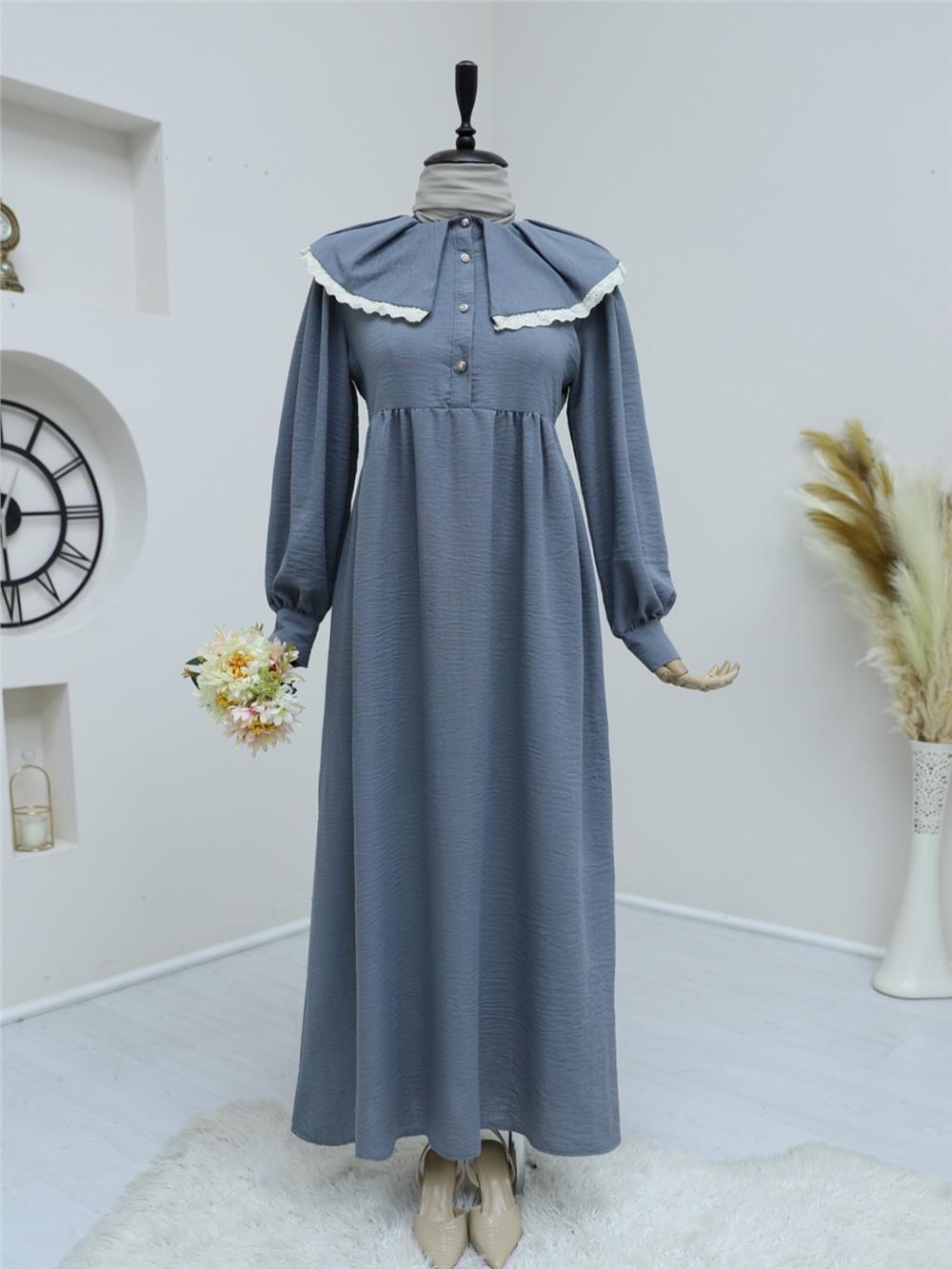 فستان كتان بياقة مئزر متجمع نصف زر - رمادي (307-2077-R11)