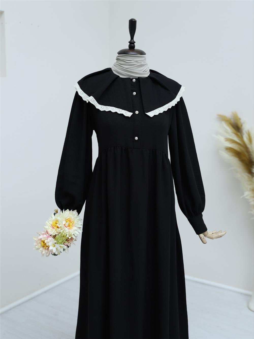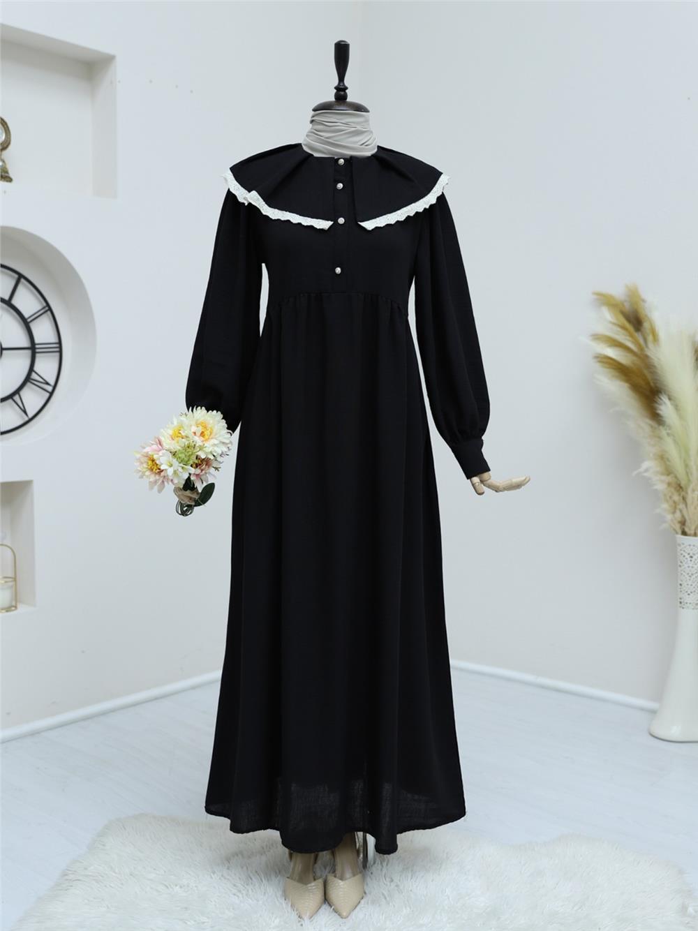 فستان كتان بياقة مئزر ومكشوف بنصف زر - أسود (307-2077-R01)