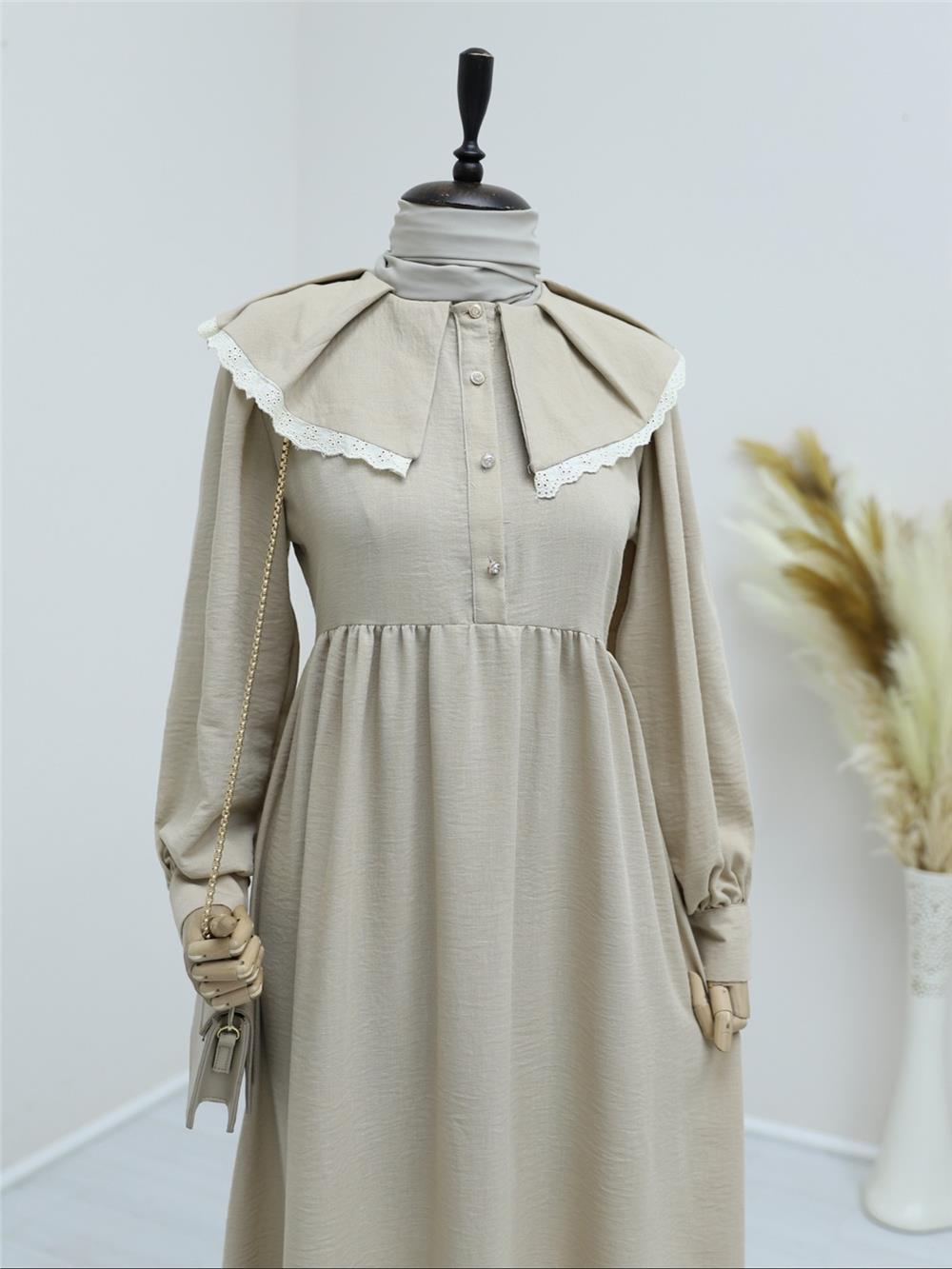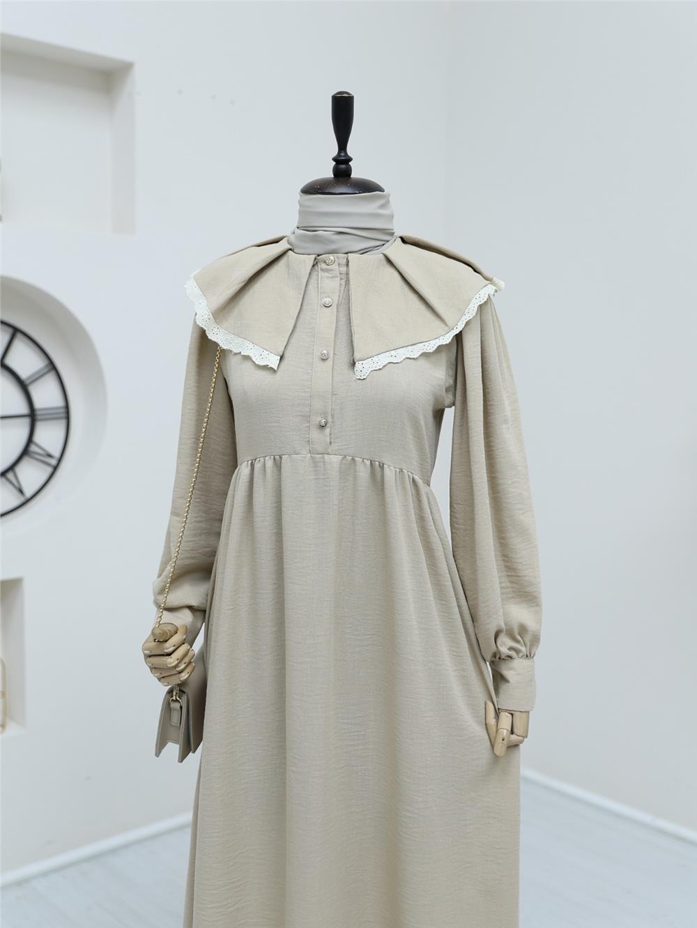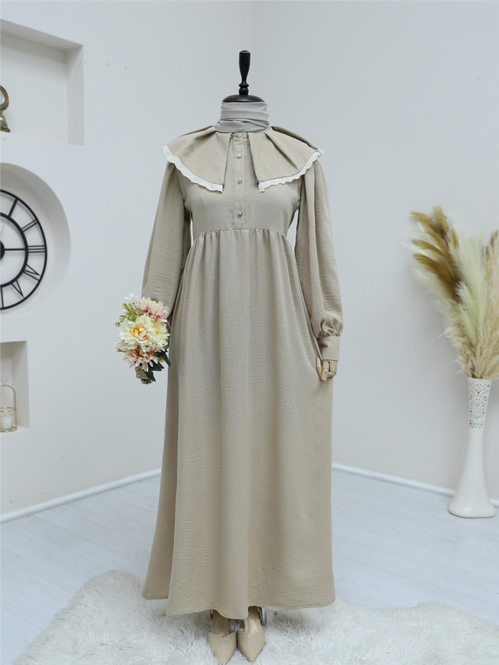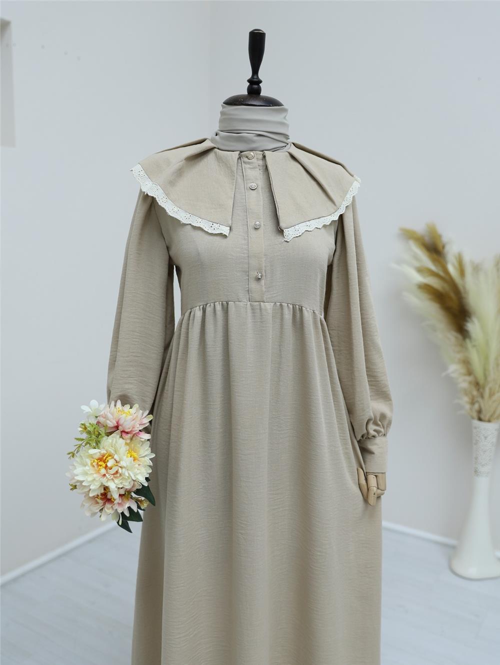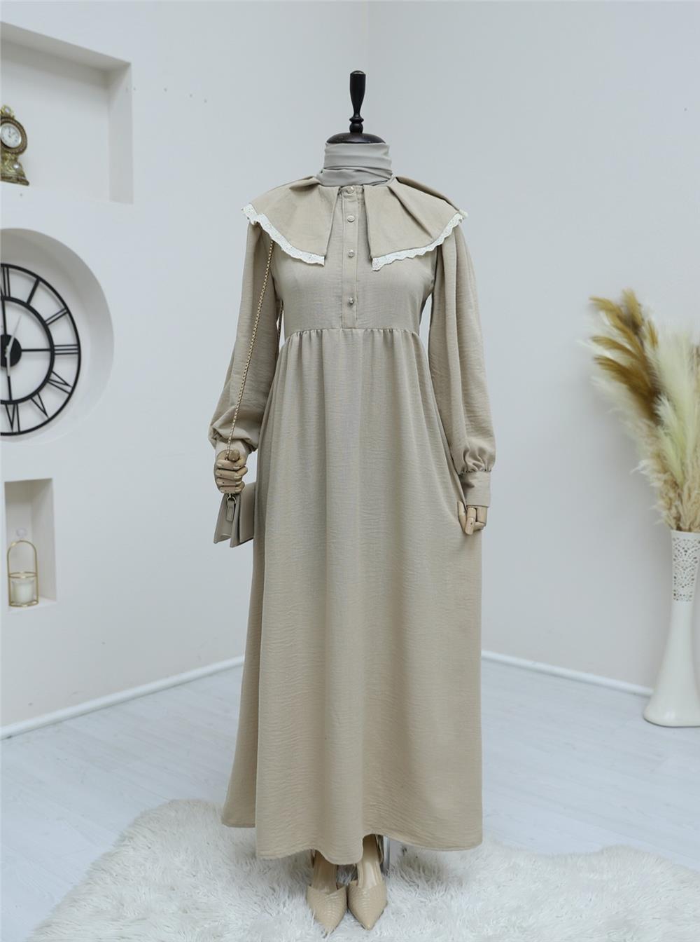 فستان كتان بياقة مئزر متجمع نصف زر - مينك (307-2077-R23)