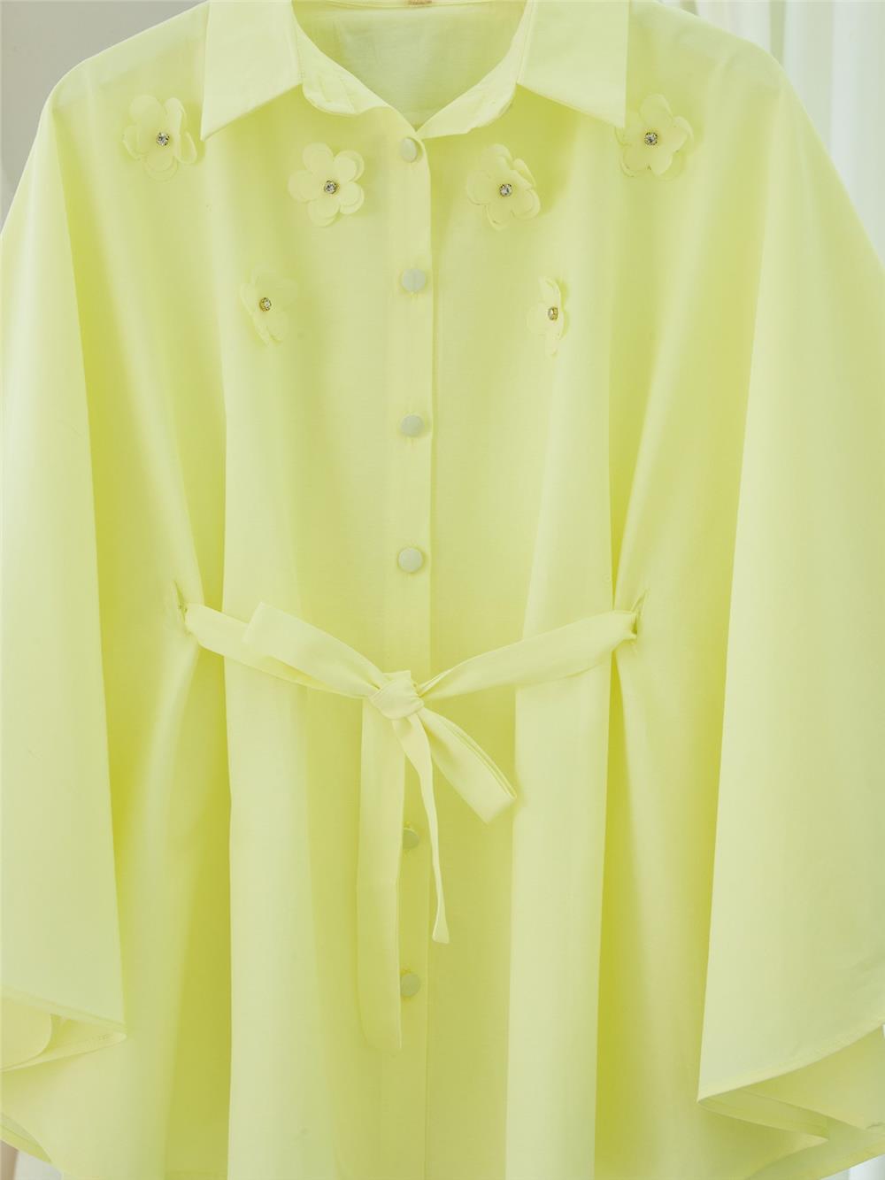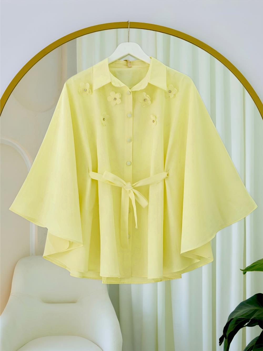 Önü Çiçek Detaylı Beli Bağcıklı Düğmeli Panço -Açık Sarı (398-1048-R75)