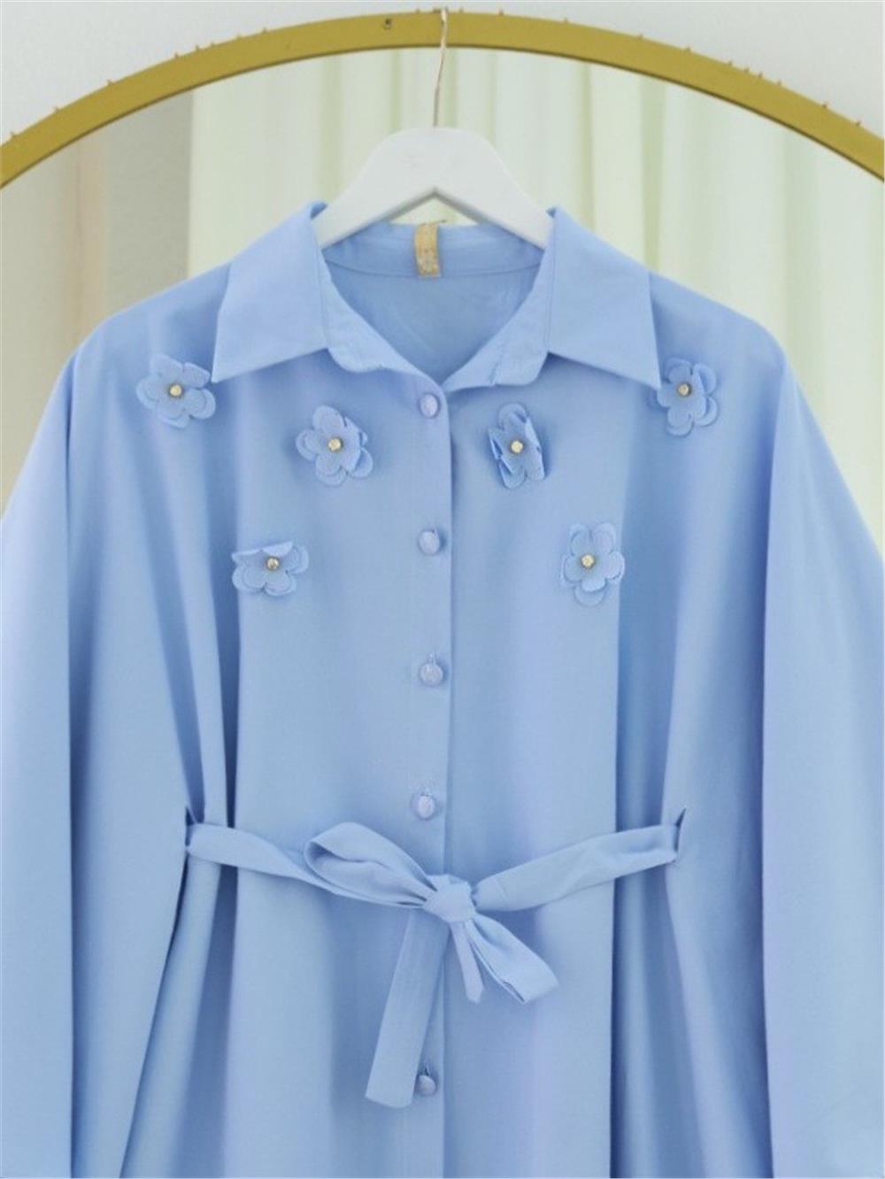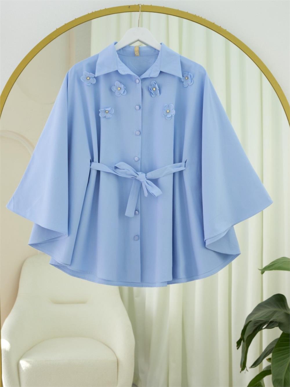Önü Çiçek Detaylı Beli Bağcıklı Düğmeli Panço -Mavi (398-1048-R31)