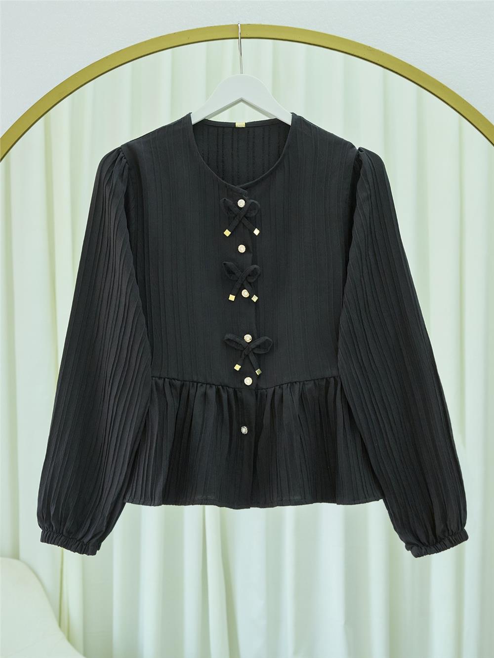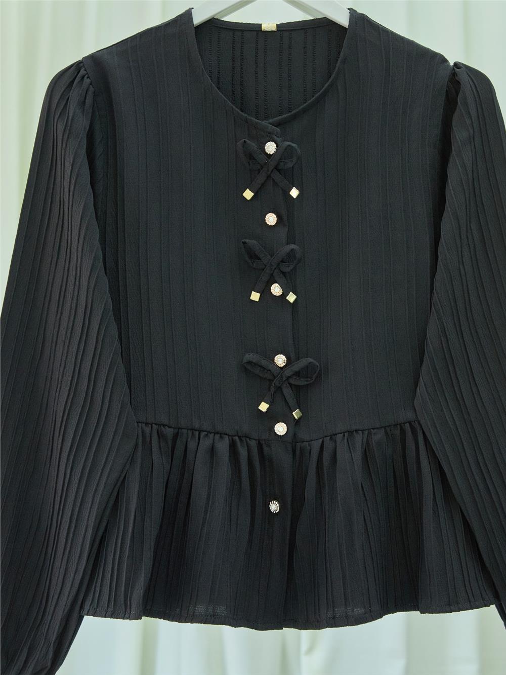 Önü Fiyonk Detaylı Düğmeli Kolu Lastikli Bluz -Siyah (398-1043-R01)