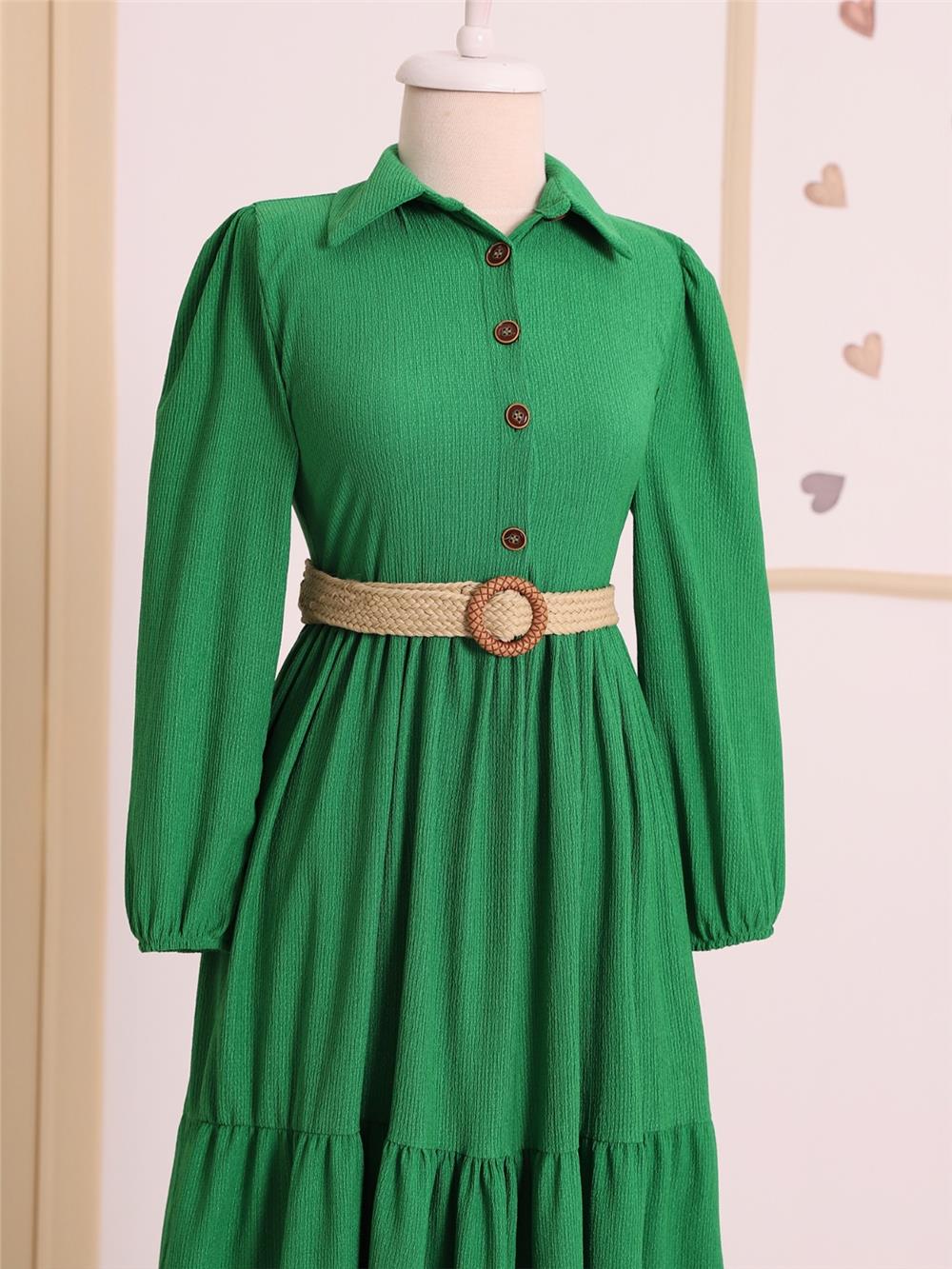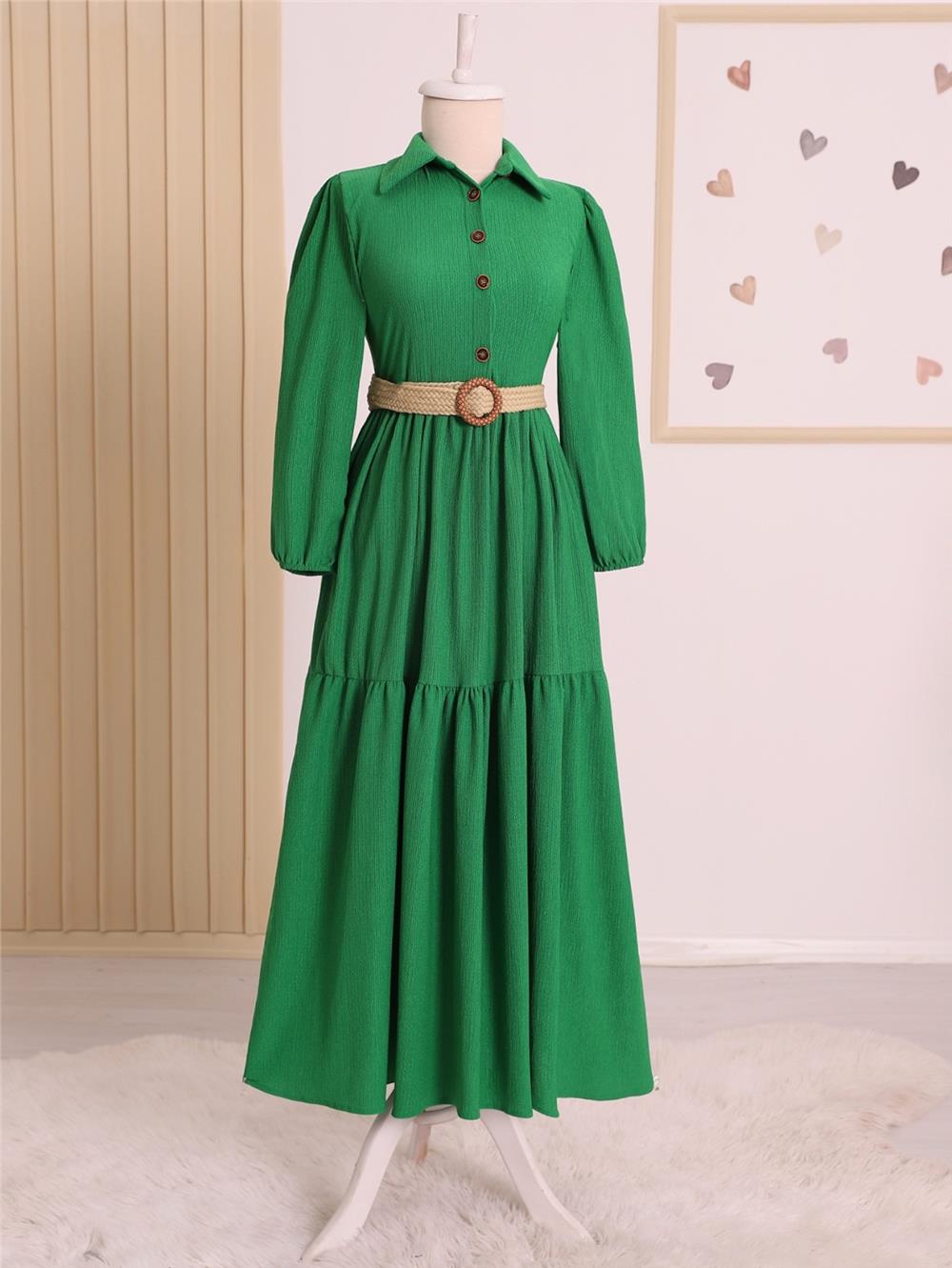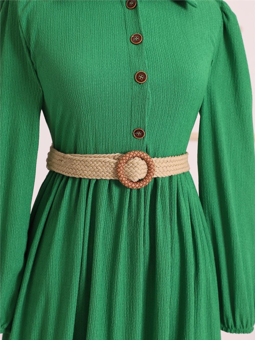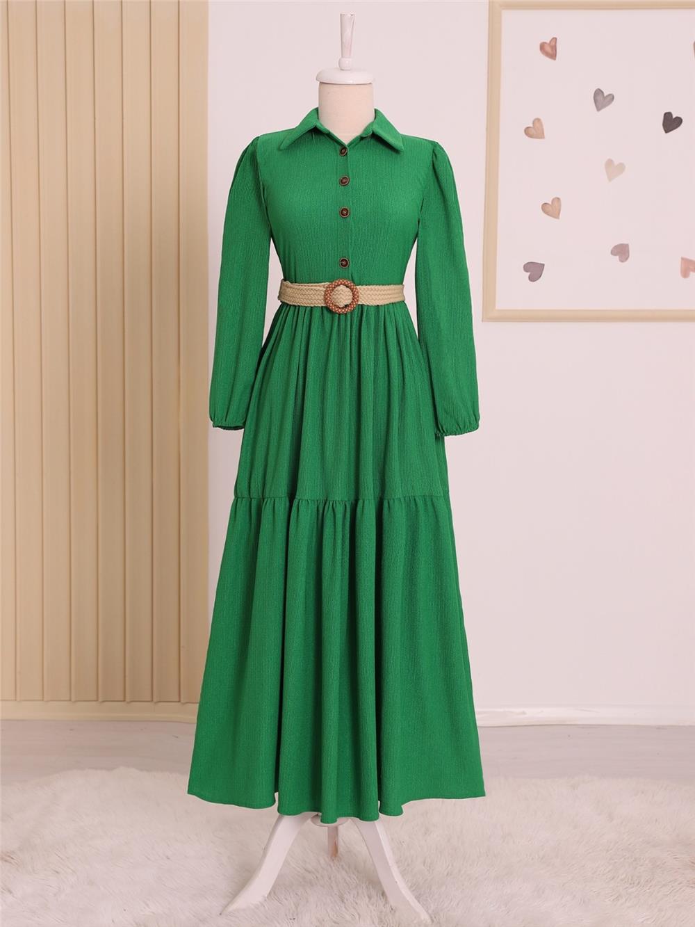فستان مجعد بحزام نصف أزرار - أخضر (347-8037-R35)