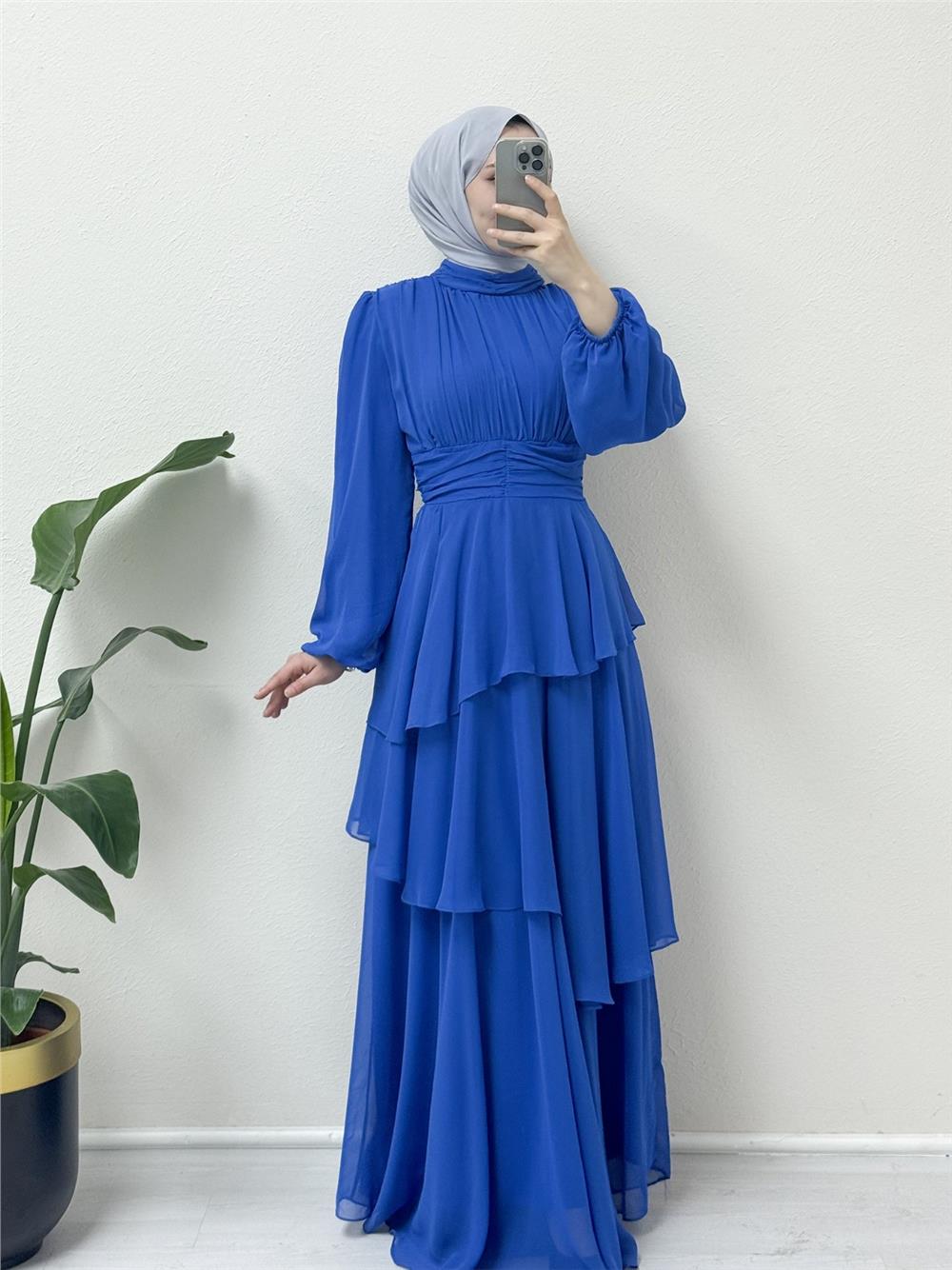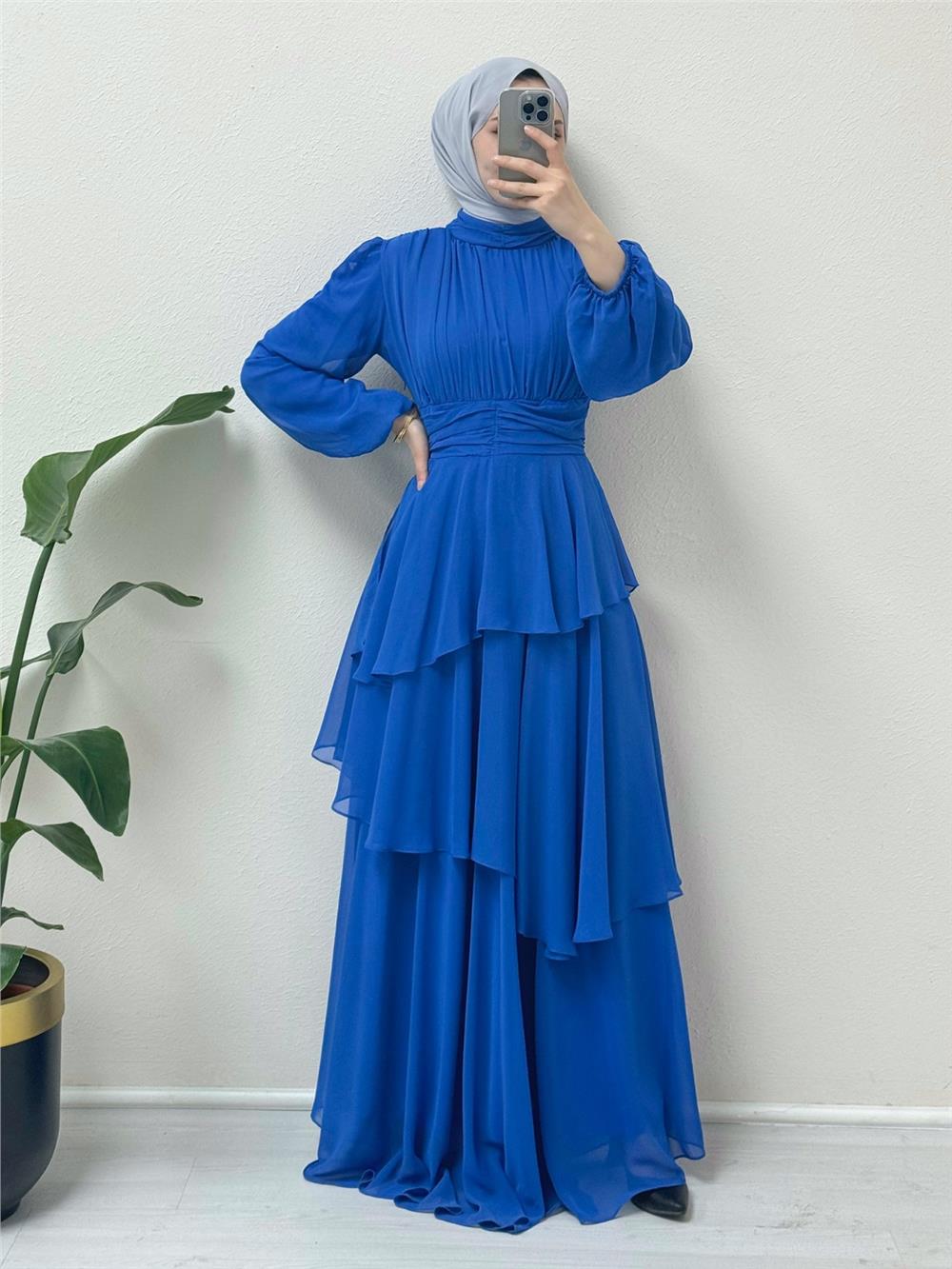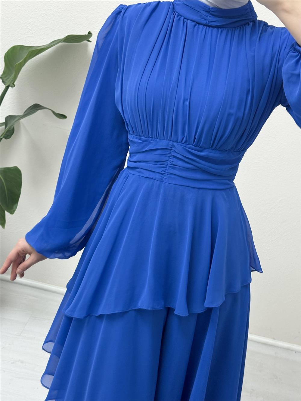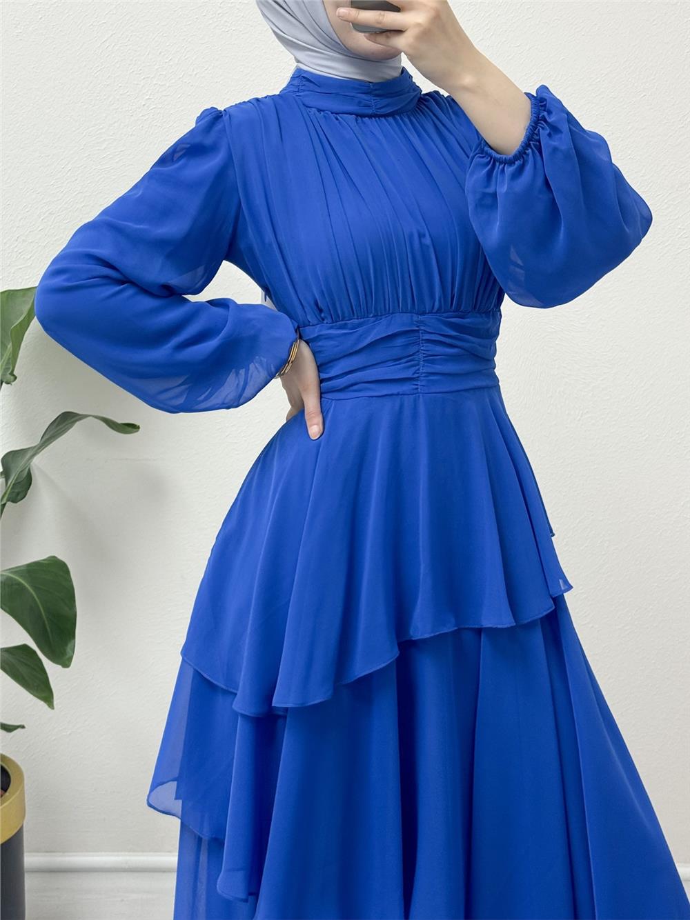 Robadan Büzgülü Eteği Katmanlı Şifon Elbise -İndigo (111-61432-R21)
