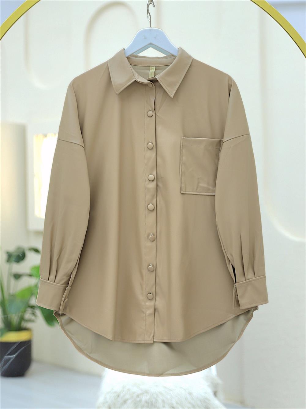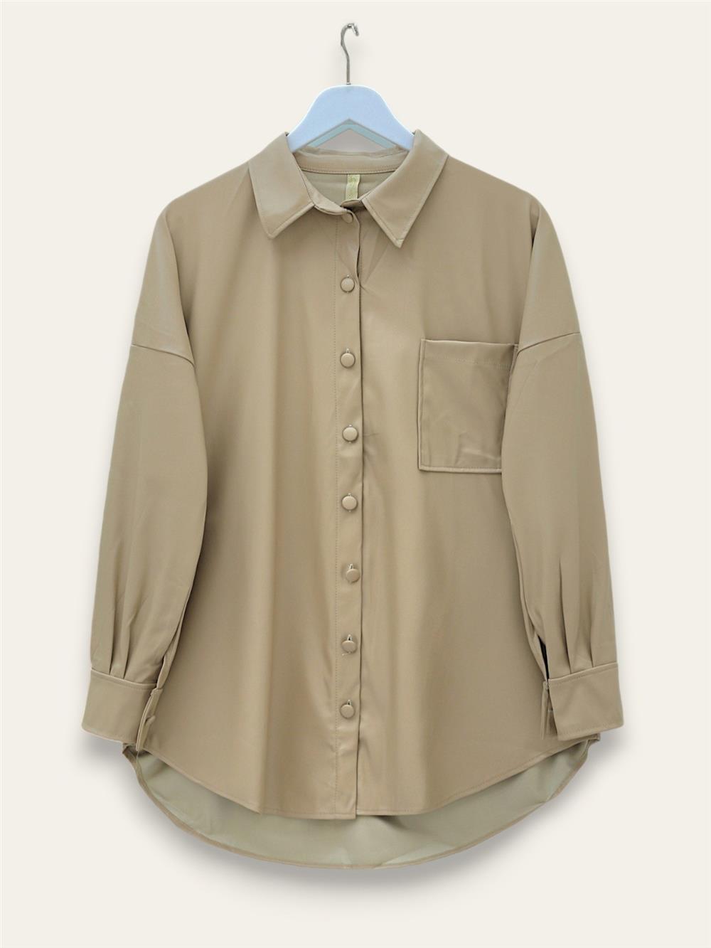 قميص جلدي بجيب واحد وقصة بيضاوية - بيج (398-5022-R56)