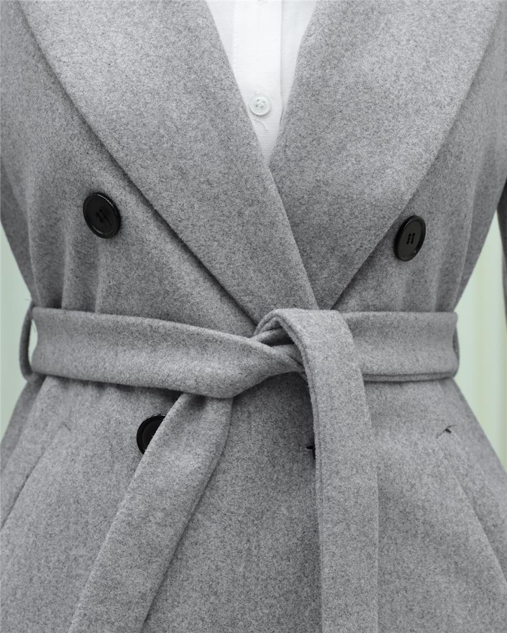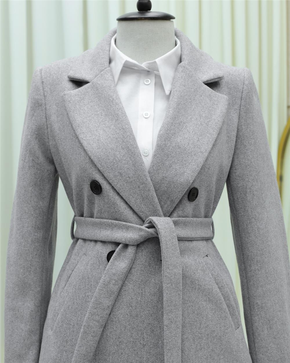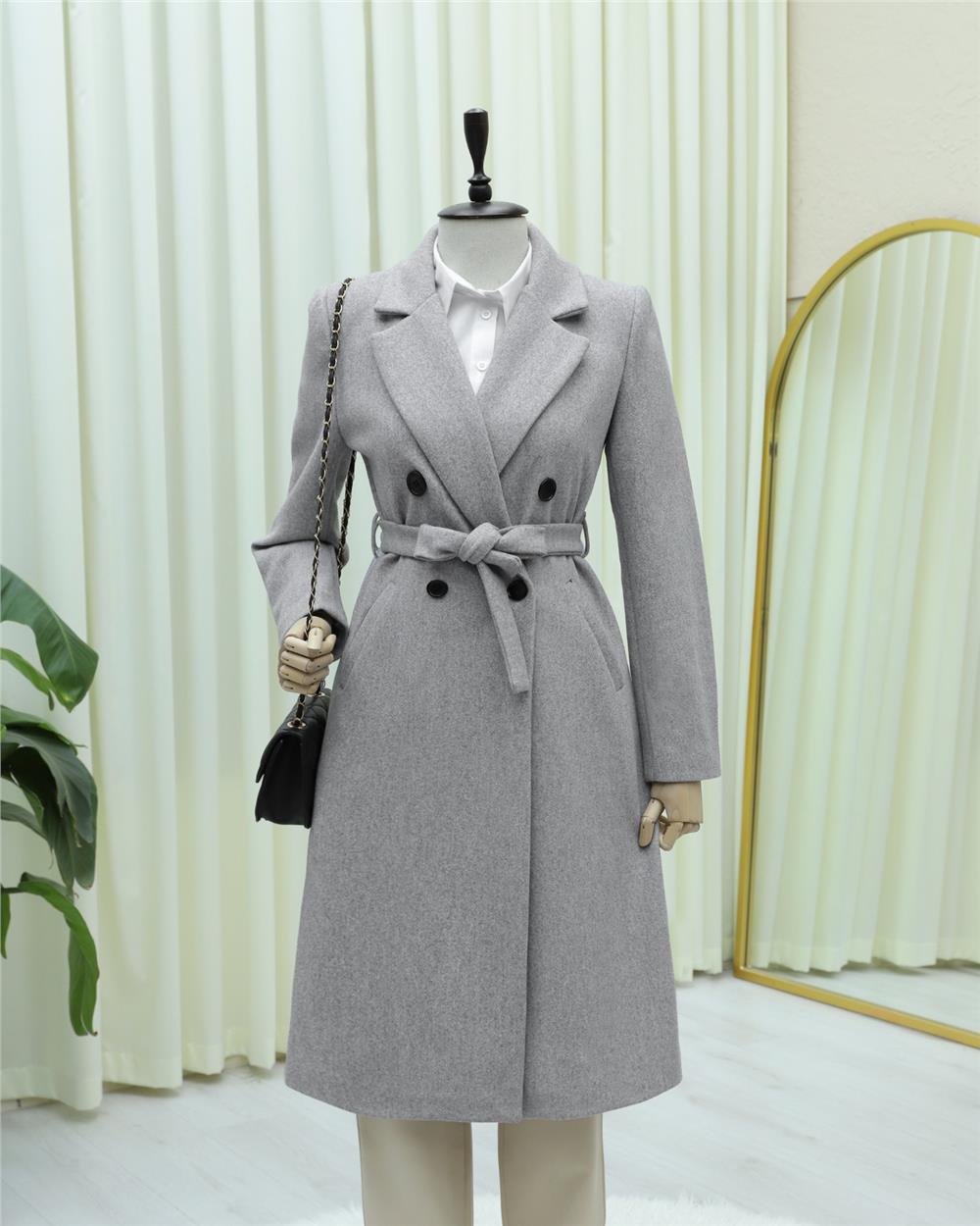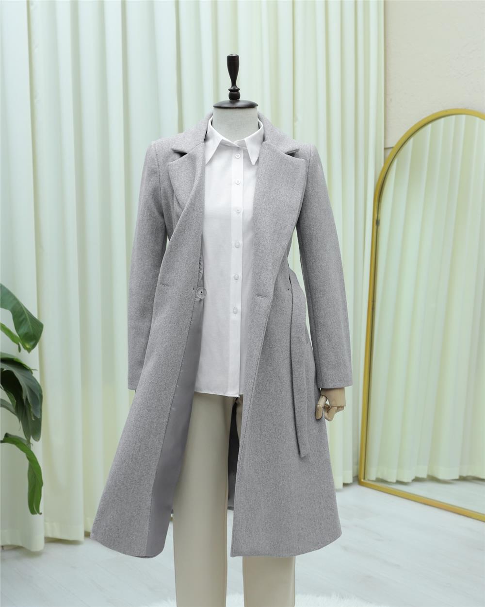 Tek Düğmeli Cepli Kemerli Astarlı Kaşe Kaban -Gri (197-4911-R11)