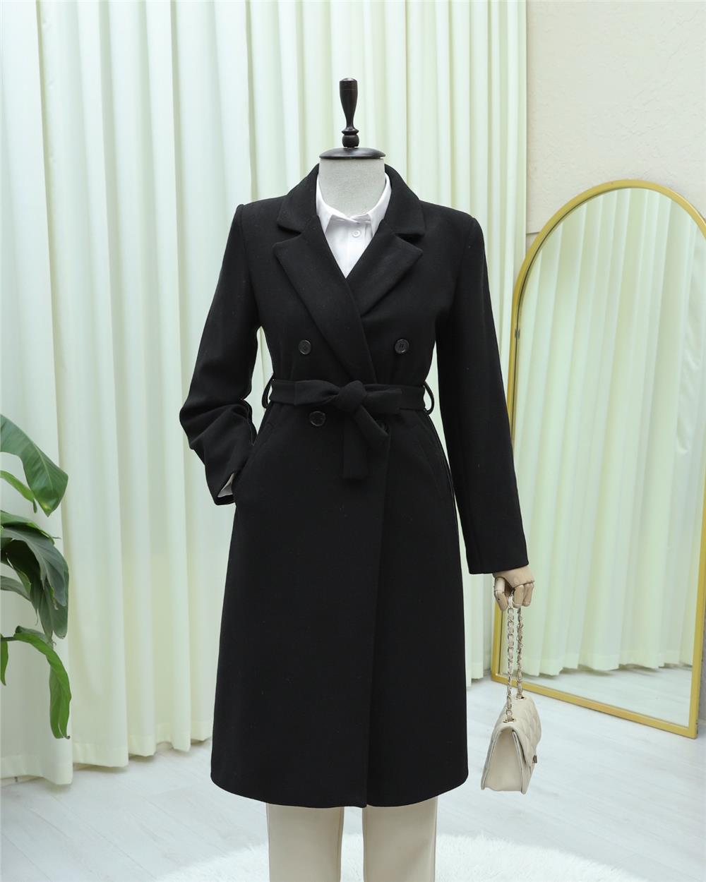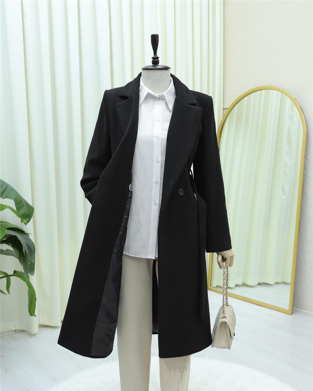 Tek Düğmeli Cepli Kemerli Astarlı Kaşe Kaban -Siyah (197-4911-R01)