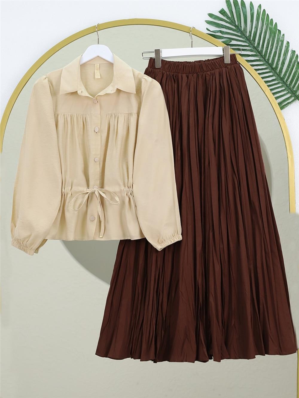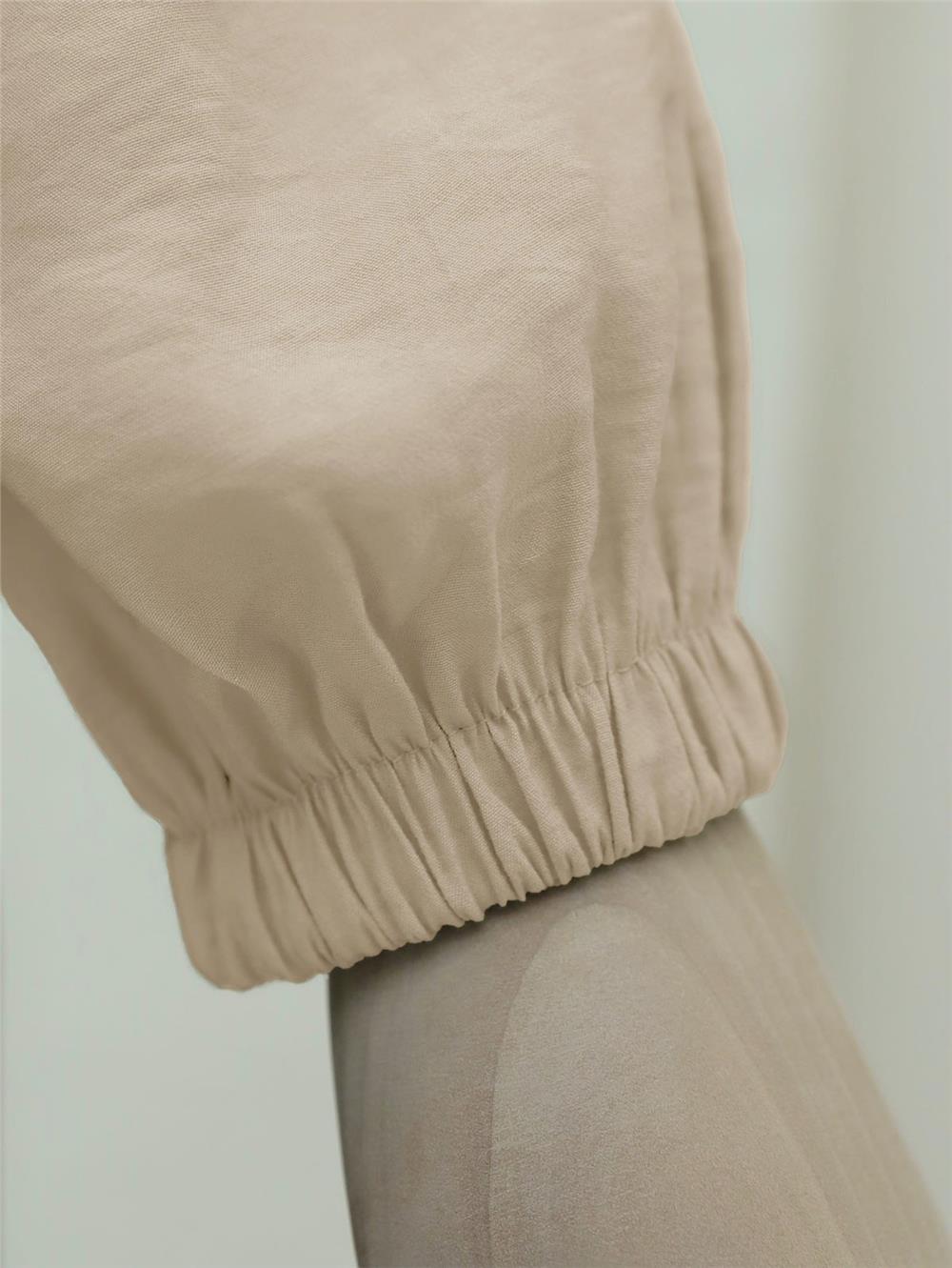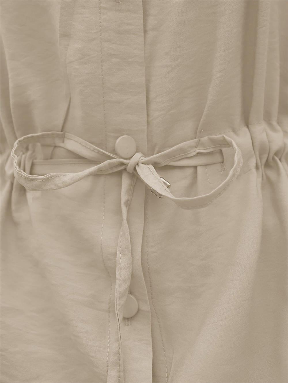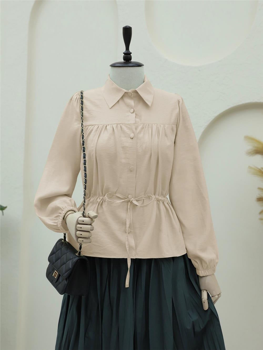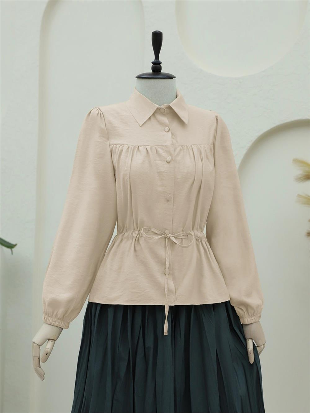 Tünel Bağcıklı Düğmeli Gömlek Bluz -Açık Vizon (398-1004-R51)