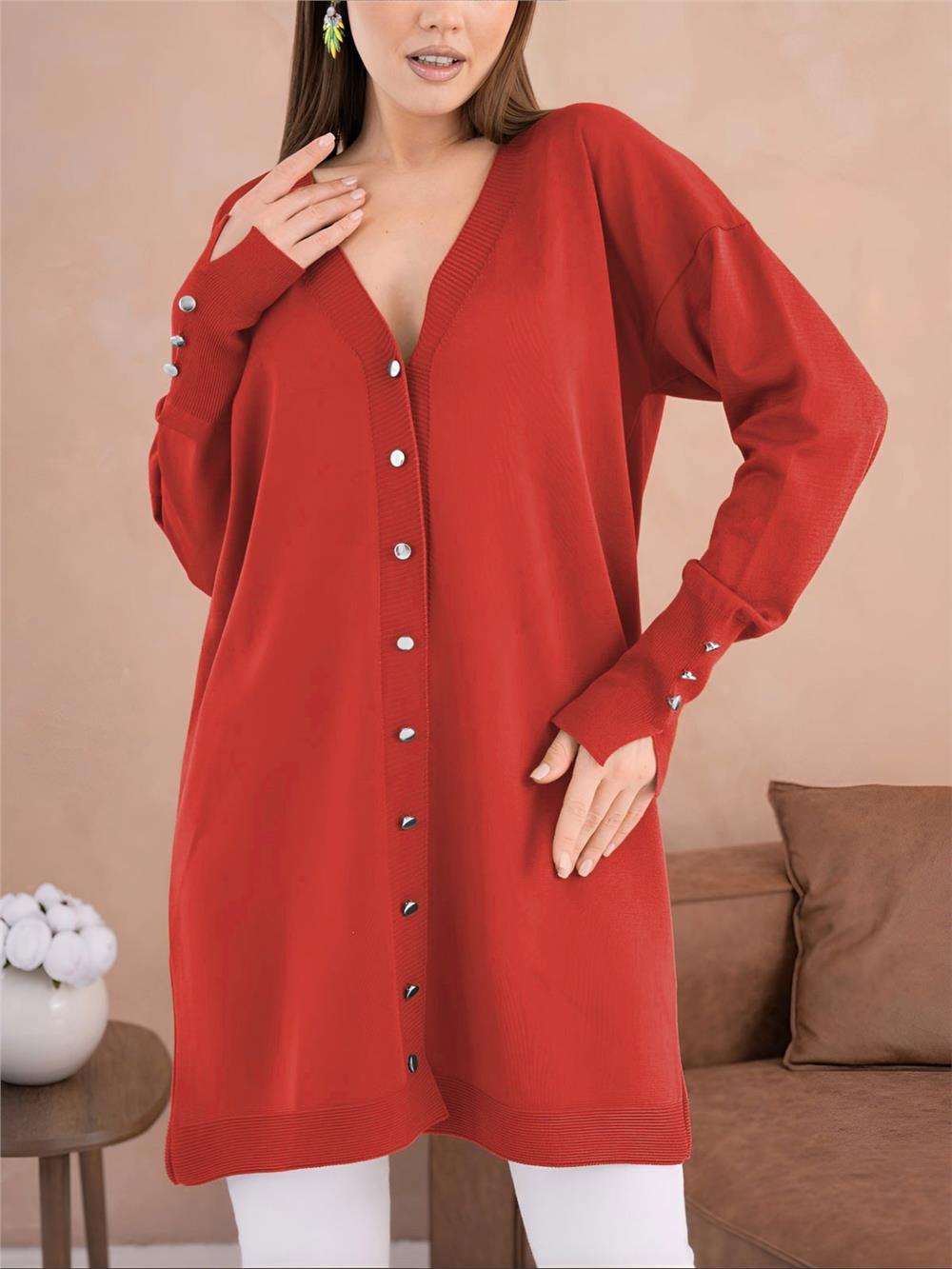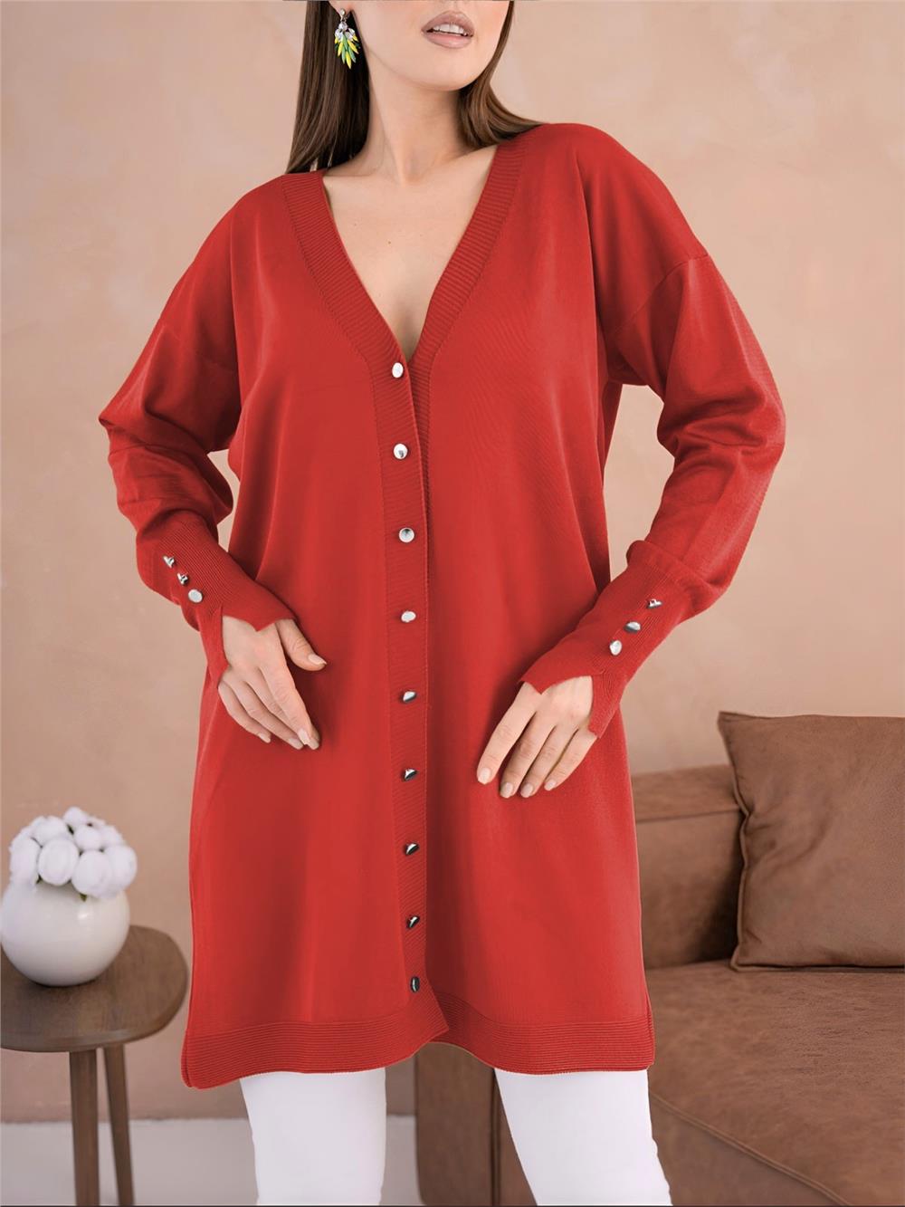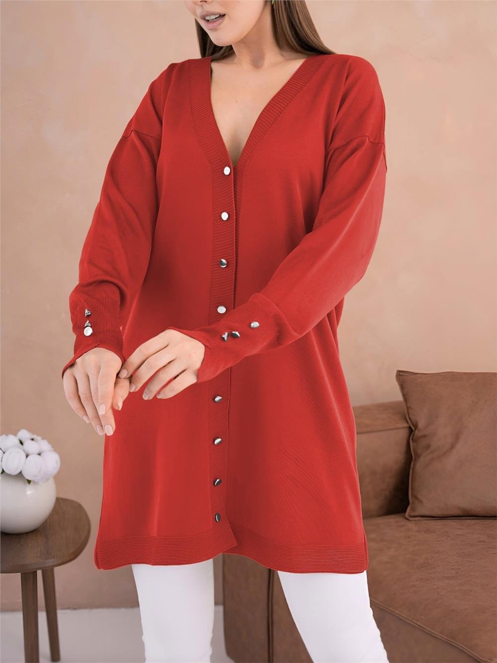 V Yaka Önü Düğmeli Triko Hırka -Kırmızı (280-3176-R33)