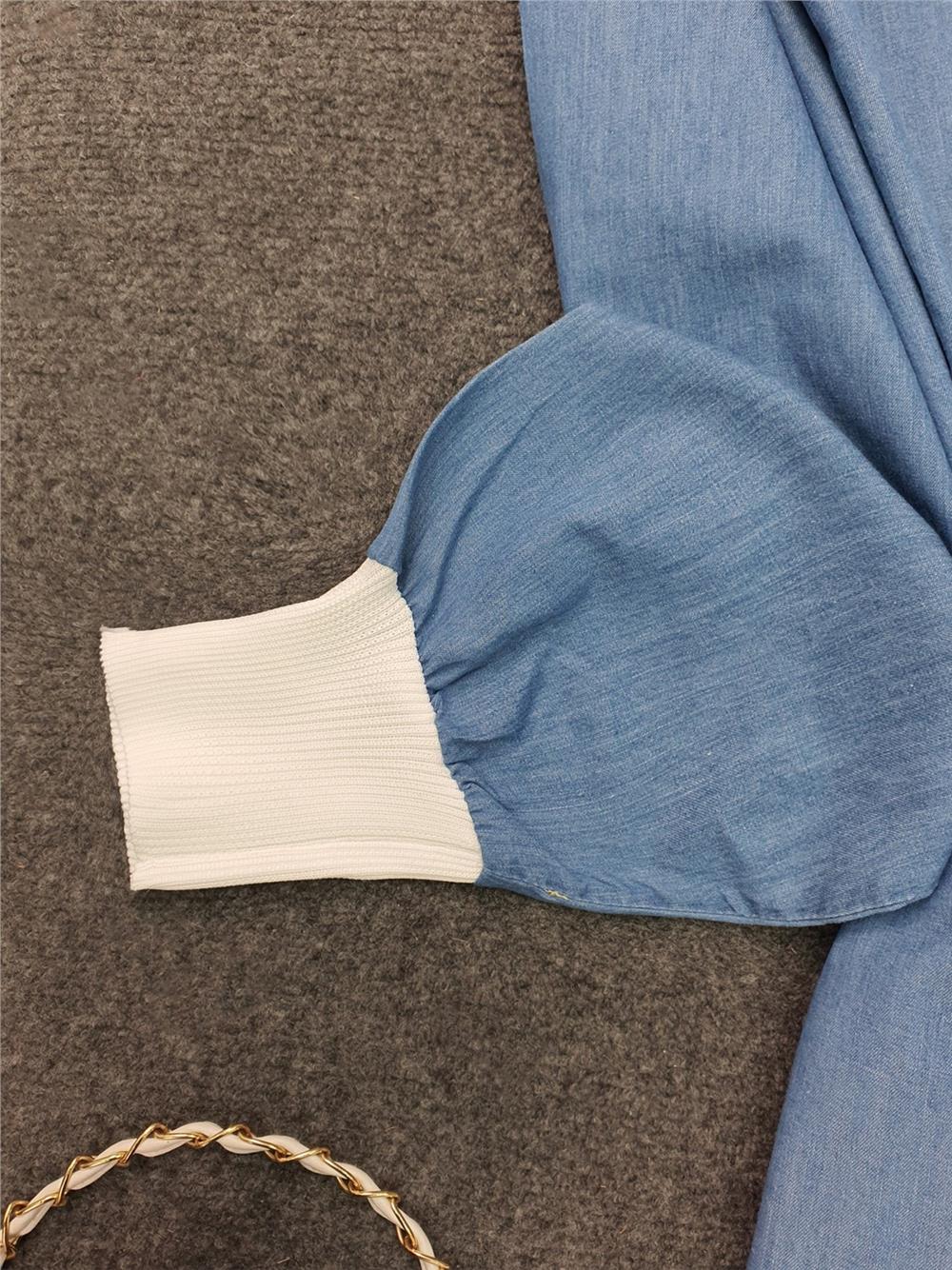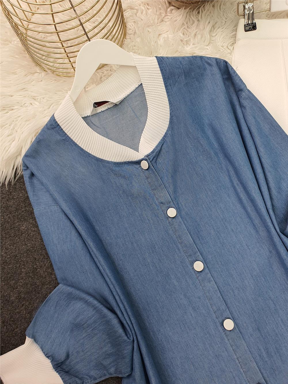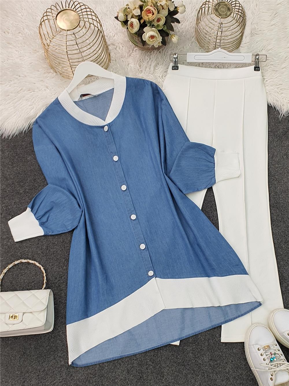 Yakası ve Etek Ucu Ribanalı Düğmeli Kot Tunik -Mavi (199-114-R31)