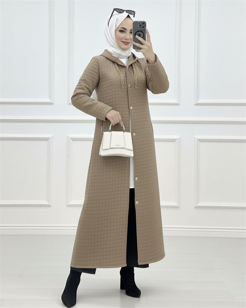 Yakası Zincir Detaylı Uzun Kapitone Kaban -Vizon (197-1314-R23)