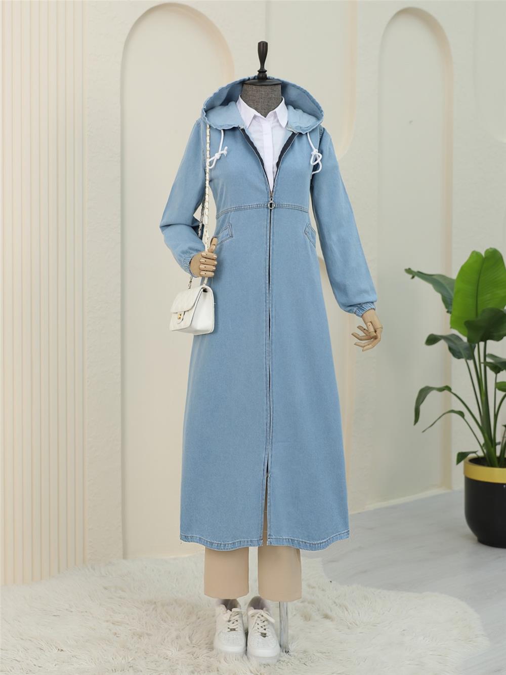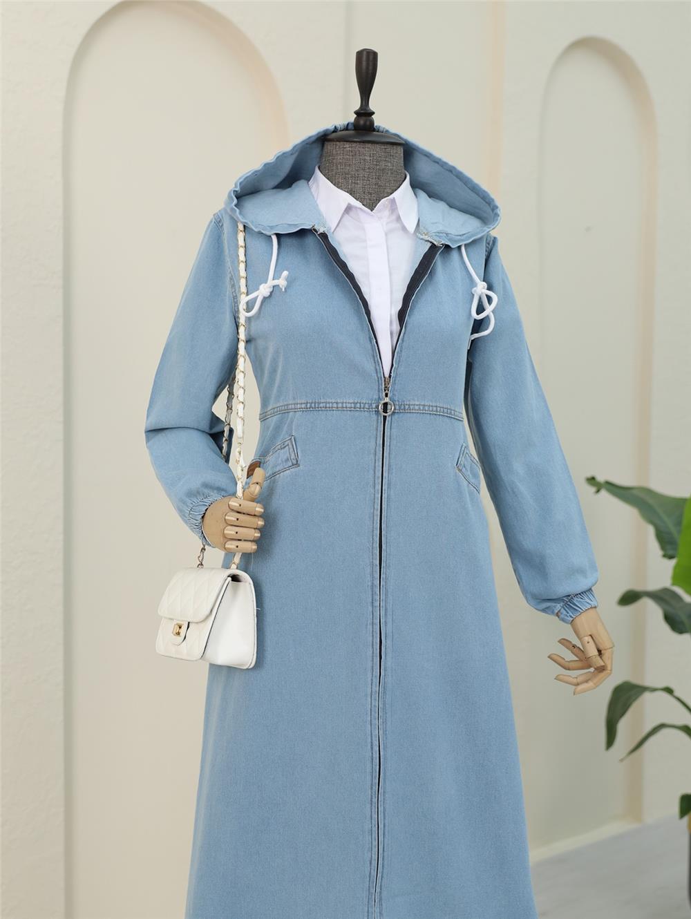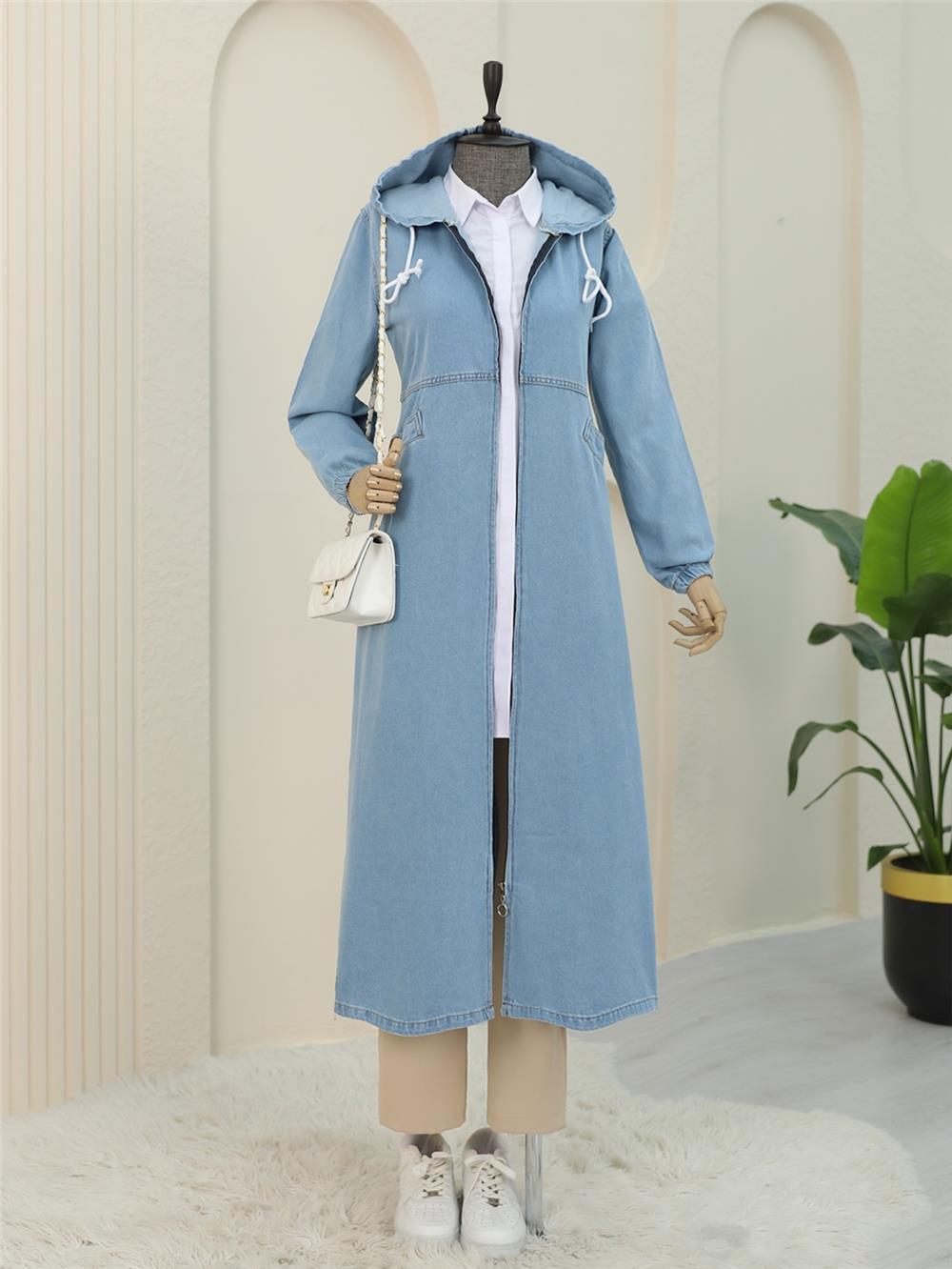 Yan Cepli Kolu Lastikli Kapşonlu Kot Kap -Açık Mavi (197-7805-R25)