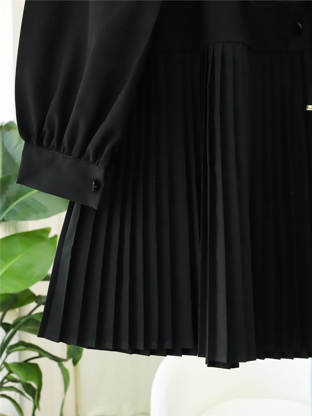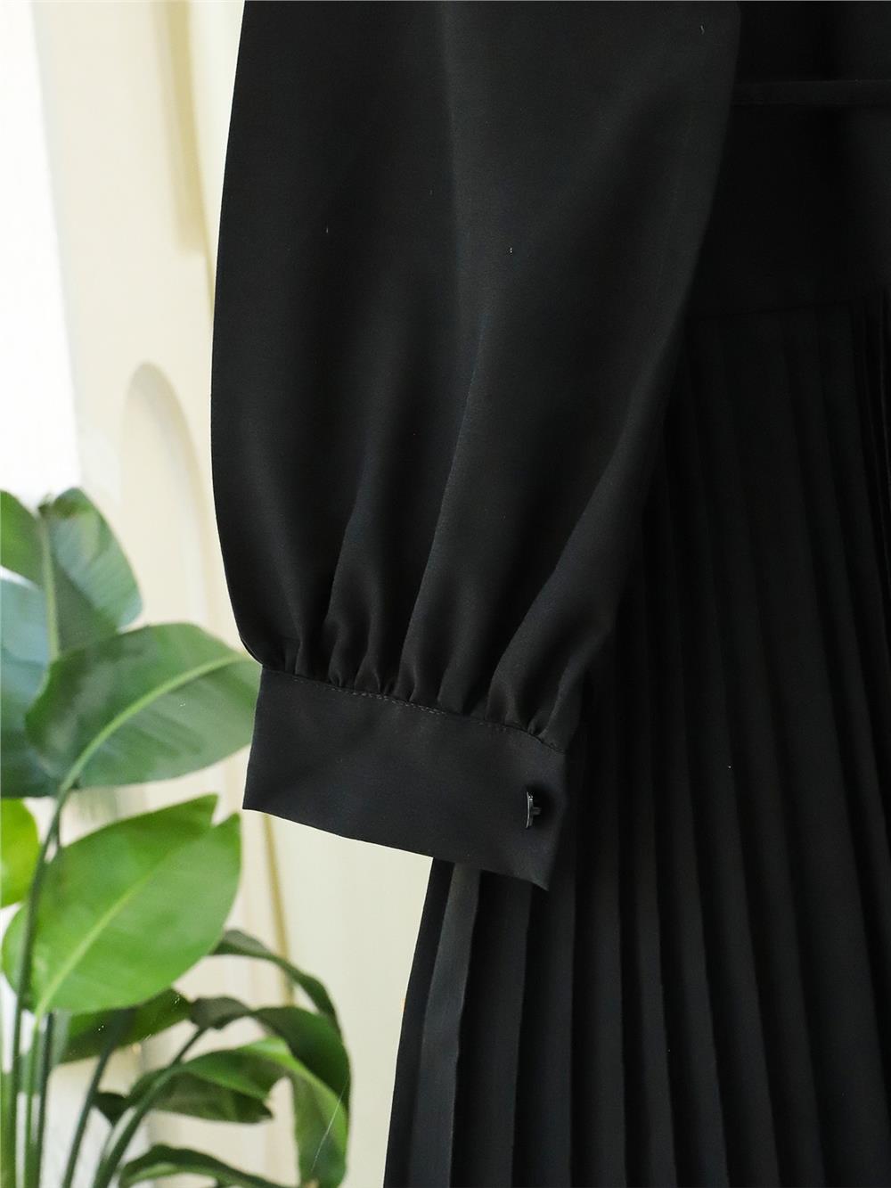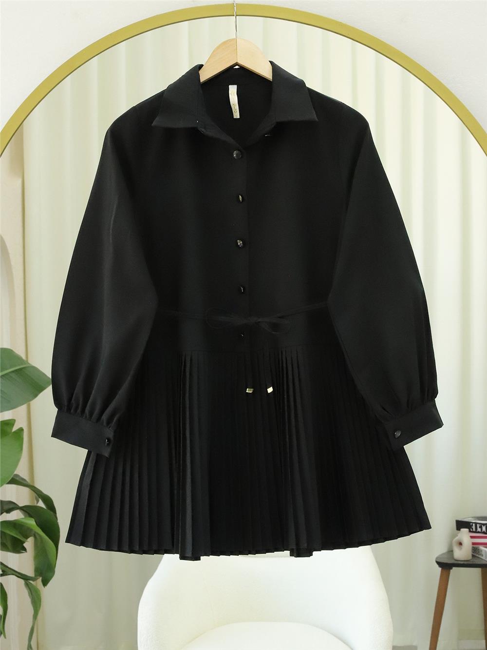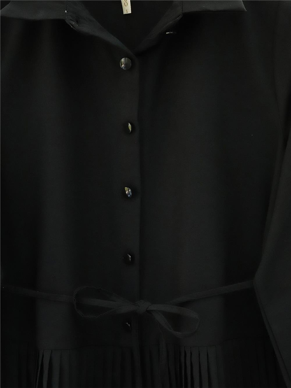 Yarım Düğmeli Beli Bağlamalı Piliseli Gömlek -Siyah (398-1034-R01)