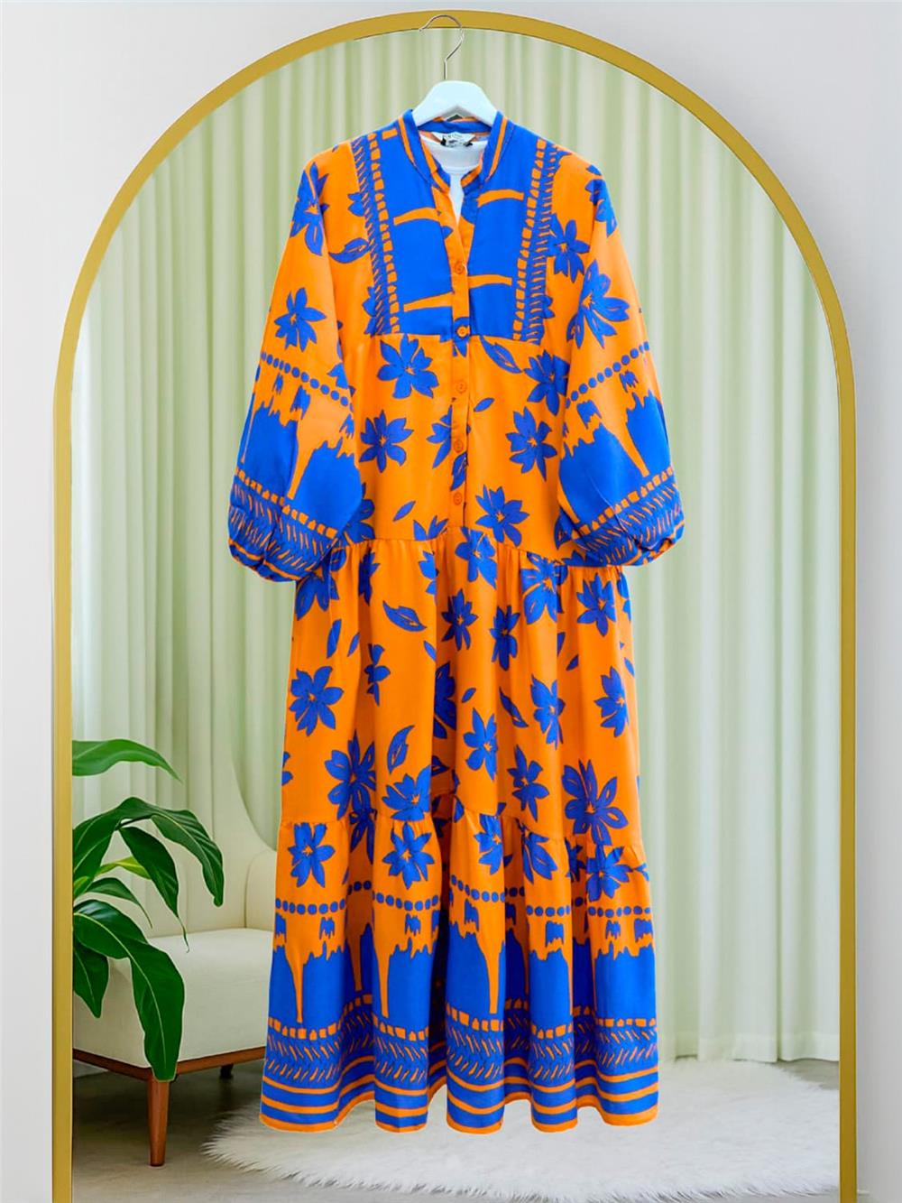 فستان منقوش نصف أزرار وأكمام مطاطية - برتقالي (199-0606-R16)